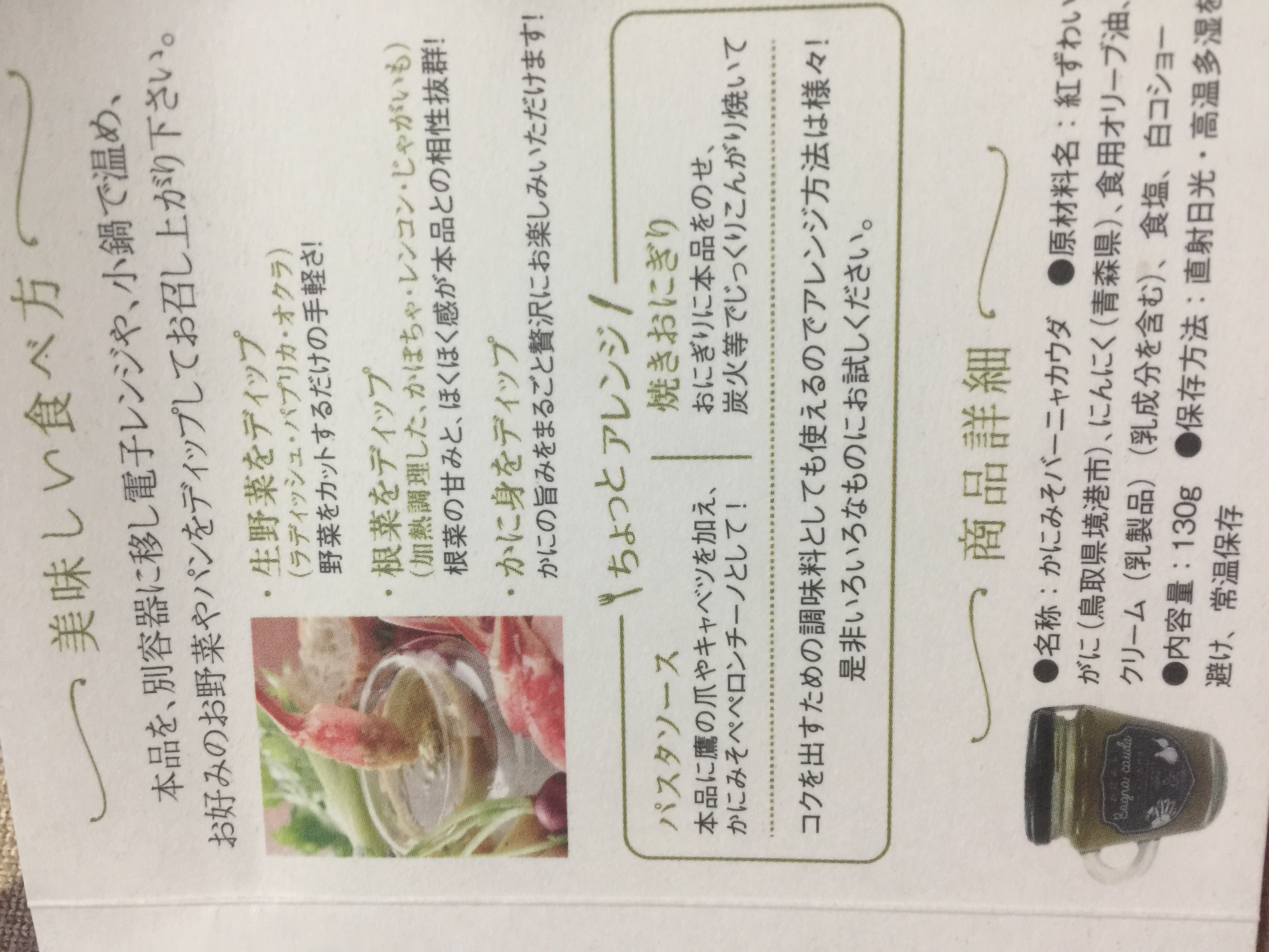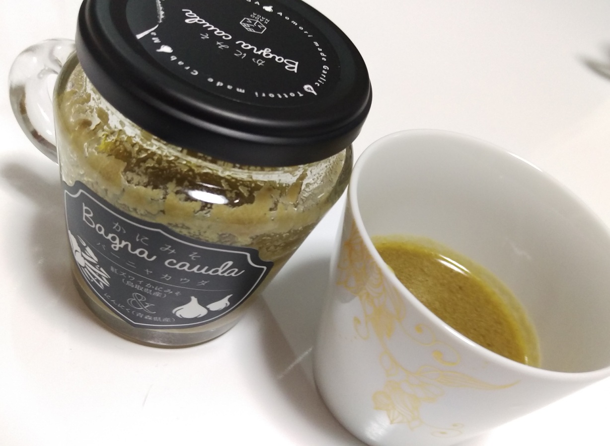 早速瓶を開けてみると、かにみその匂いがとても強く食欲が湧いてきました。瓶に書いてある通りレンジで少し温めて生野菜をつけて食べました。塩加減もちょうど良く、かにみその味がとてもしっかりしているので、お酒にも合う味だと思います。普通のバーニャカウダより味がしっかりしていて、クセになる味です。かにみそをそのまま食べてるかのようなコクのある味です。1つの瓶でも量はしっかり入っているので、家族で食べるには2、3回分くらいあり満足できる量です。夫もとても美味しいと言って食べていたので、かにみそが好きな人には特にオススメの商品です。