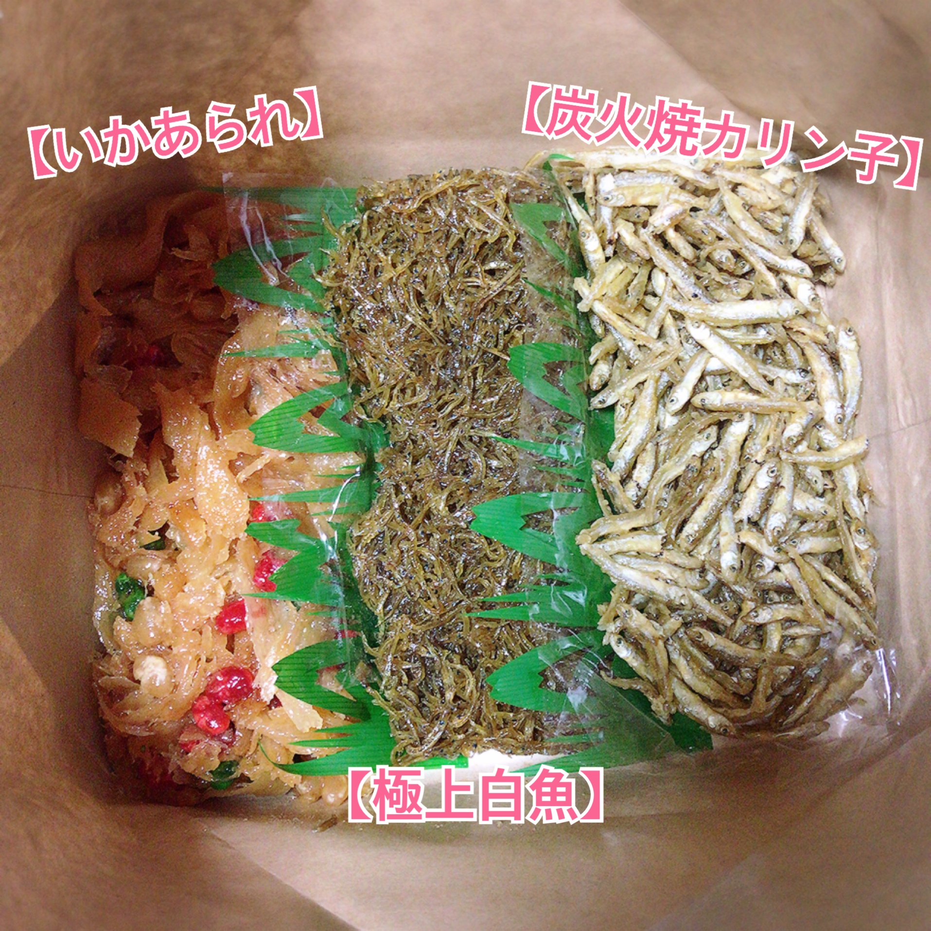 「炭火焼カリン子」は、秋田県八郎湖産のわかさぎを油でカリッと揚げ、タレに絡ませました。サクサクした新食感の佃煮です。「極上白魚」は、国内産の上質な小女子を伝統の生炊き製法で炊き上げました。厳選したちりめんサイズの細かなお魚のみを使用し、柔らかくて口当たりも良く、上品な味わいです。「いかあられ」は、のしいかと三色の甘納豆を甘く炊き上げました。噛めば噛むほどおいしさが広がる、昔なつかしい一品です。