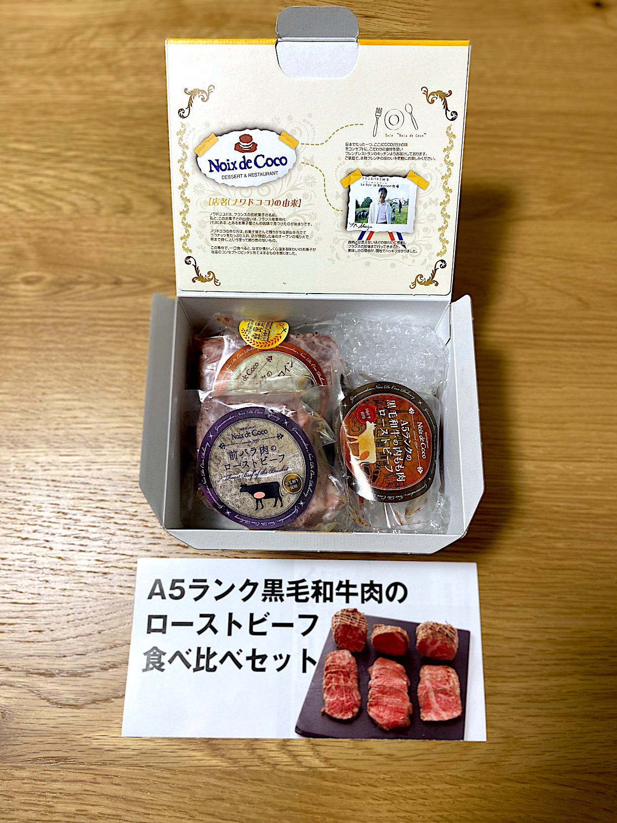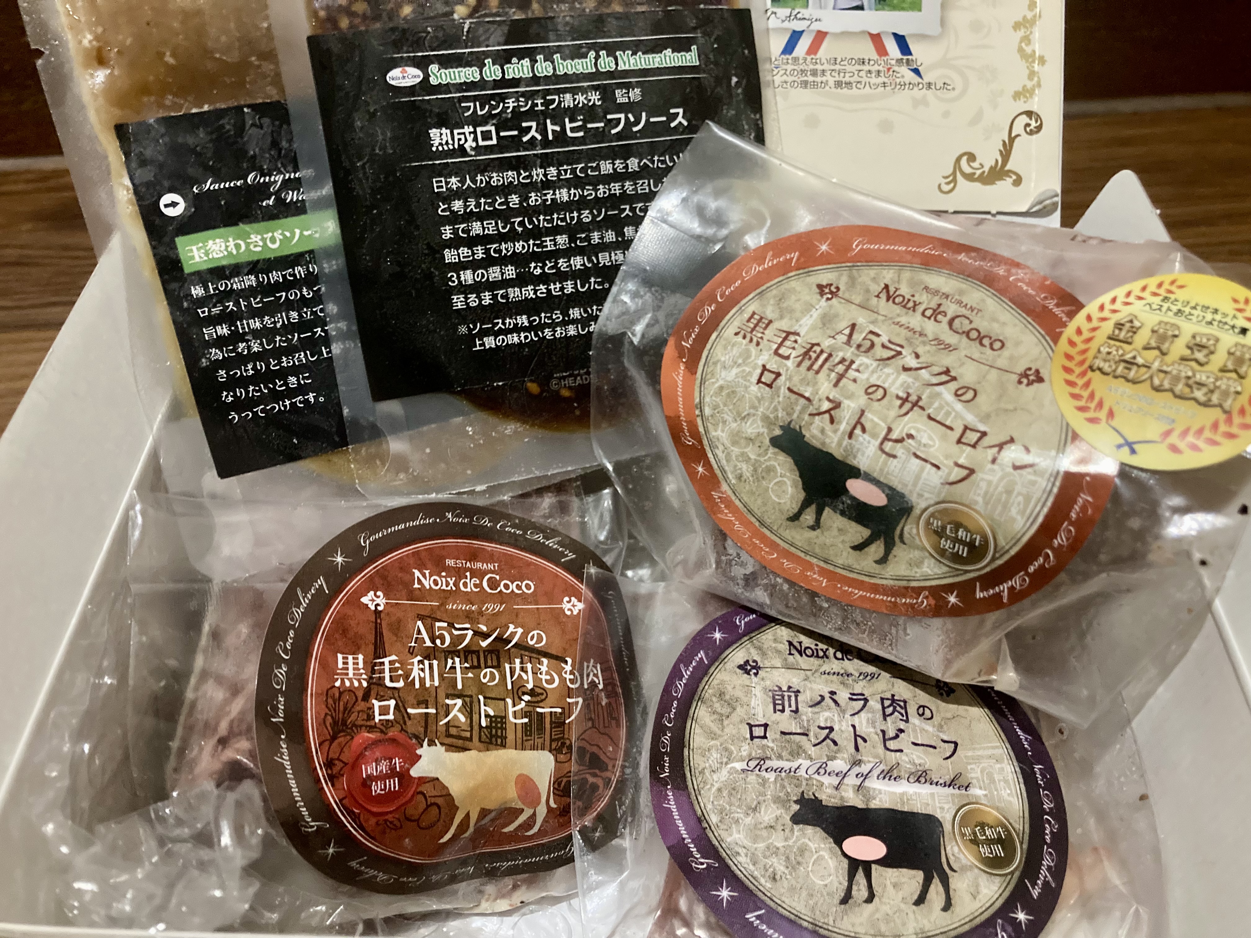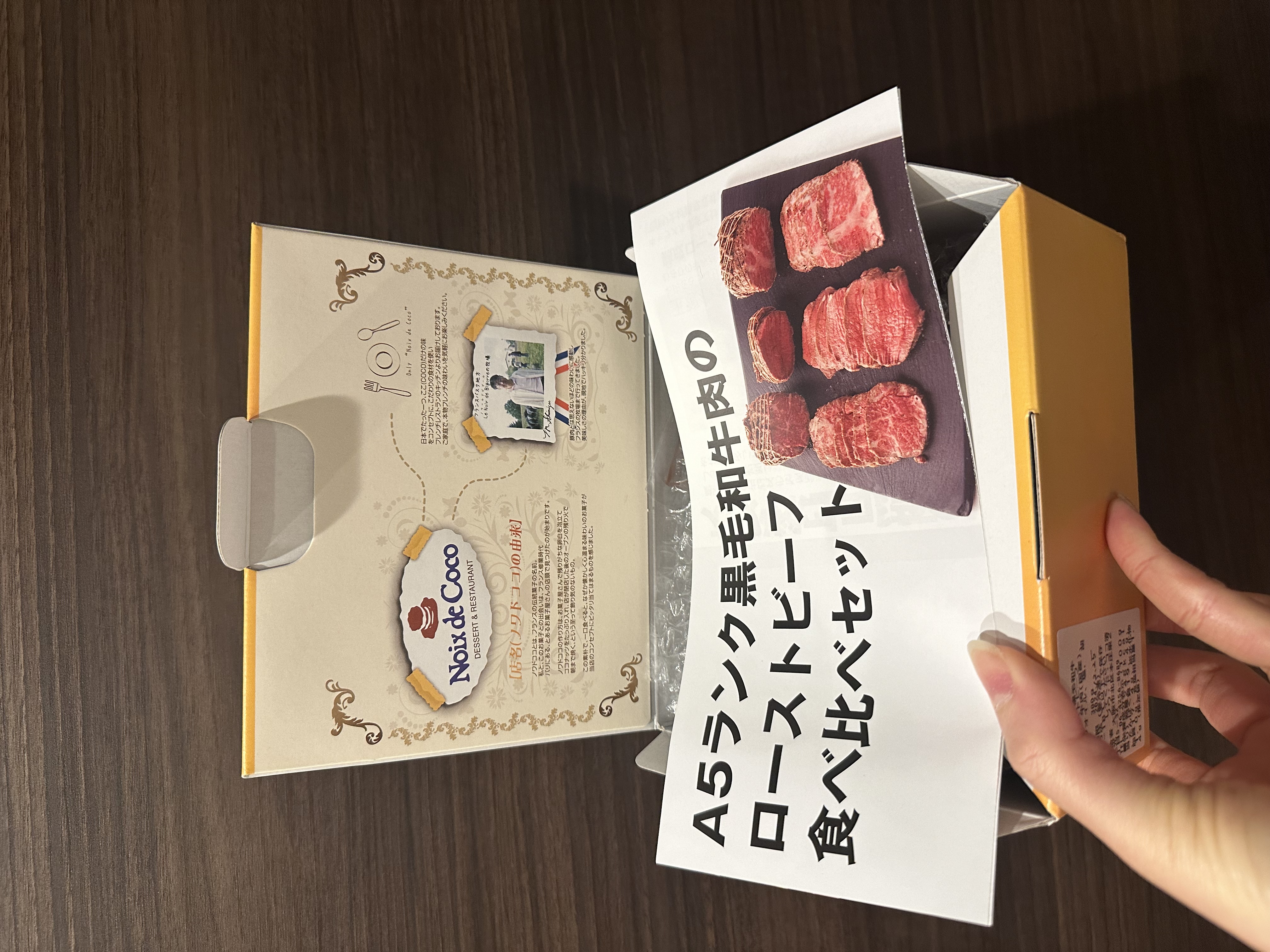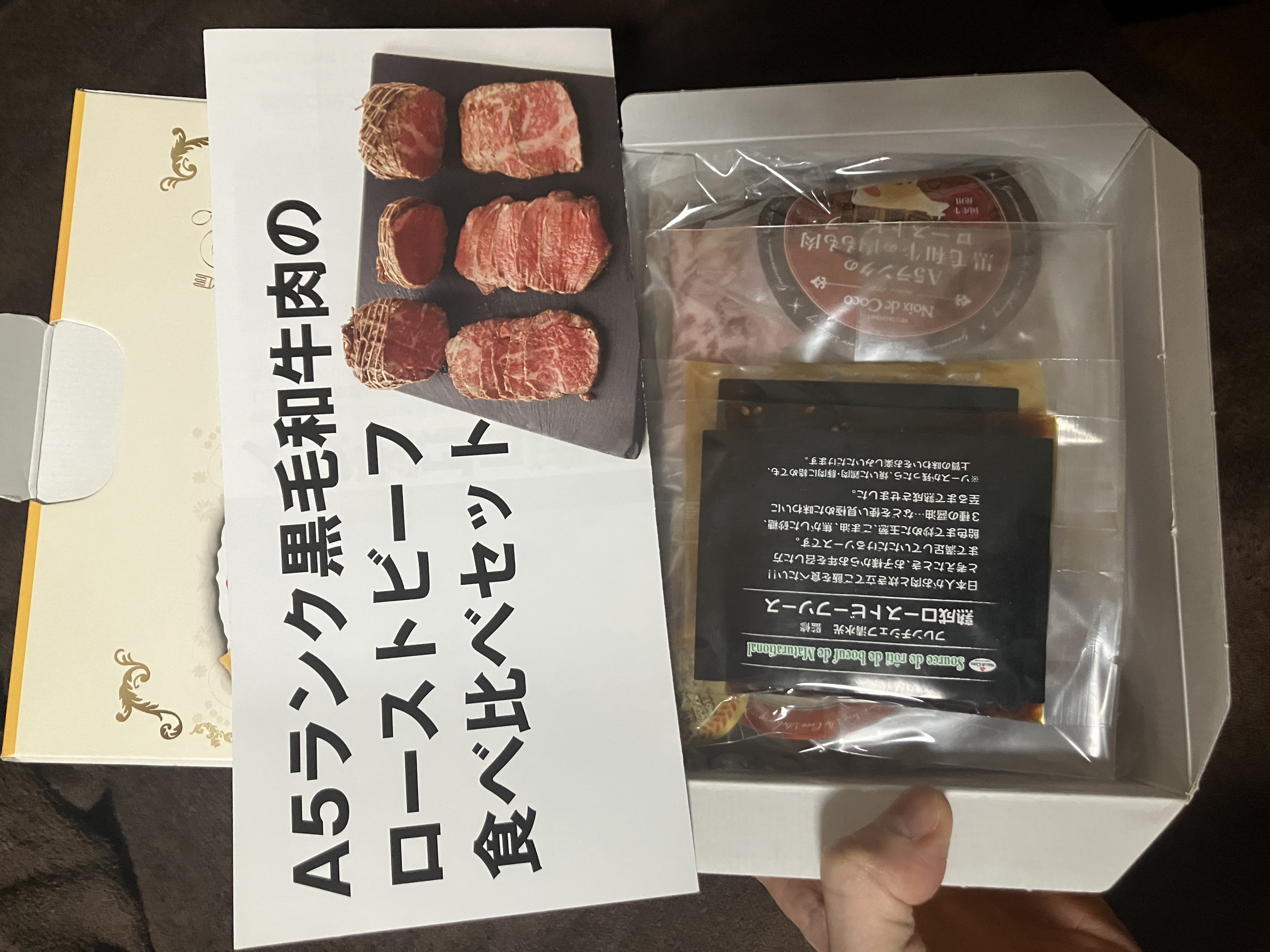 箱を開けると3種類のローストビーフ、2種類のソース、リーフレットが入っています。