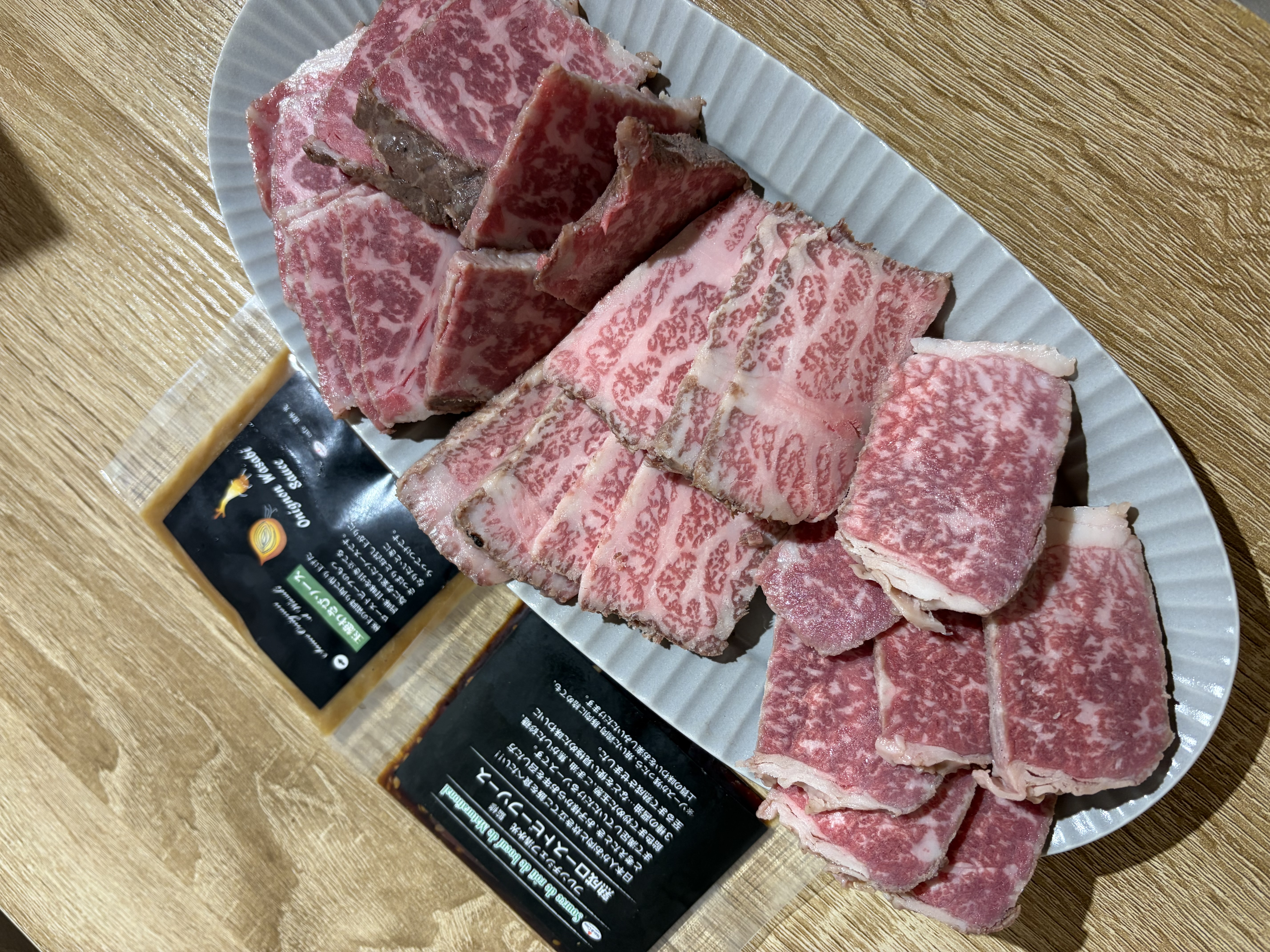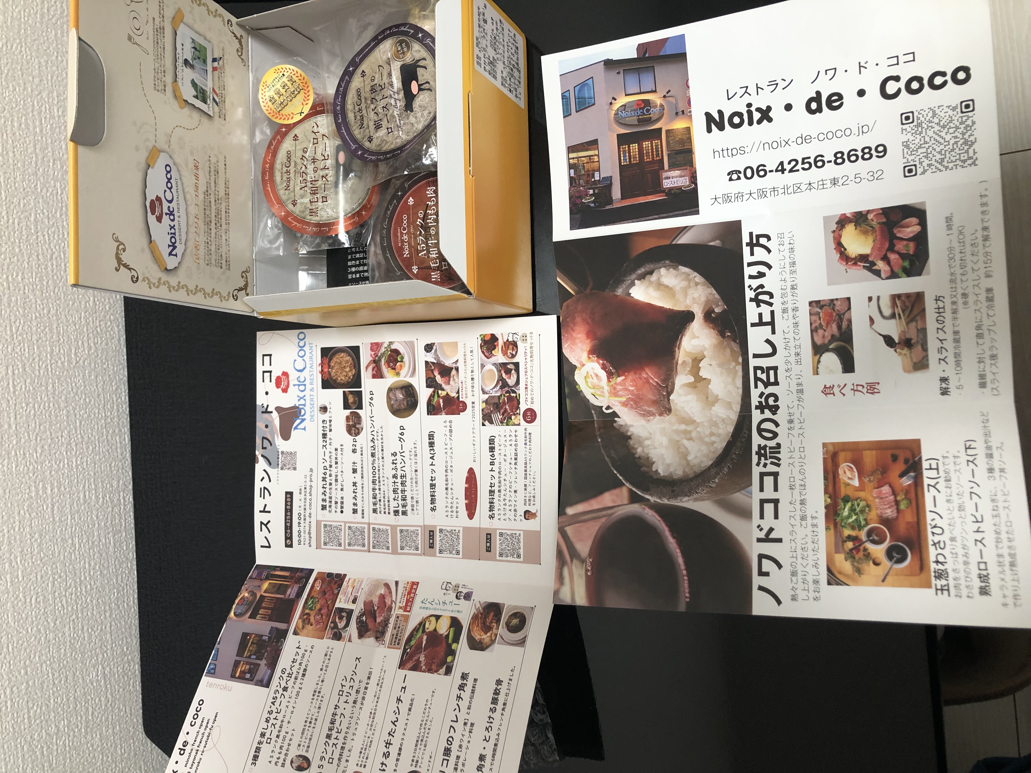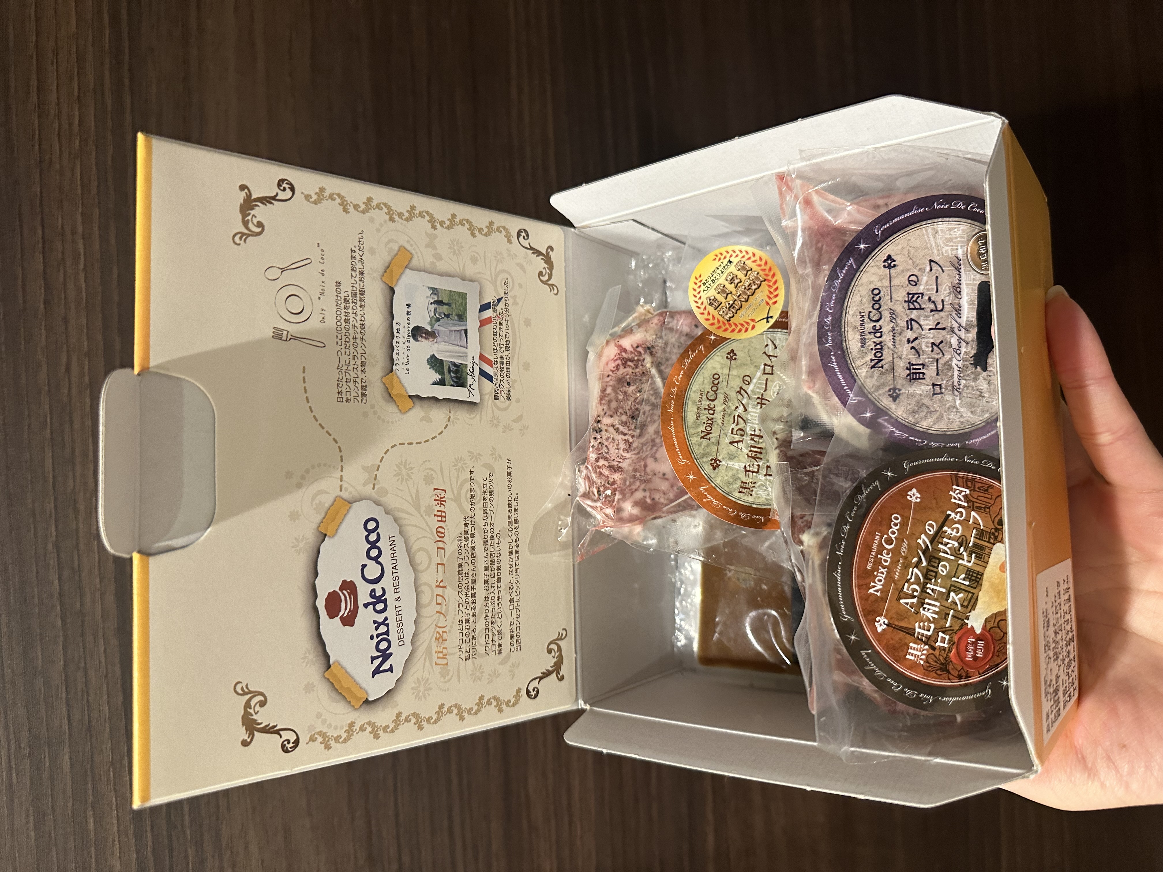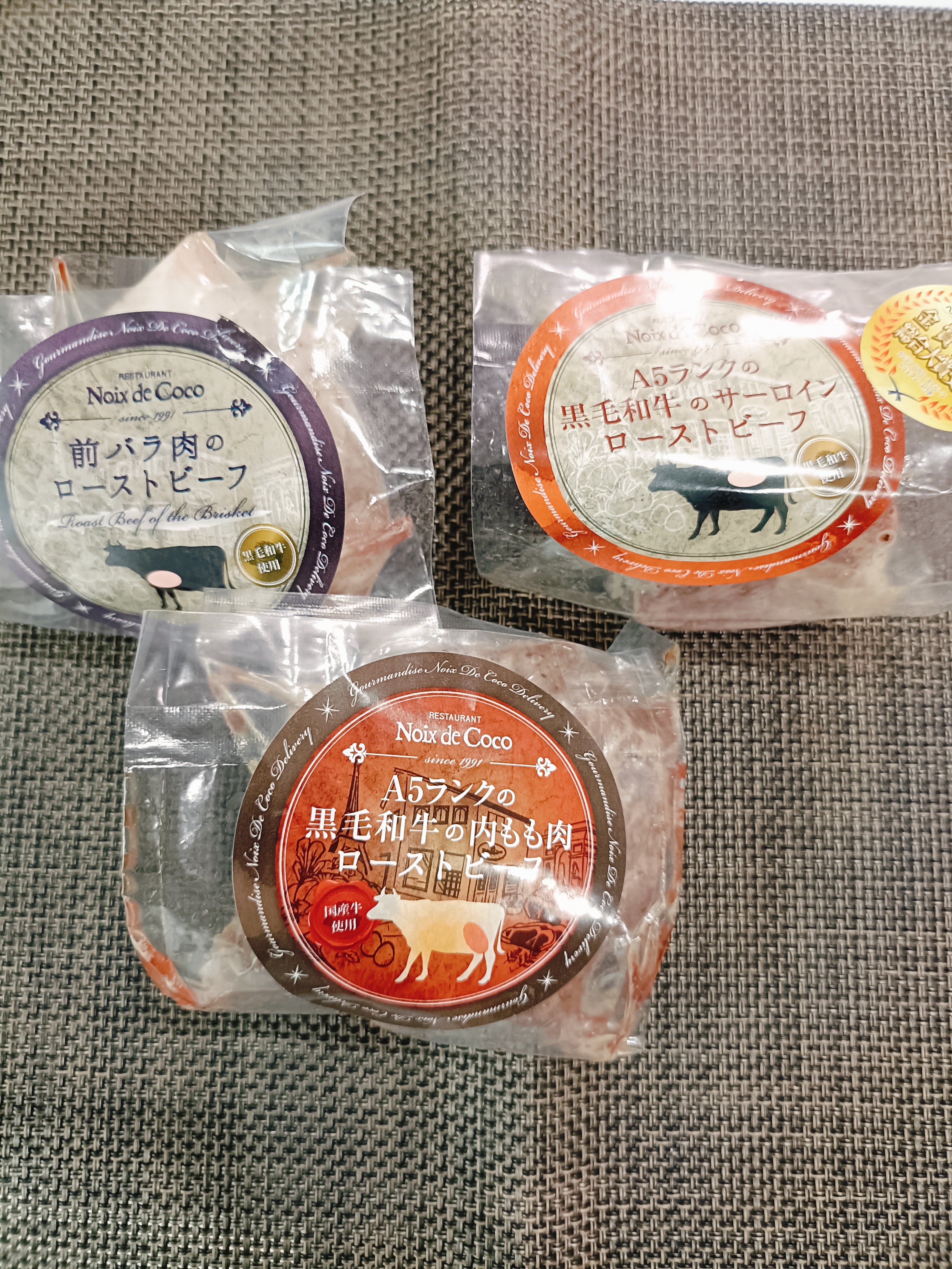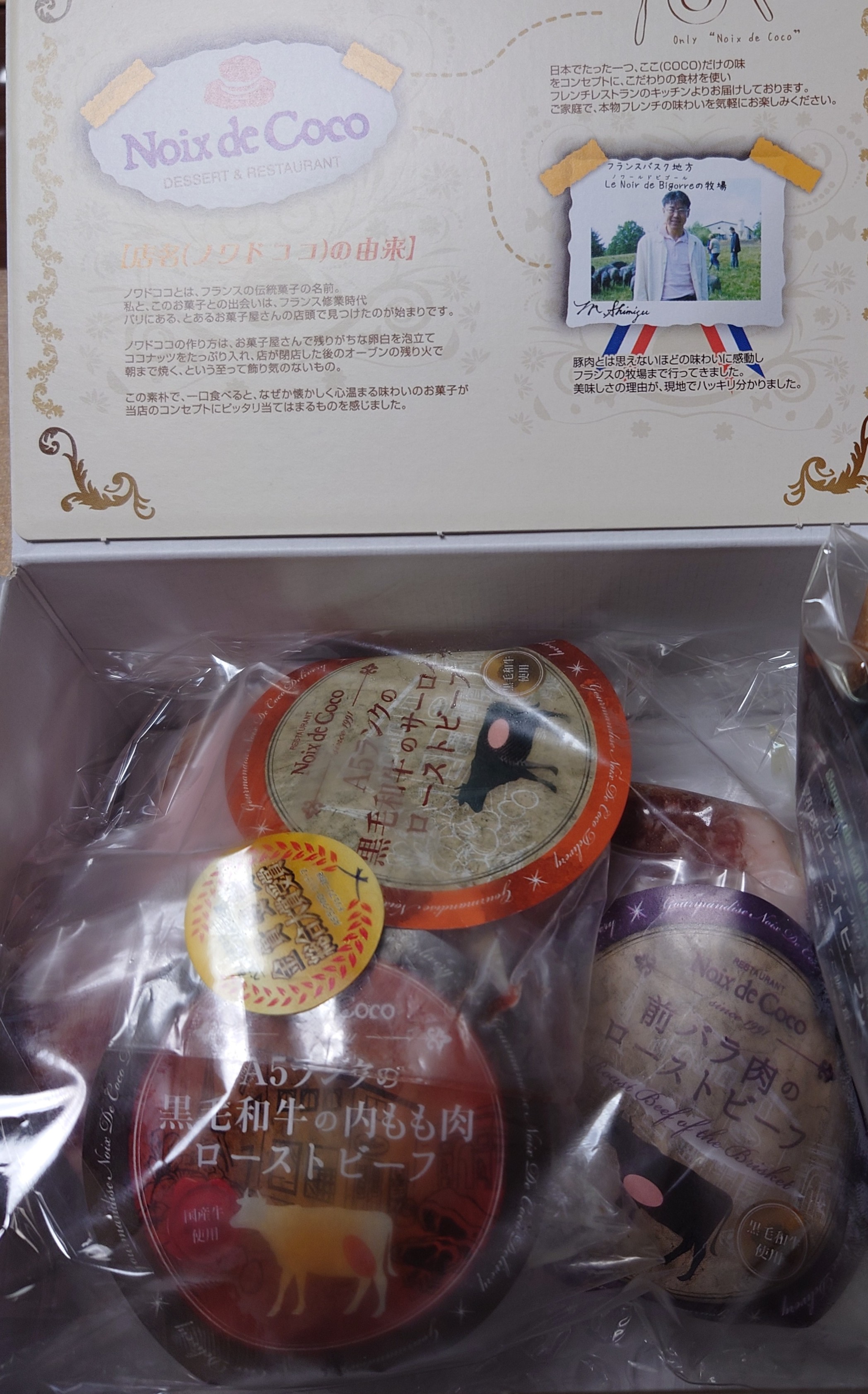 箱を開けると3種類のローストビーフ、2種類のソース、リーフレットが入っています。
