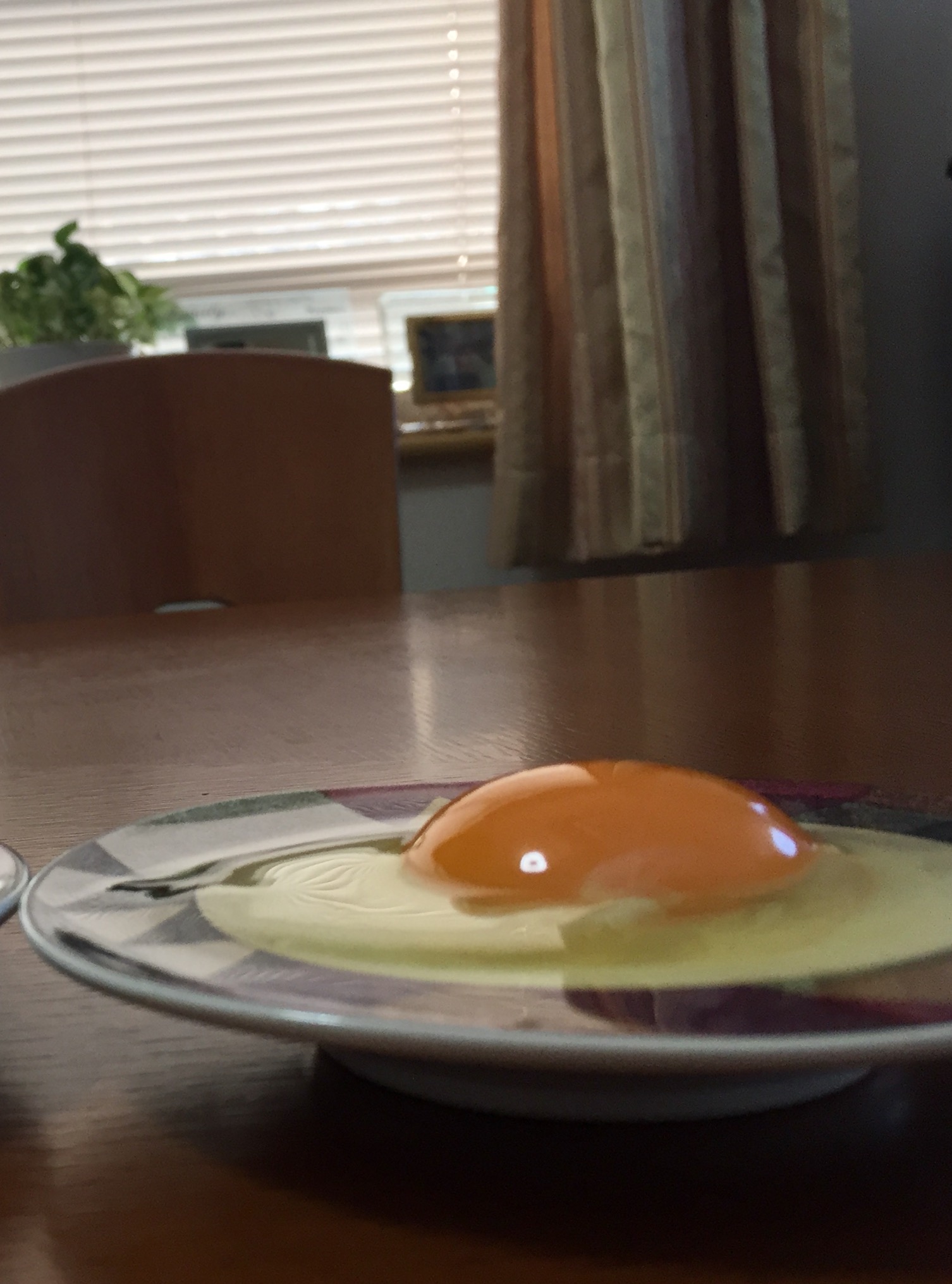 まずは卵かけご飯でいただいてみます。卵を割ると黄身も白身も盛り上がっています。黄身の色も黄金色です。新鮮な卵の証拠ですね。