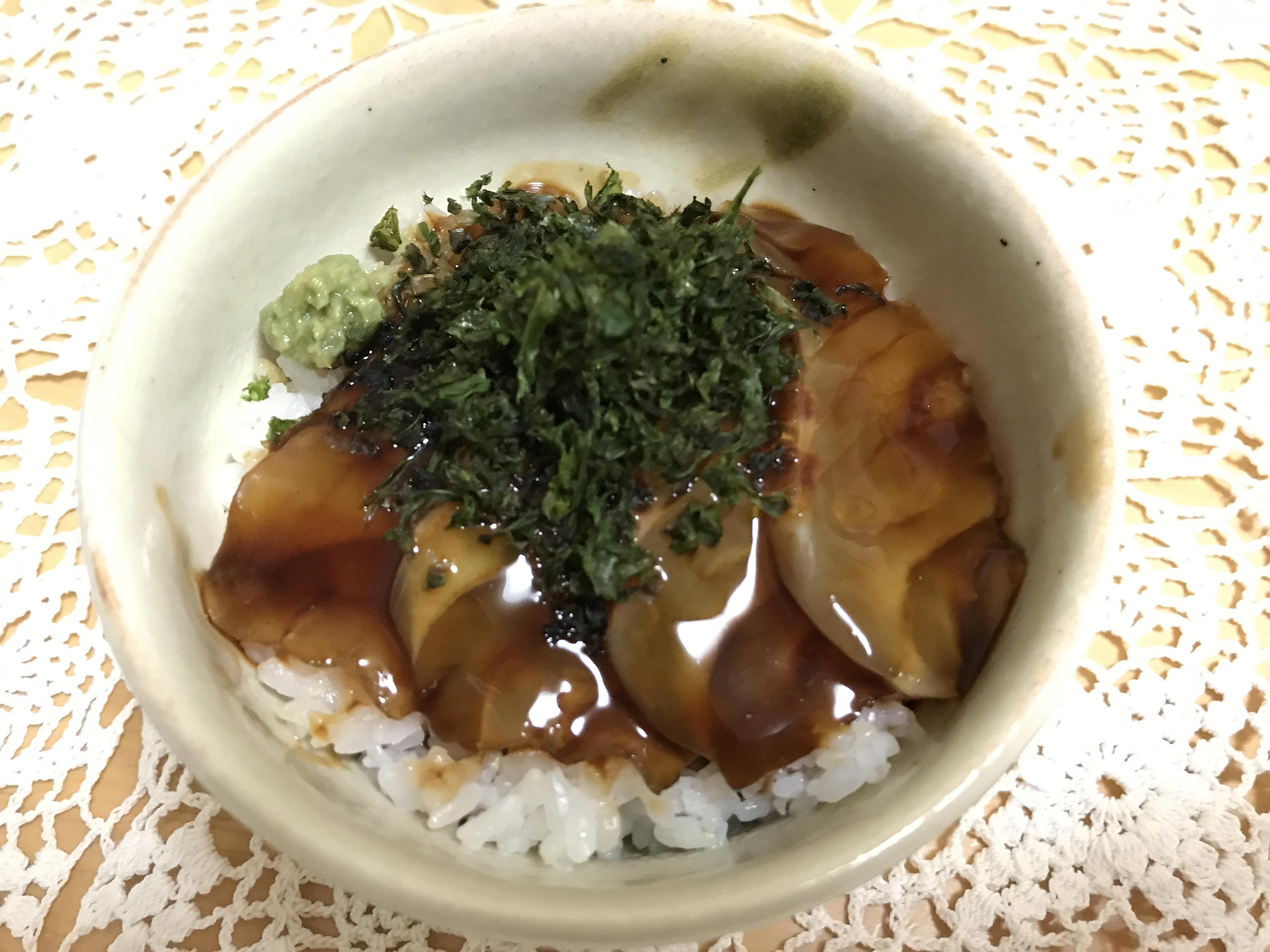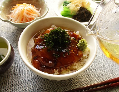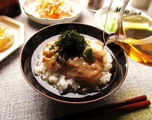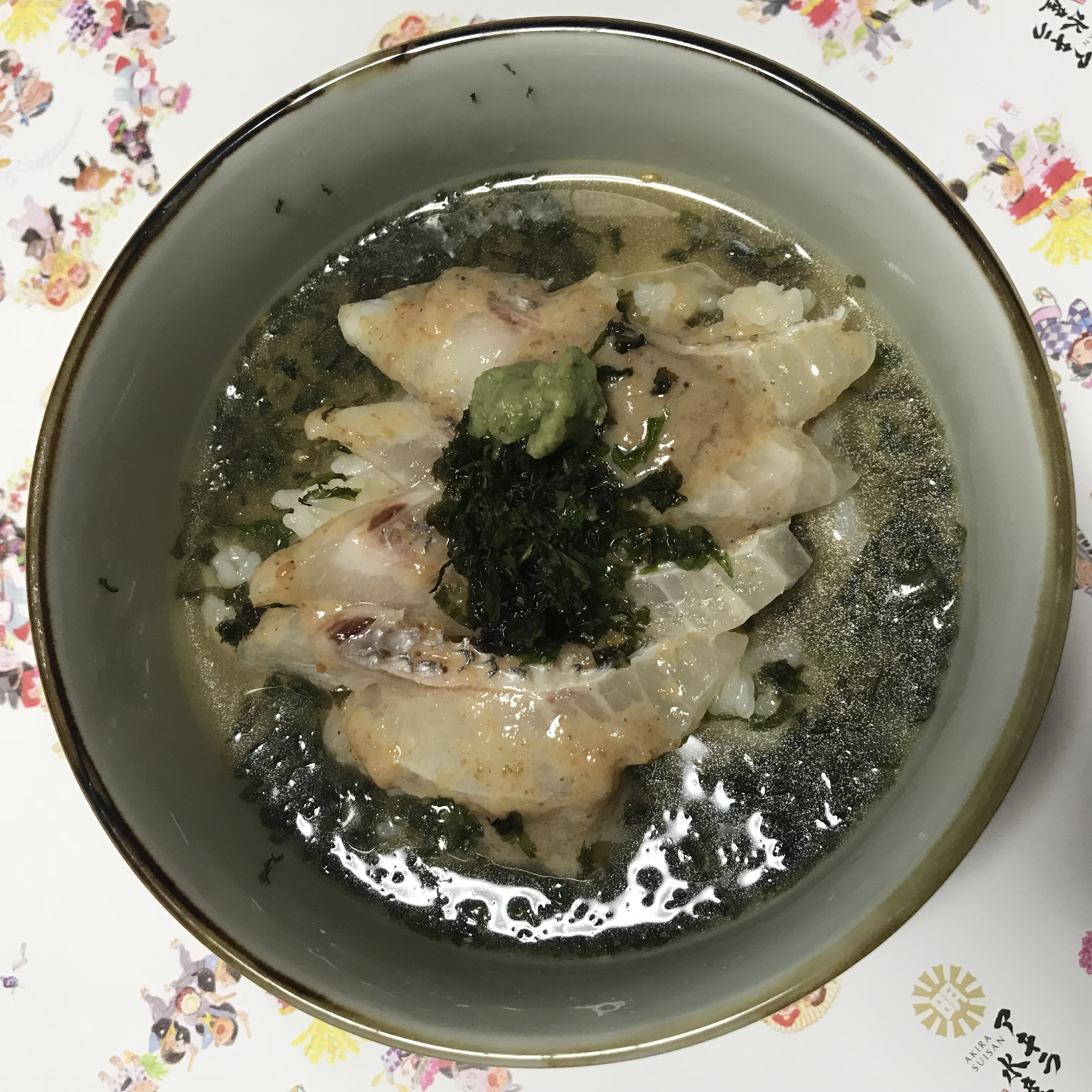その切り身を醤油だれ・ごまだれの2種類でお好みに絡めた後、ご飯にのせて熱々のだし汁をかけた後に、海苔、生わさびを乗せていただきます。