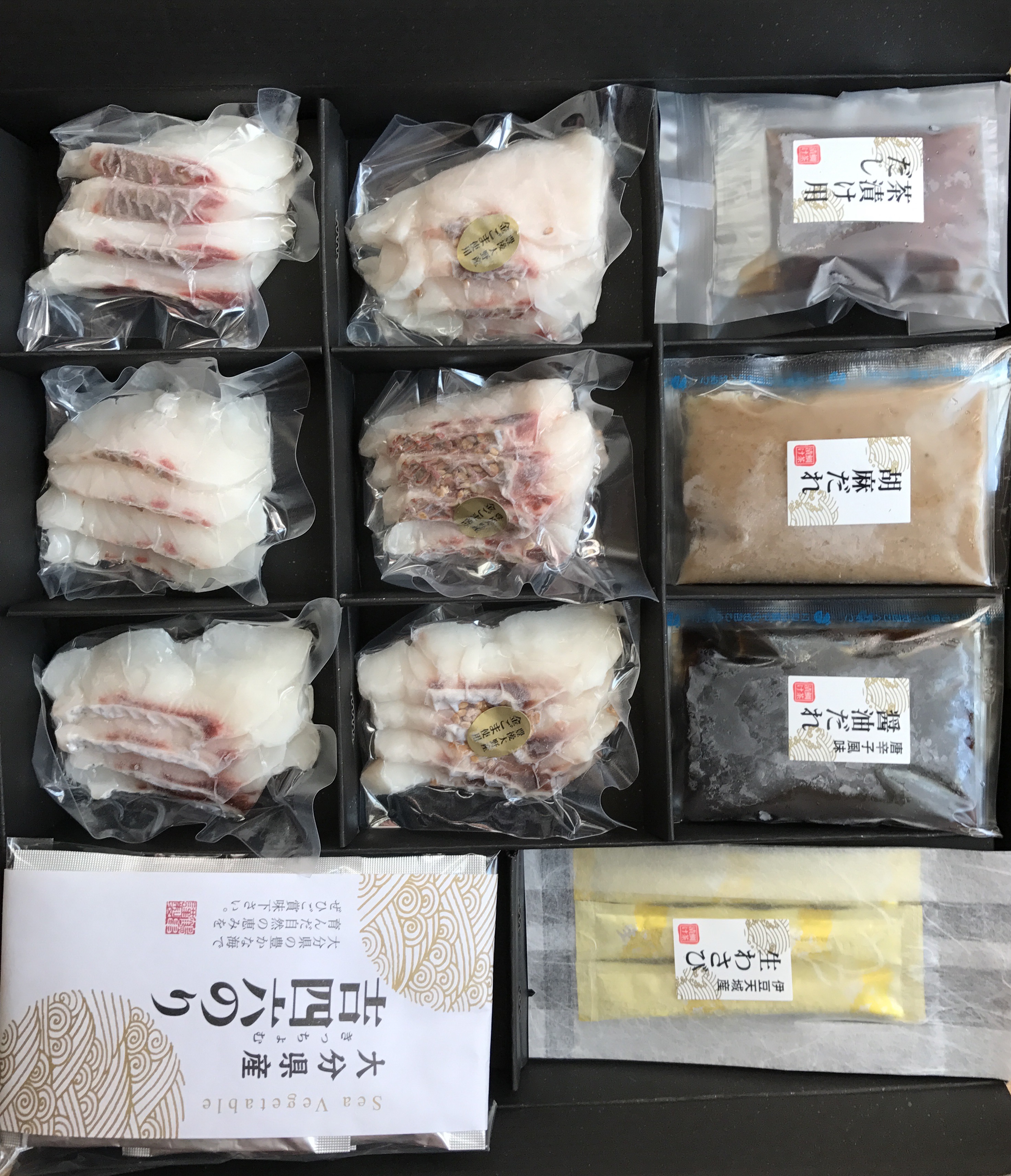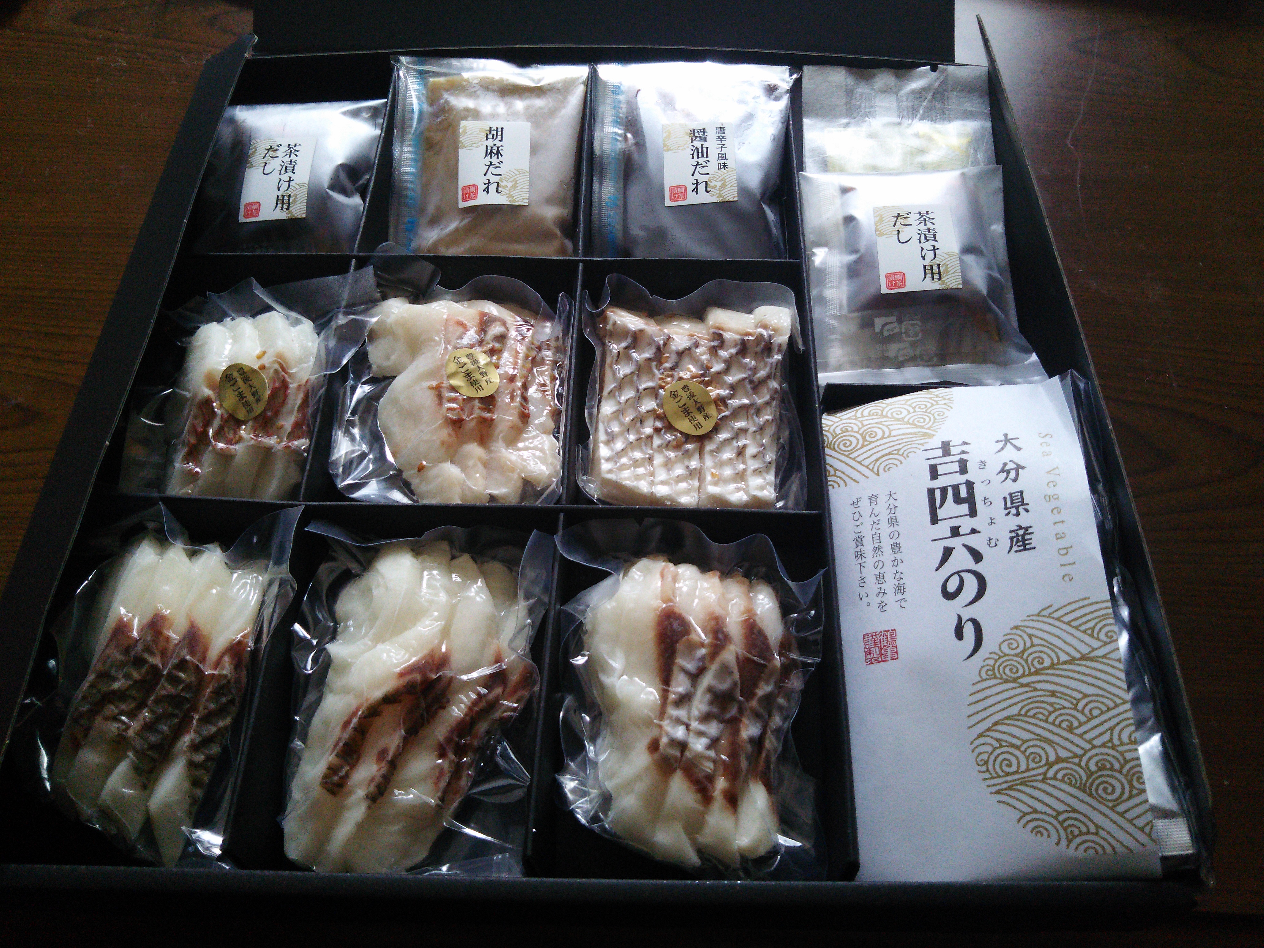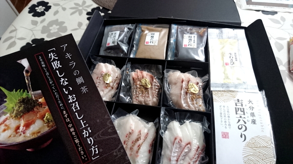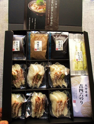福岡鮮魚市場No.1の仲卸が目利き、仕入れた天「然真鯛の鯛茶漬け」です。玄界灘で獲れた新鮮な天然真鯛は、ぷりっぷりの食感を味わえます。美味しさを引き立てるタレは、胡麻ダレ、唐辛子風味醤油ダレの2種。さらに、胡麻ダレは福岡の有名ホテルの元シェフがブレンドしたオリジナル、のりは風味が強い大分産吉四六のり、わさびは伊豆天城産本わさびなど、タレや薬味も鯛茶漬けの為に選んでいます。食べ方のリーフレットが入っているので、誰もが美味しくつくれます。化粧箱入なのでギフトにも最適です。