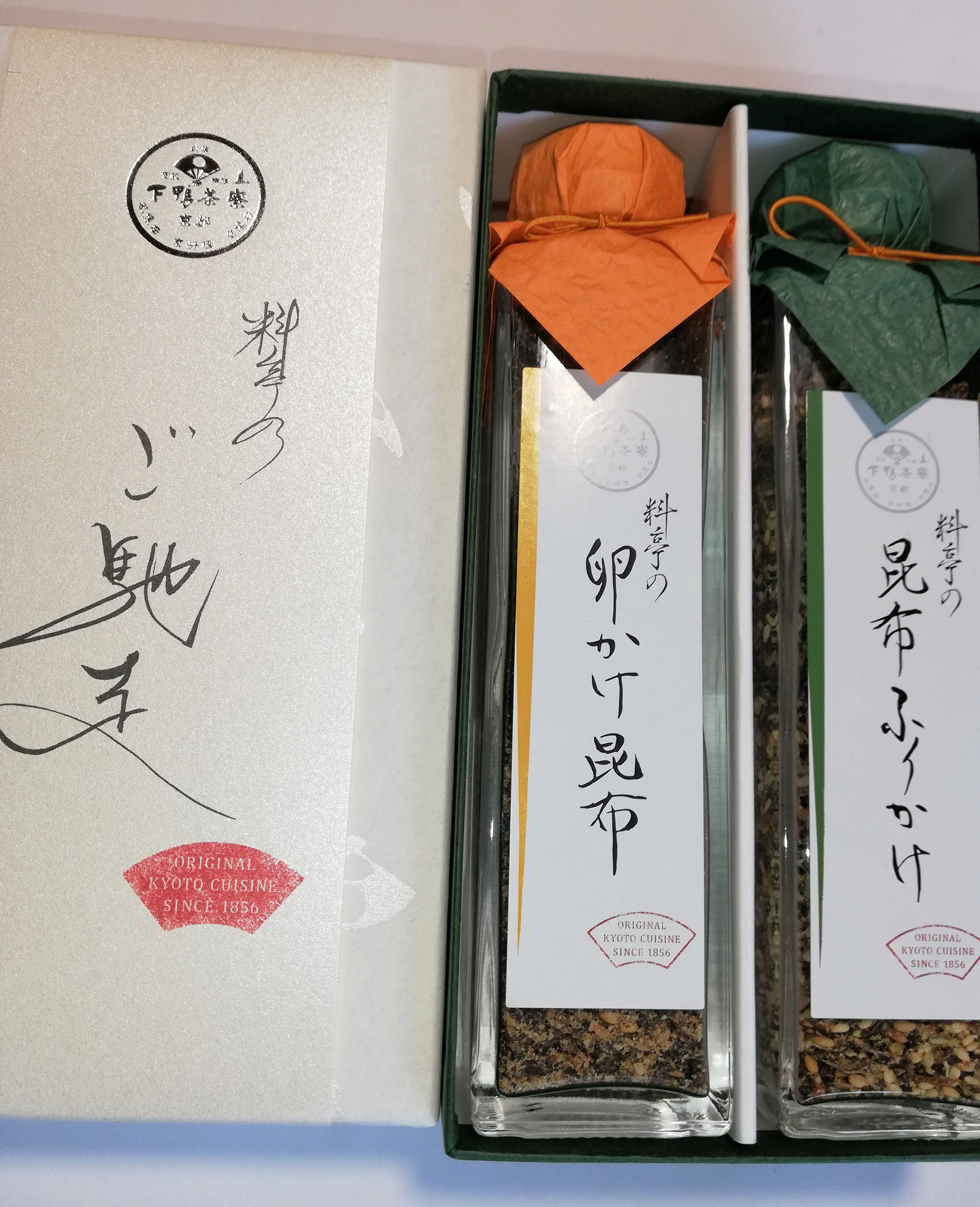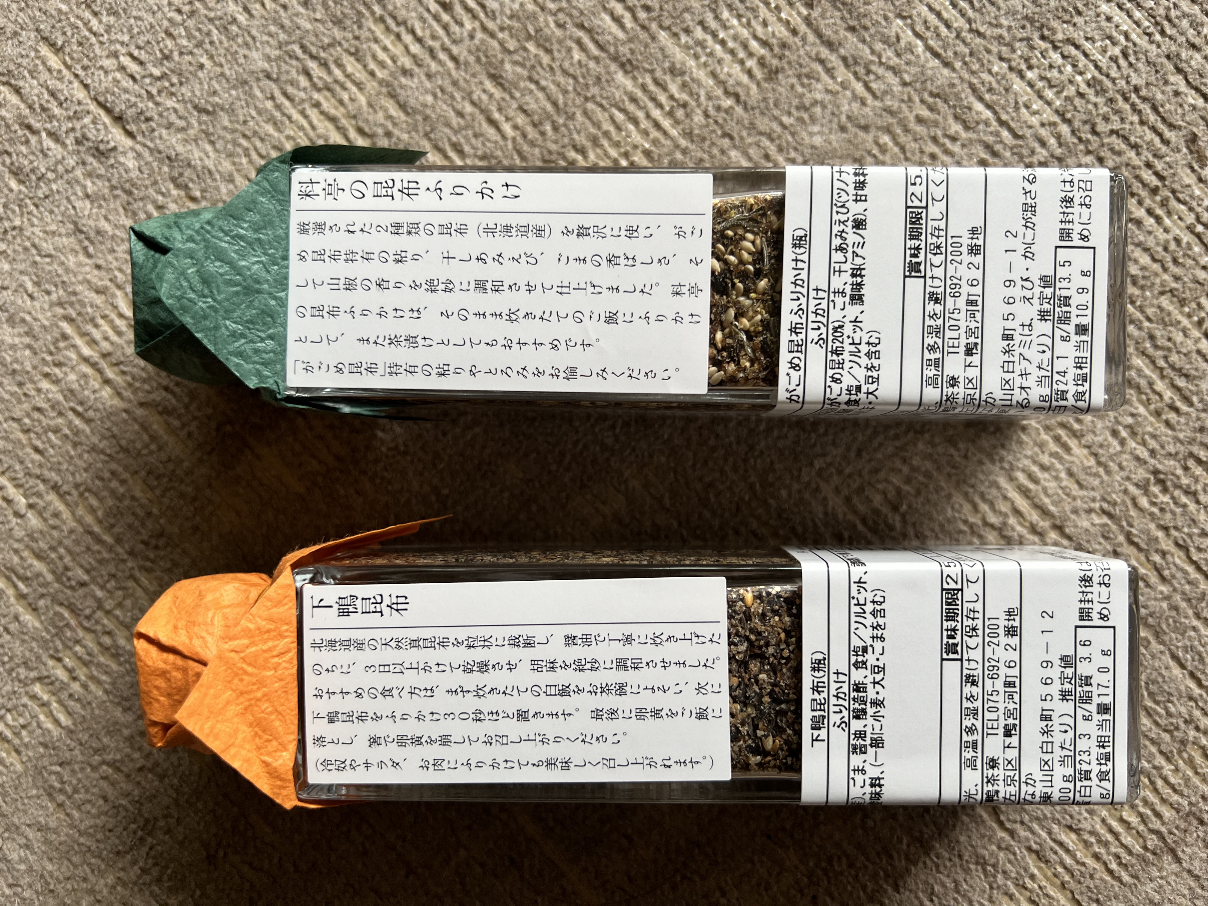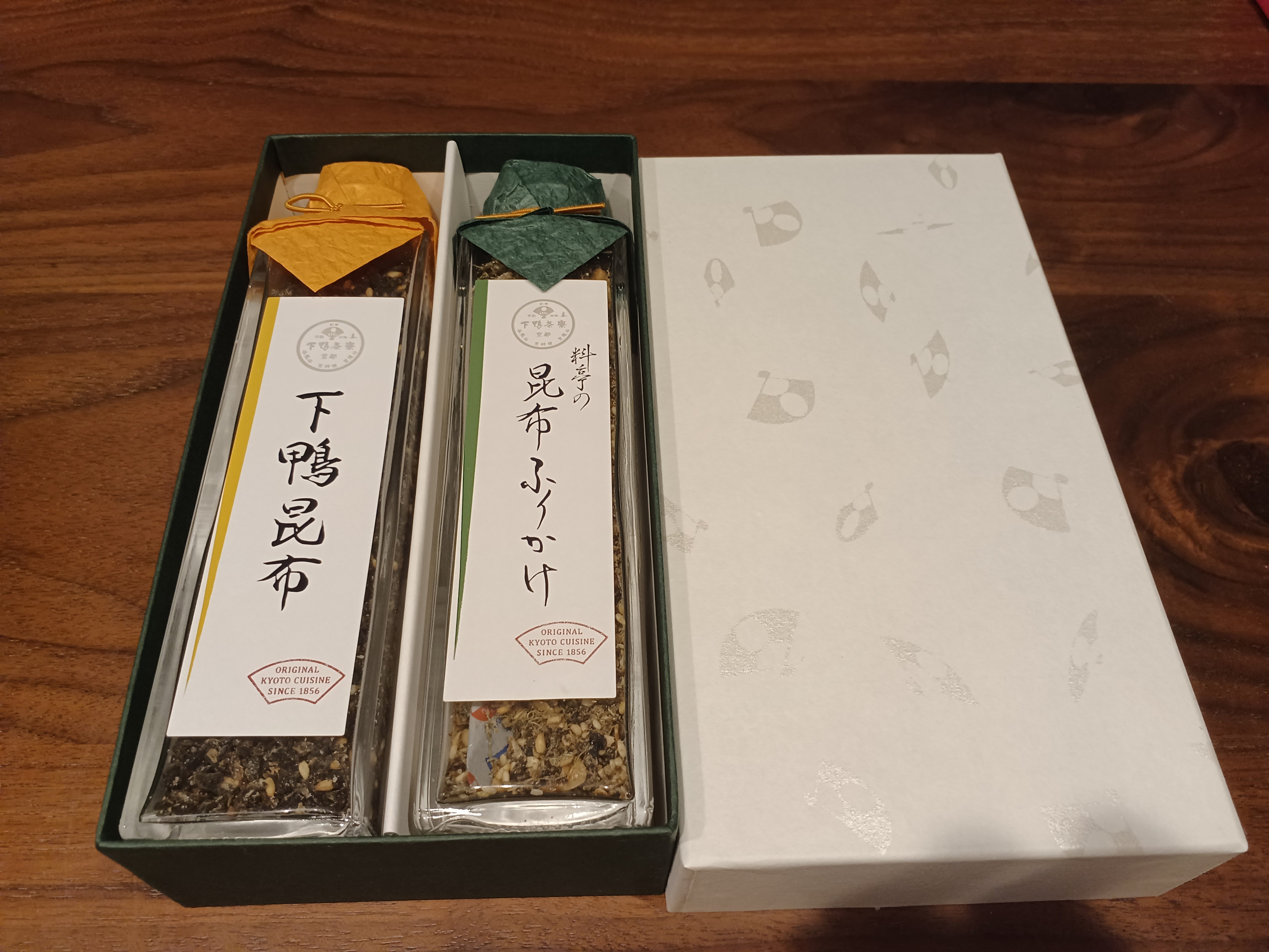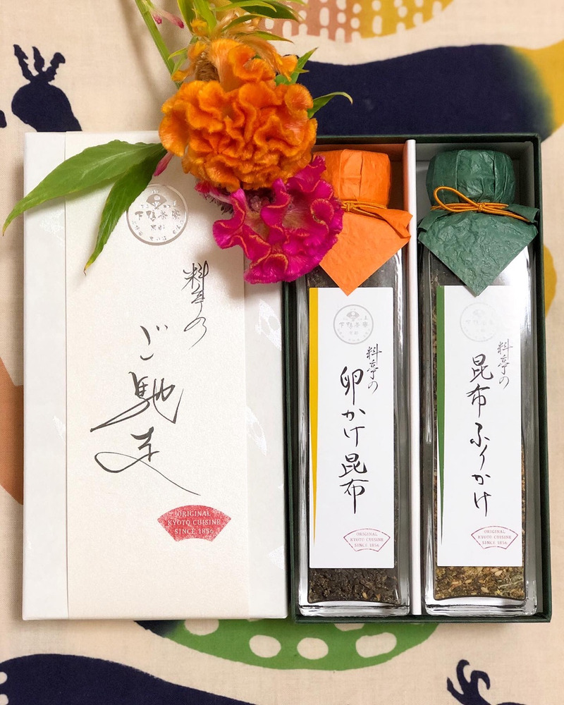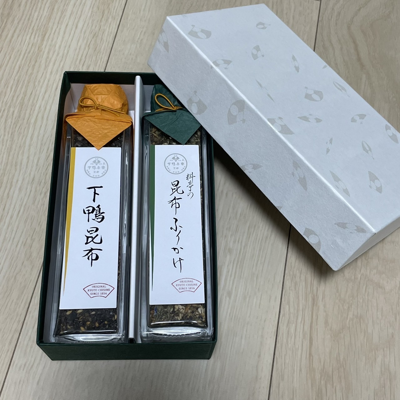 昆布の旨味を引き出したふりかけ「がごめ昆布ふりかけ」と「下鴨昆布」です。卵かけご飯と抜群の相性の「下鴨昆布」は、北海道産の真昆布を粒状に裁断し、醤油で炊き上げたのちに3日以上かけて乾燥させ仕上げています。「がごめ昆布ふりかけ」は、北海道産のがごめ昆布・塩昆布を贅沢に使い、ごまの香ばしさ、山椒の香りを絶妙に調和させています。異なる味わいのセットなので食べ比べが楽しめます。化粧箱に入って届くので、贈り物にもおすすめです。