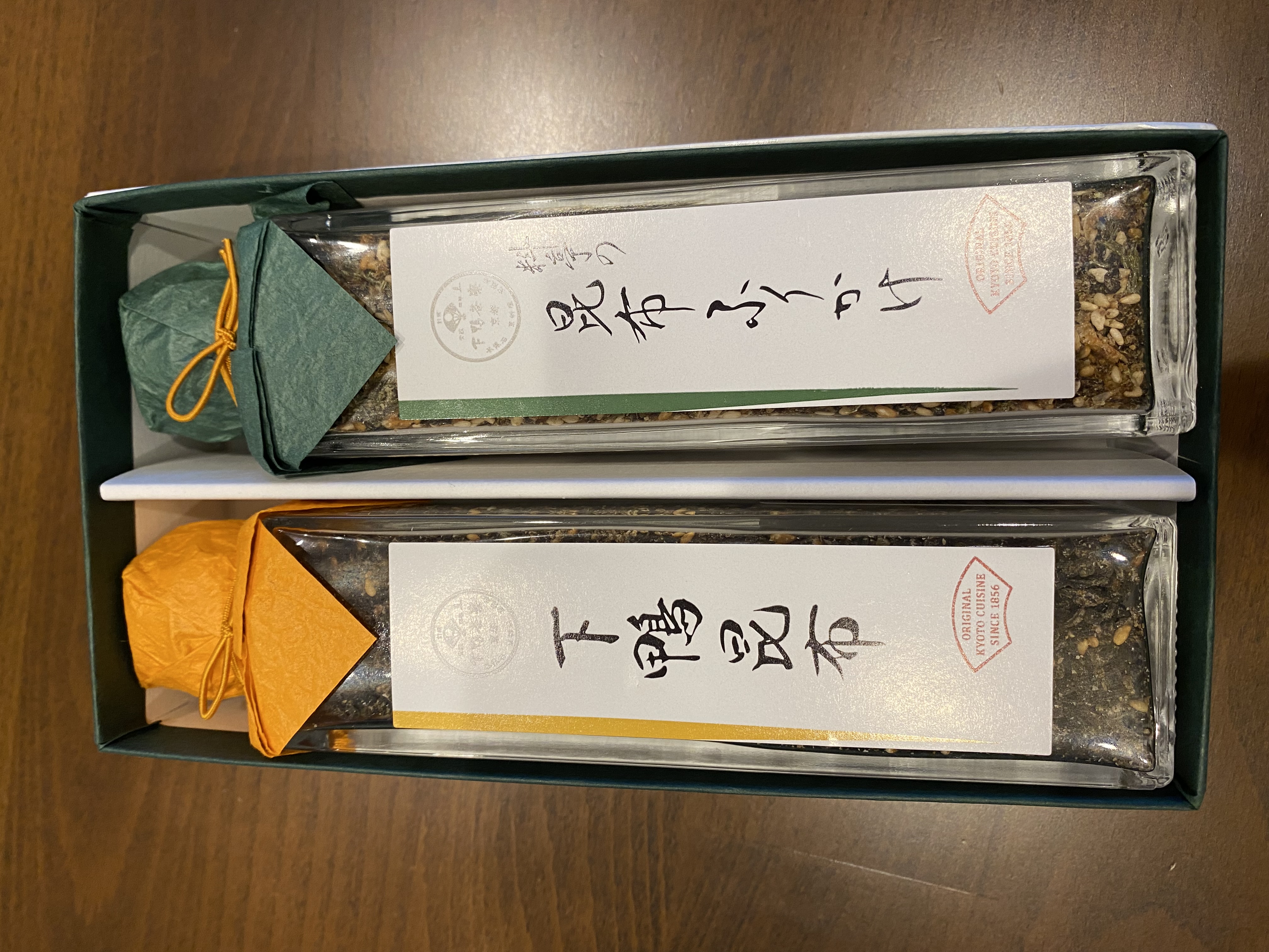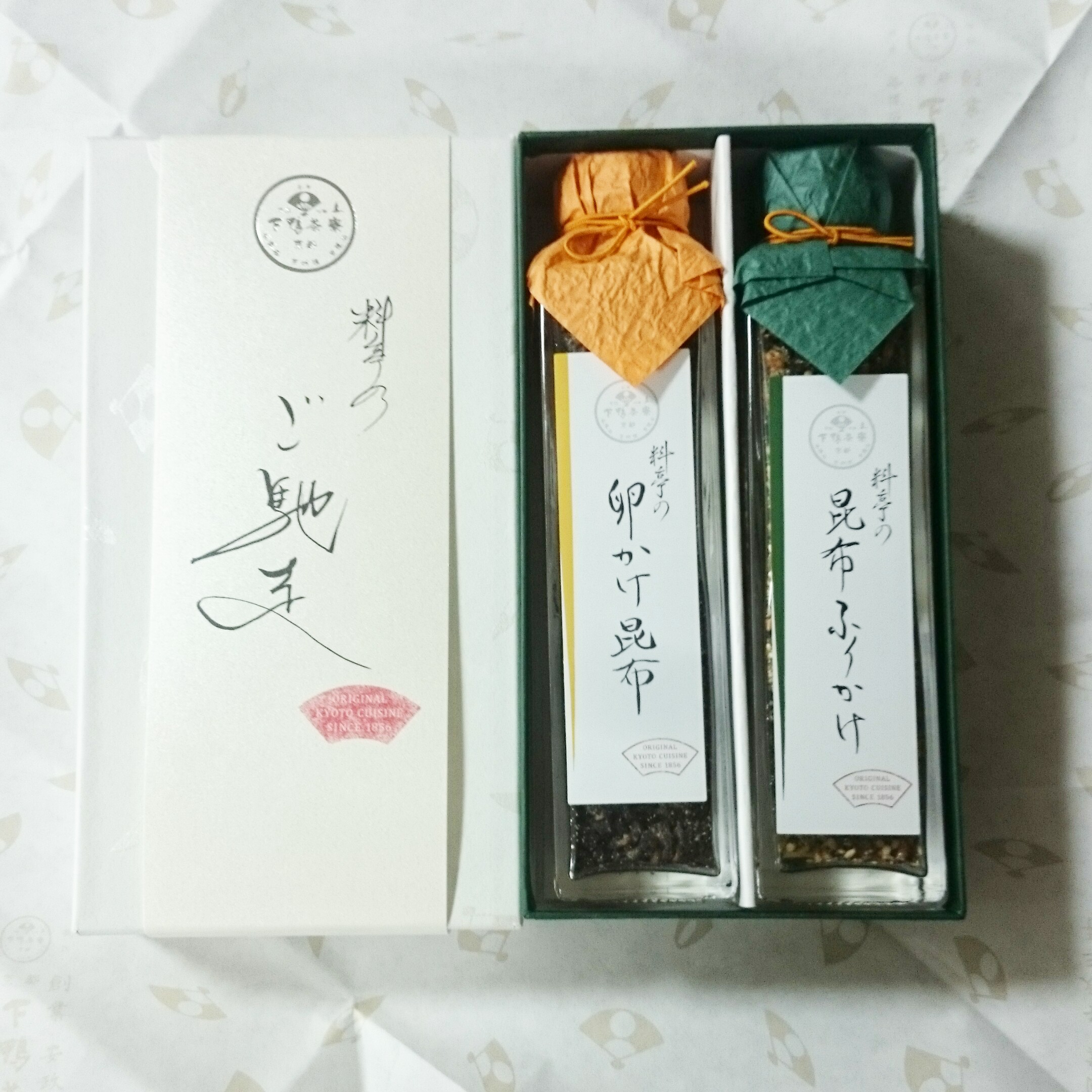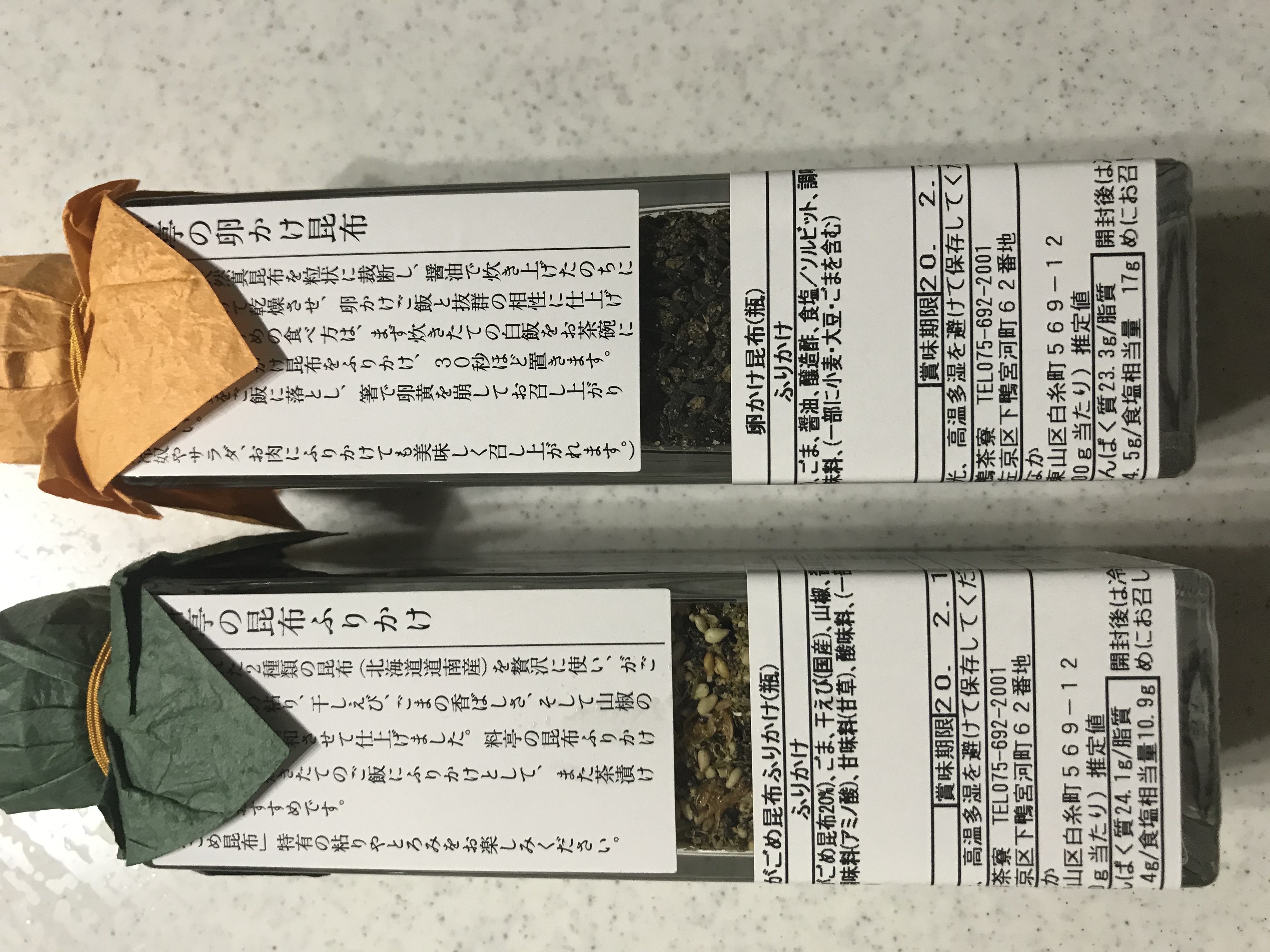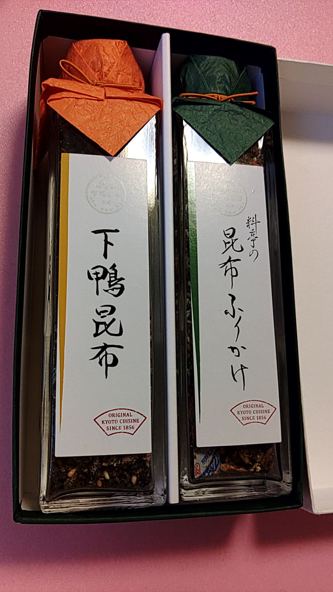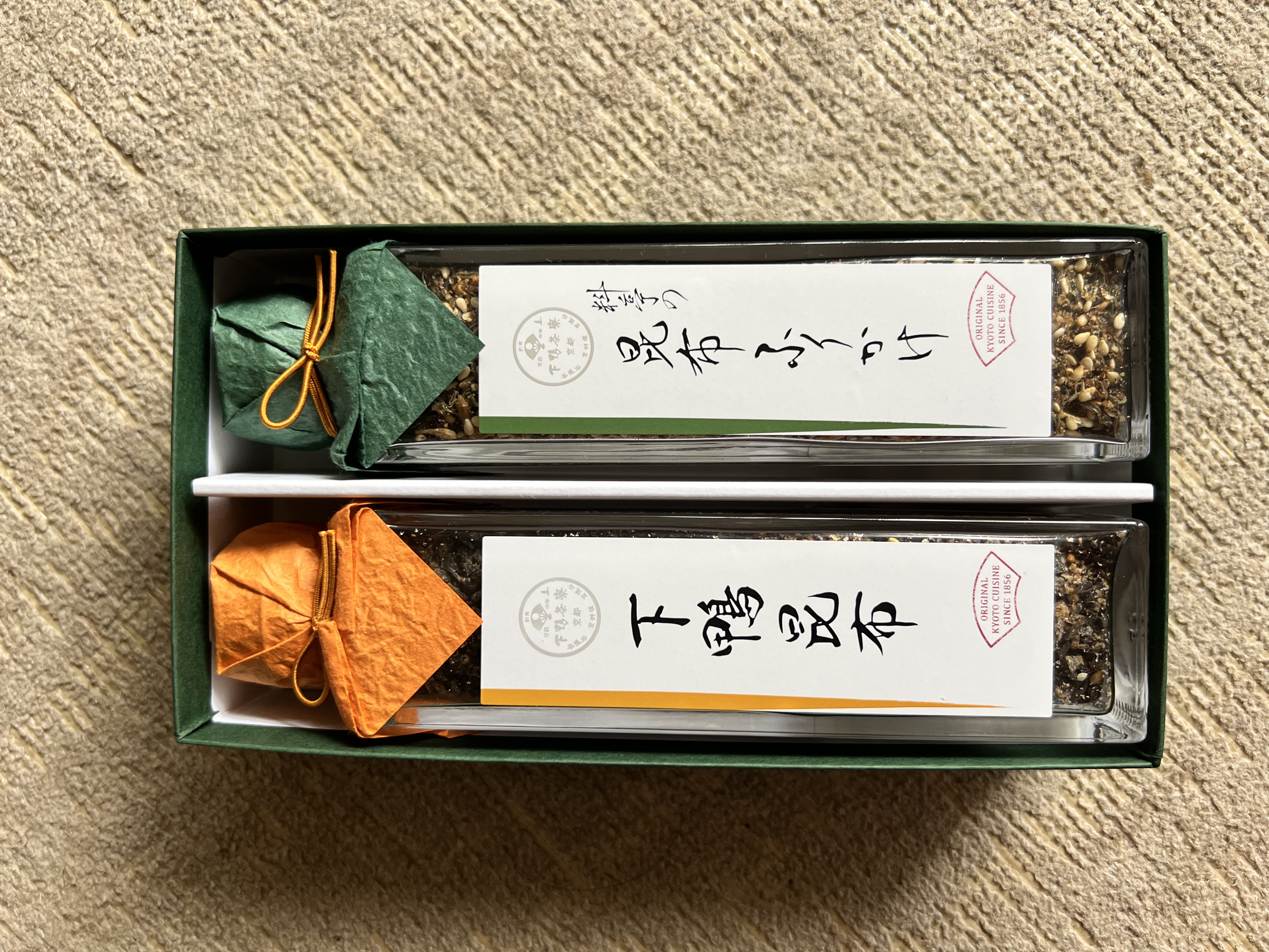 昆布の旨味を引き出したふりかけ「がごめ昆布ふりかけ」と「下鴨昆布」です。卵かけご飯と抜群の相性の「下鴨昆布」は、北海道産の真昆布を粒状に裁断し、醤油で炊き上げたのちに3日以上かけて乾燥させ仕上げています。「がごめ昆布ふりかけ」は、北海道産のがごめ昆布・塩昆布を贅沢に使い、ごまの香ばしさ、山椒の香りを絶妙に調和させています。異なる味わいのセットなので食べ比べが楽しめます。化粧箱に入って届くので、贈り物にもおすすめです。