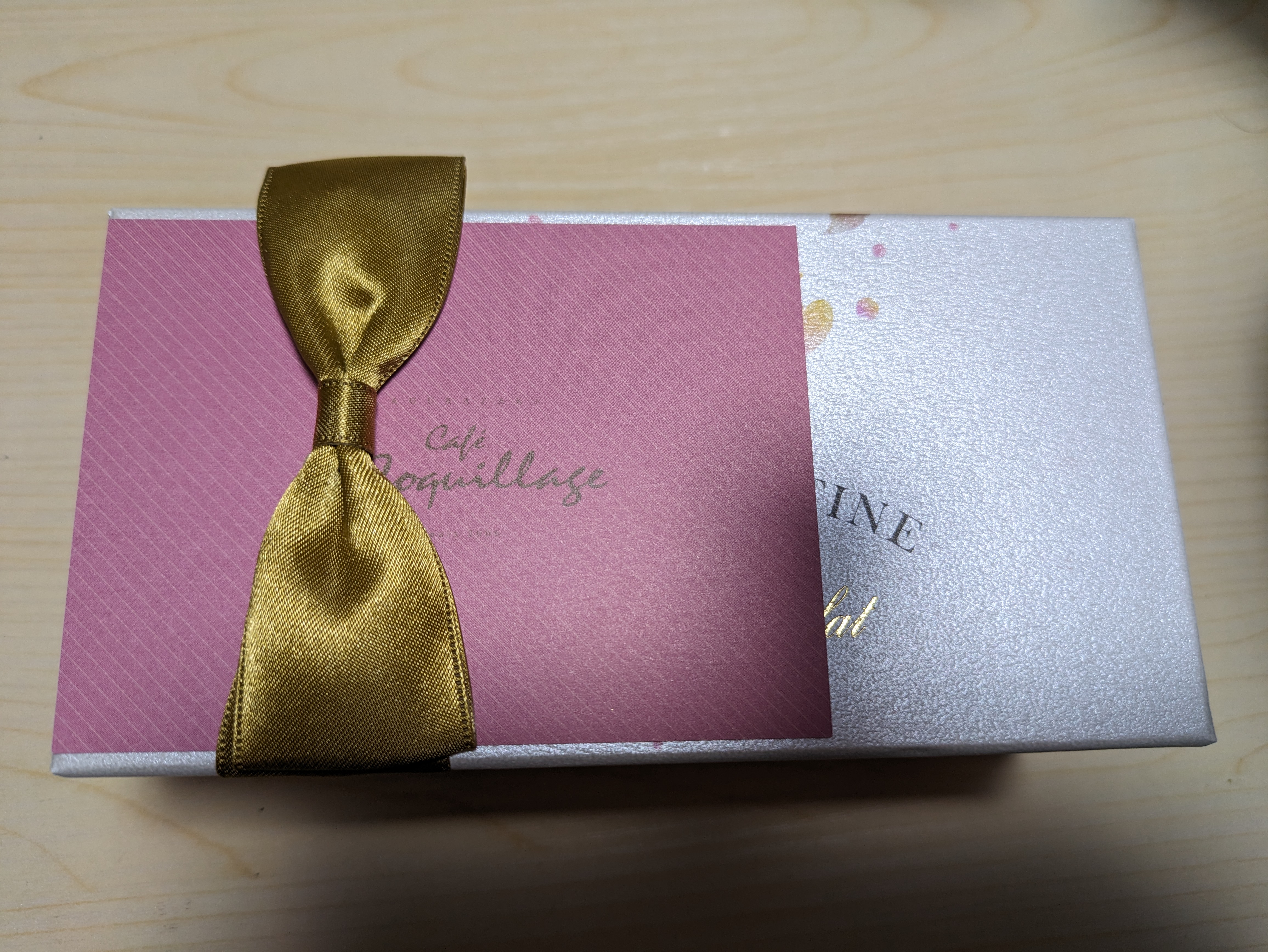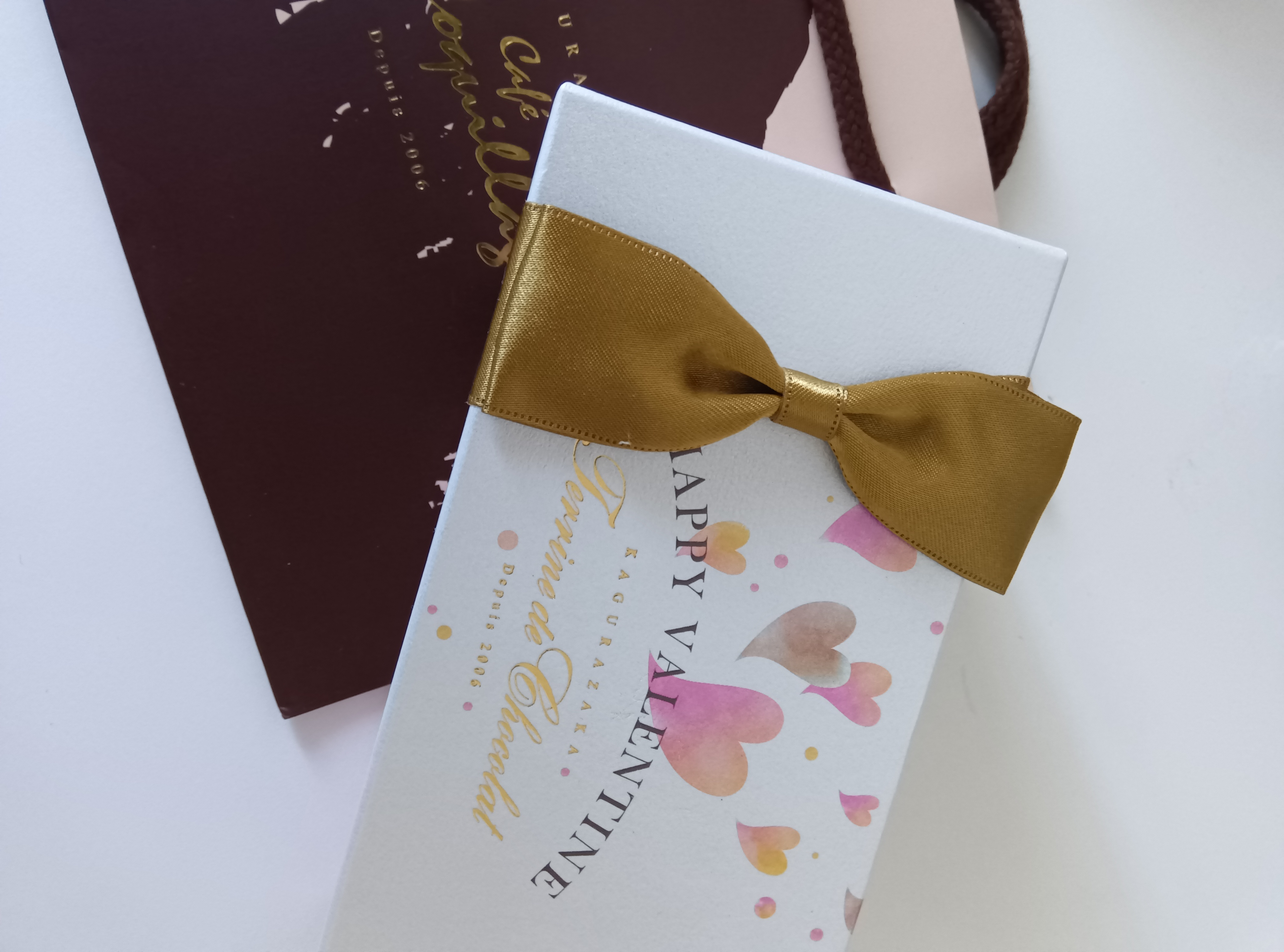 バレンタインのパッケージは、箱の下半分がピンク色でとってもカワイイ!ゴールドのリボンも豪華で、素敵な紙袋も入っているので、プレゼントや手土産にピッタリです!