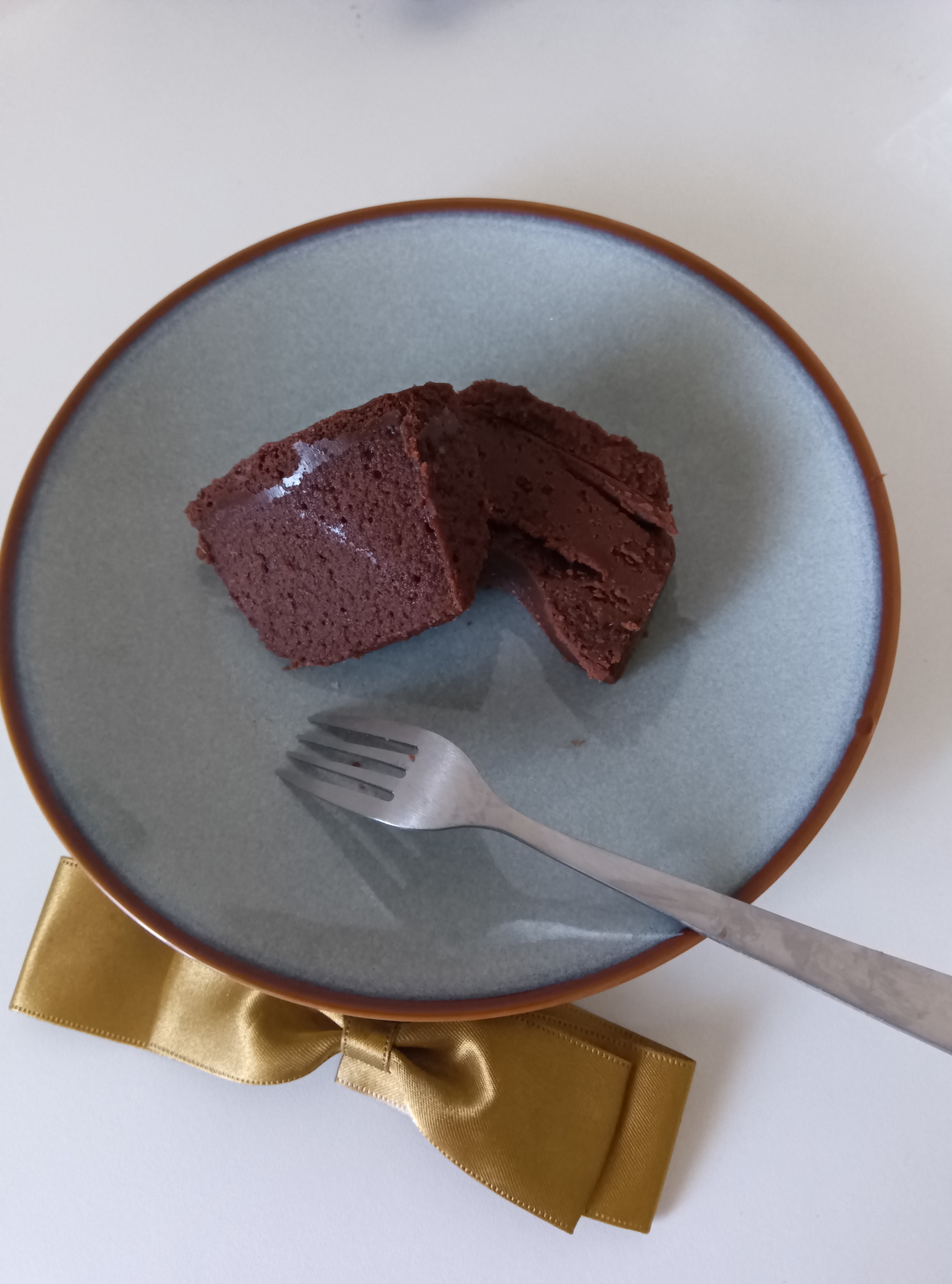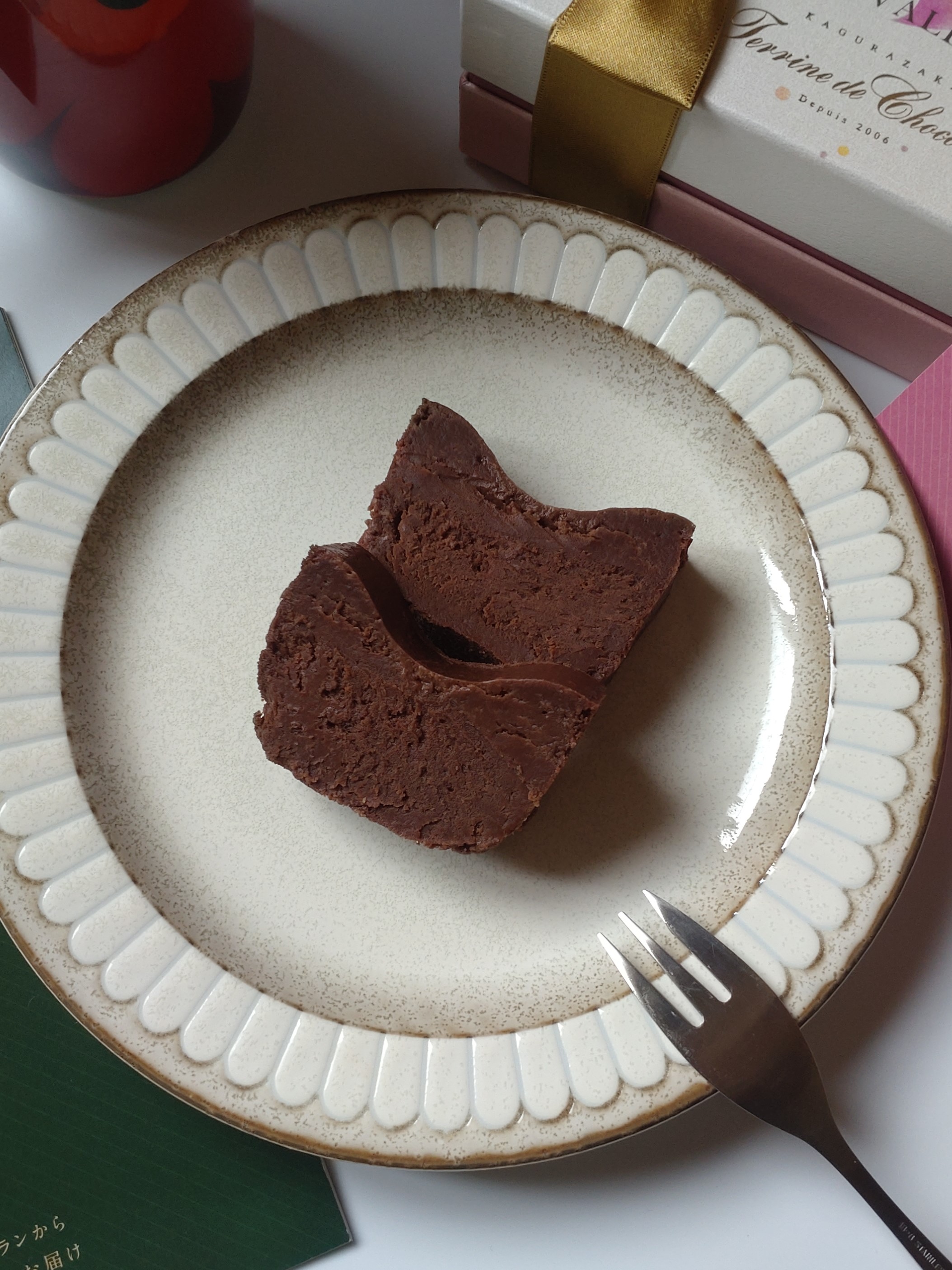 中身はずっしり濃厚で、カットした後に レンジで温めると 真ん中からチョコがとろけてきて!ツヤッツヤのチョコレートに自分が映りそうなくらい 表面がとっても美しいです!