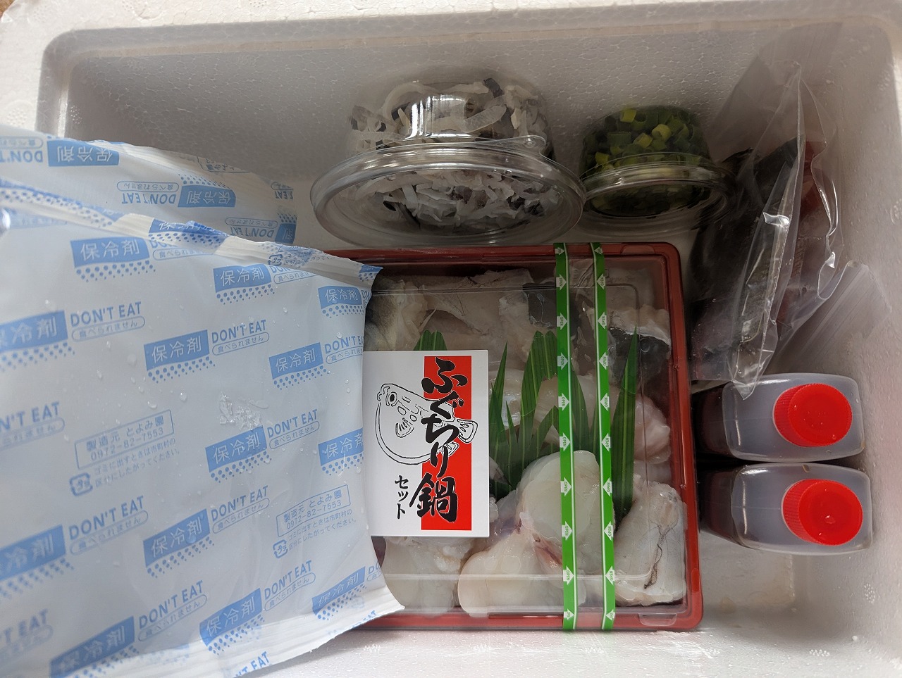 とらふぐ切り身・アラにふぐ皮とヒレ、特製ぽん酢や薬味セット、だし昆布をセットにしてお届けします。