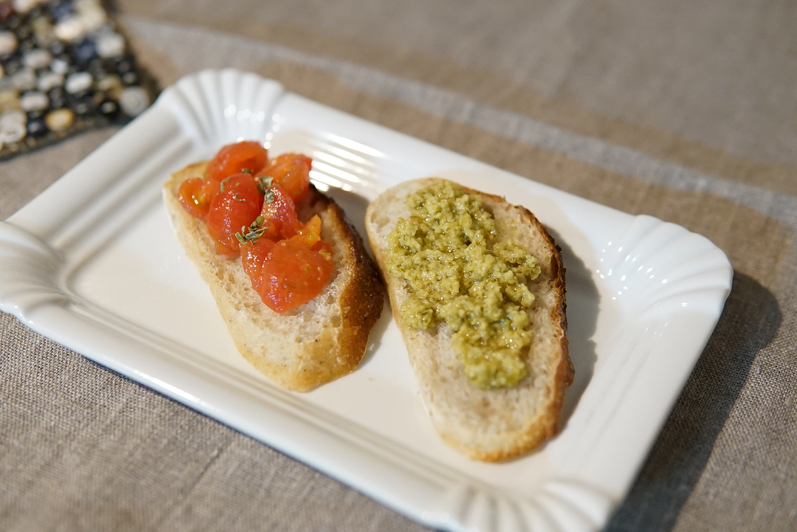 このペーストのオススメの食べ方を試すために、バターもミルクも入れず水だけで仕込んだクッペを作っていたのでペーストをそのままバージョンと、トマトに混ぜ込んだのブルスケッタを作り食してみました。ワインはもちろん焼酎などにも合う味に!