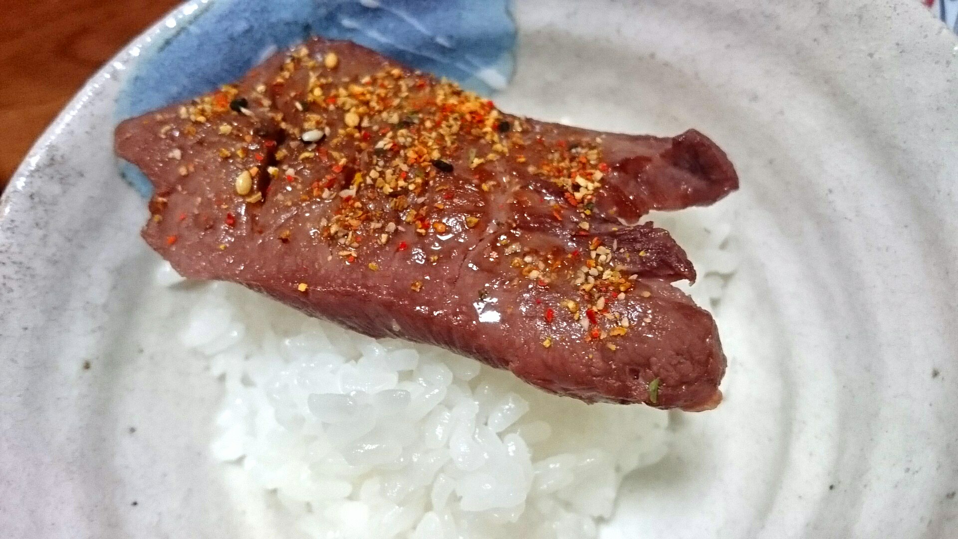 炊き立ての麦飯の上に熱々の牛タンを乗せ一味を軽く振り掛け口の中へ、美味しい、本当に美味しい。