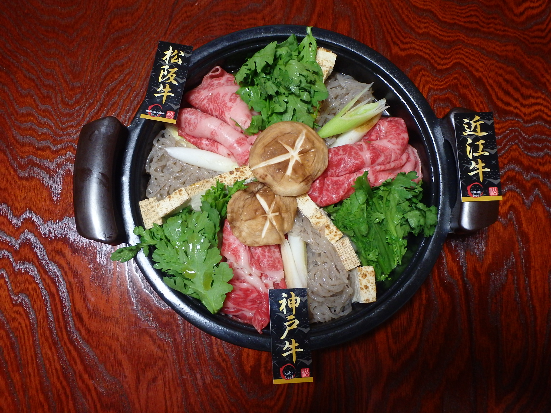 甘くてコクがあり、上品な香りが特徴の「松阪牛」、うまみ成分肉繊維がきめ細かく上品な甘味の「神戸牛」、繊維や霜降りのきめが細かく、芳醇で独特の究極の香りの「近江牛」を一度に楽しめます。