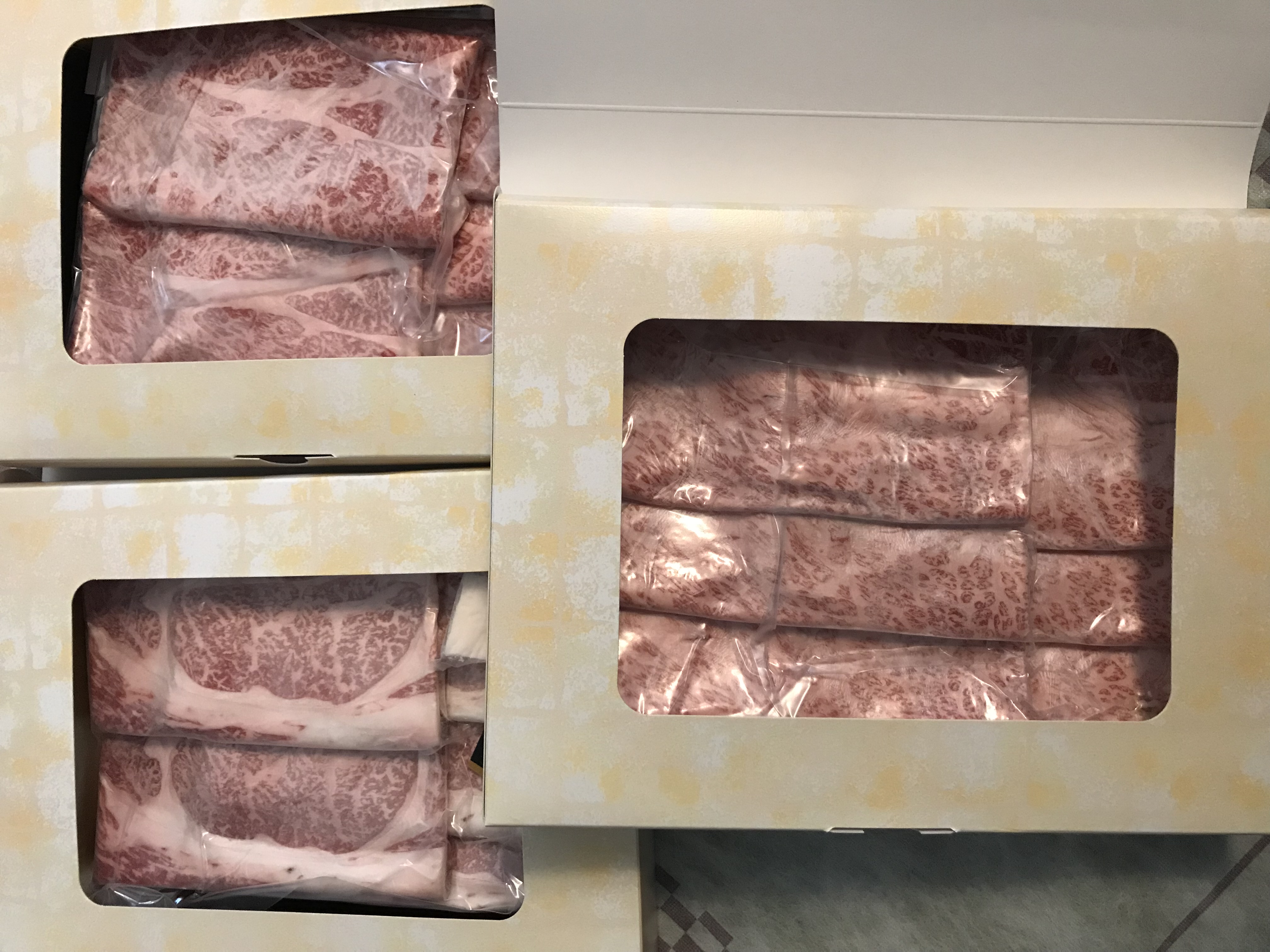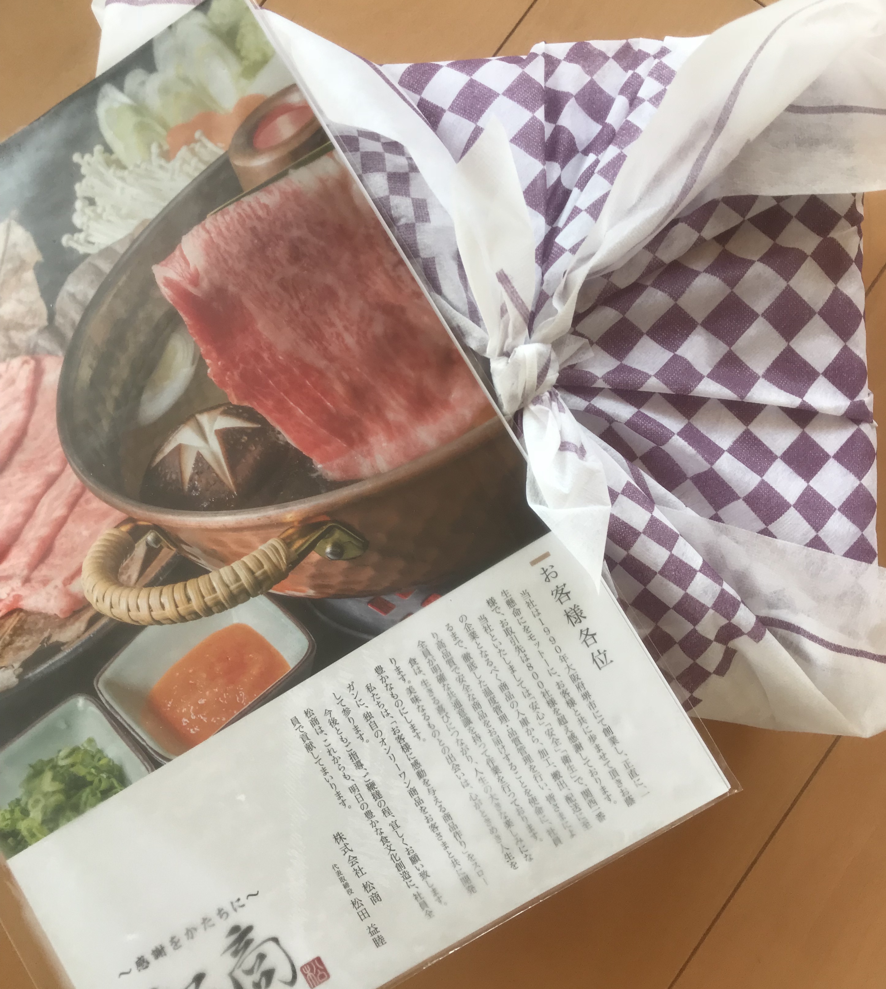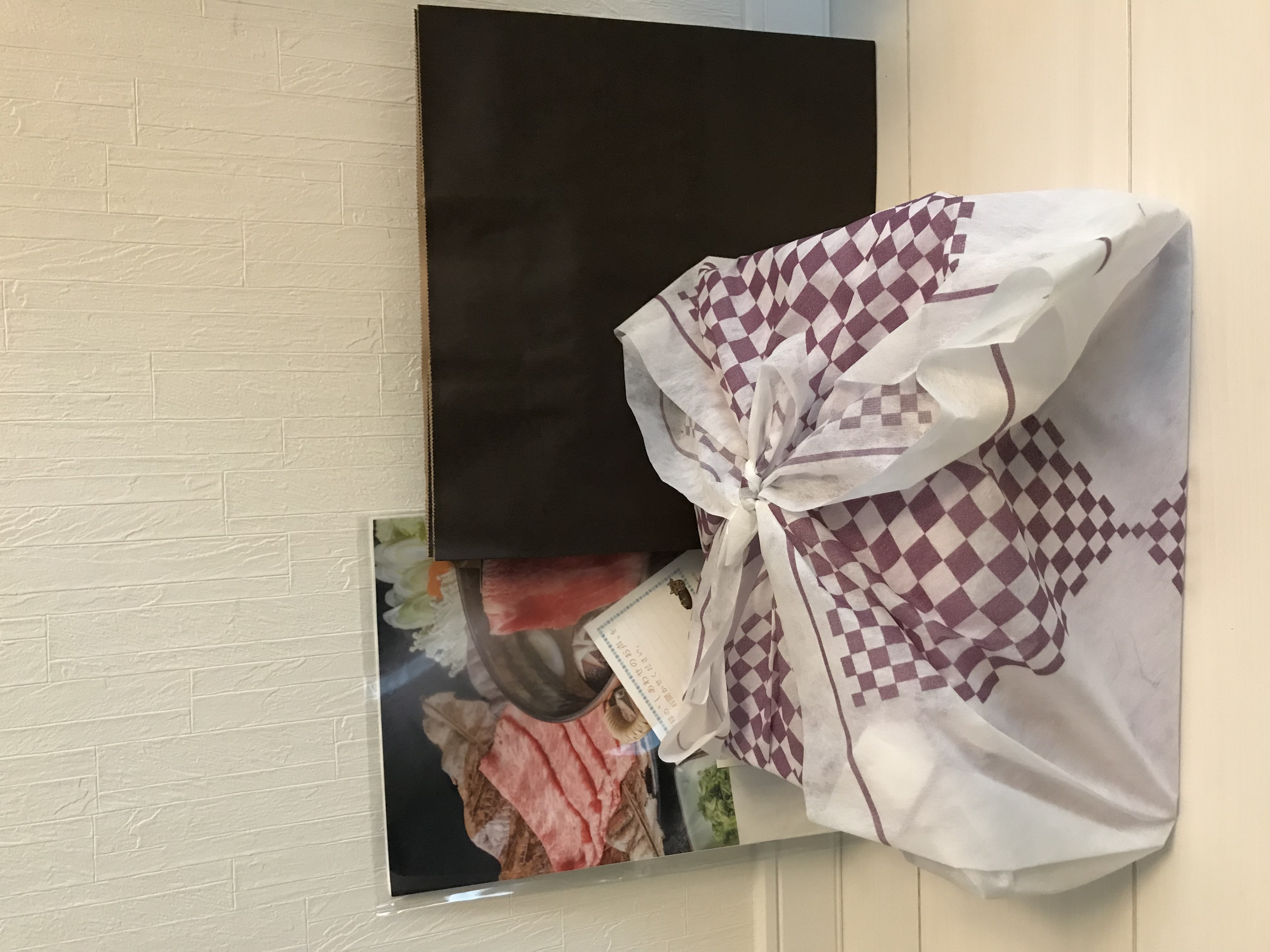 箱を開けると立派な包みに入っており高級感が漂っていました。しかし勝手に包みが風呂敷かと思っていたのと、お肉の入っている箱がHPの写真では桐の箱のようなものだったのにこちらは紙製の箱だったので少し残念でした。