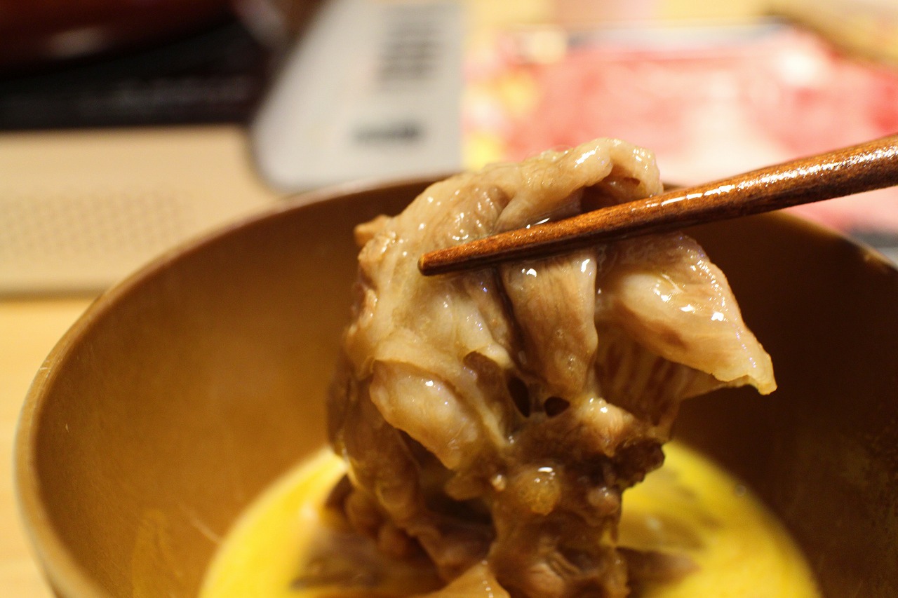 ●醤油、砂糖など(お好みの味付け)のすき焼きのタレをお肉の上にかけ流します。