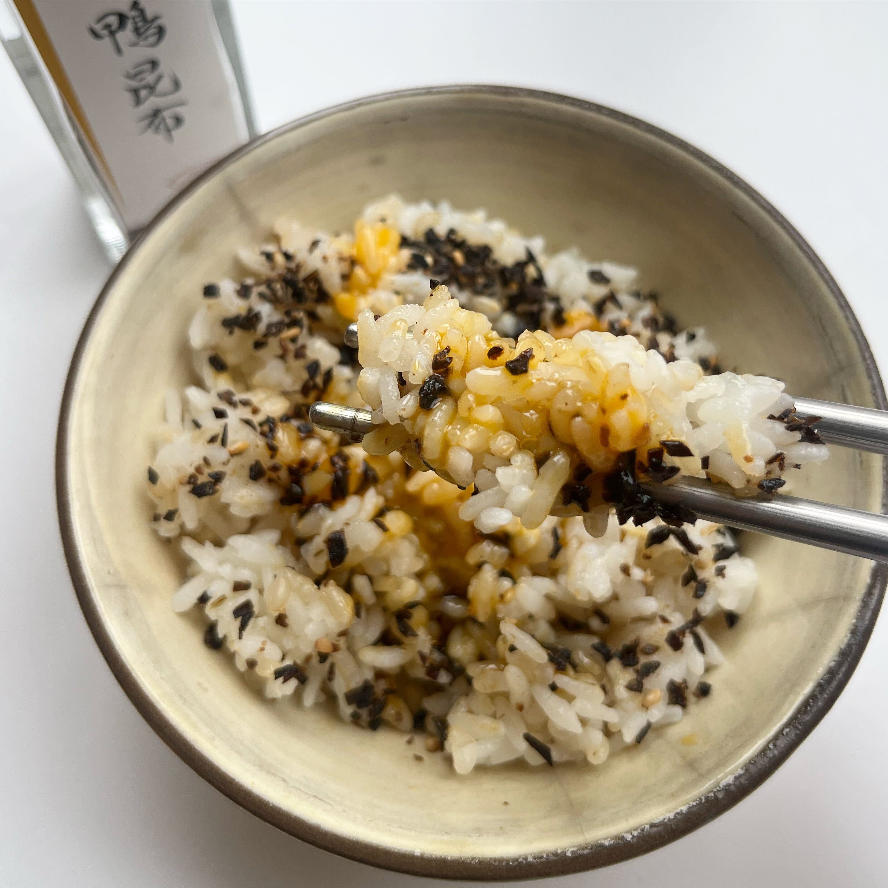 国産の昆布を贅沢に使用、卵かけご飯との相性抜群の「昆布ふりかけ」です。北海道産の天然真昆布を粒状に裁断し、醤油で炊き上げ、さらに3日以上かけて乾燥させ、昆布の旨みを引き出しています。炊きたての白飯に、ふりかけ30秒ほど蒸らして楽しむのがおすすめ。高級感のある角瓶に入っているので使い勝手が良く、サッと振りかけるだけで料亭の味が味わえます。