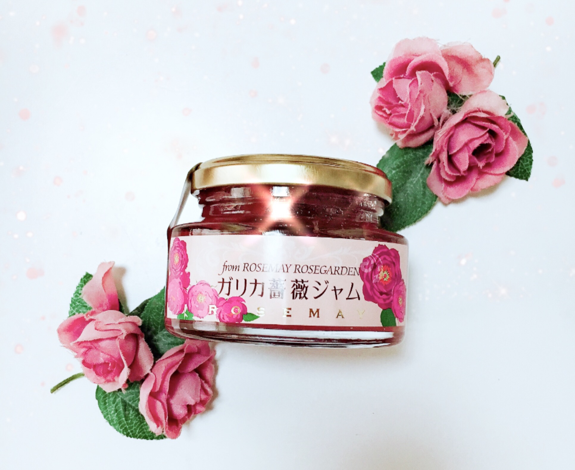 ローズメイ秋田工場に隣接する自社薔薇園にて、自然栽培で育てた安心の「ガリカローズ」の花弁と、すりおろしたりんごをブレンドした「香りを楽しむジャム」。