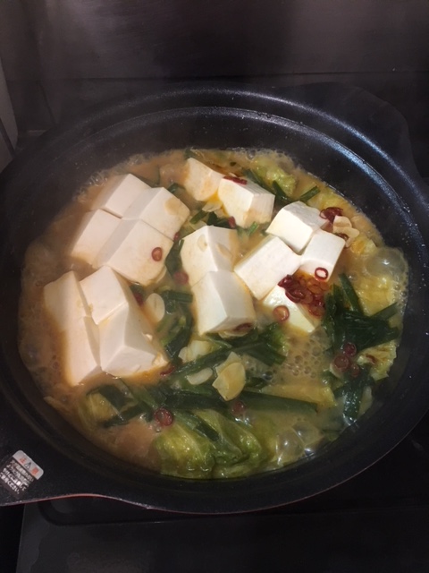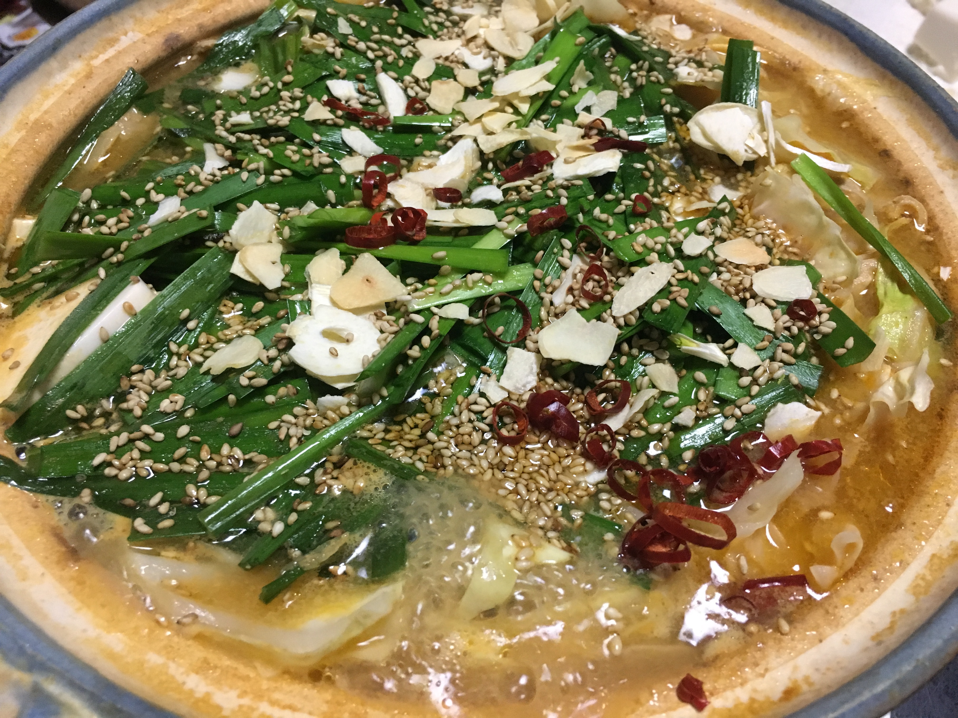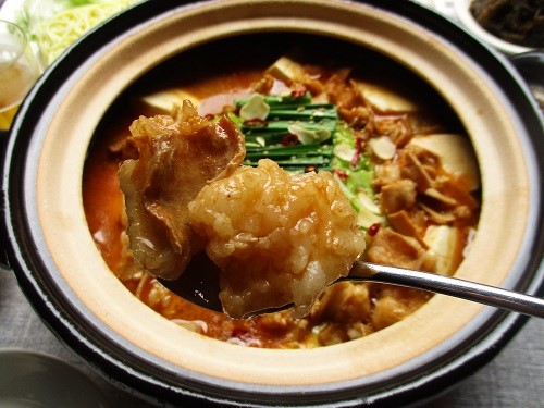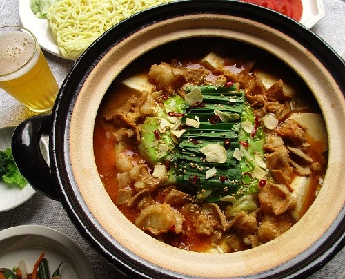 ピリ辛ベースのスープに、旨味とコクのある味噌が相性ばっちりで、暑い夏にハフハフしながら食べるもつ鍋は絶品です。