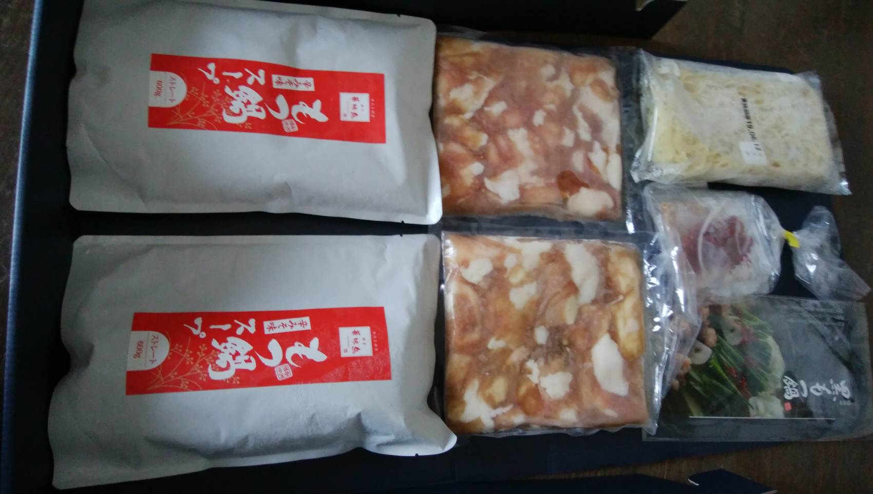セットの内容はもつ鍋スープ辛みそ味(600g×2)、国産牛小腸(250g×2)、ちゃんぽん麺(180g)、にんにくスライス(5g)、胡麻(10g)、唐辛子(1g) です。