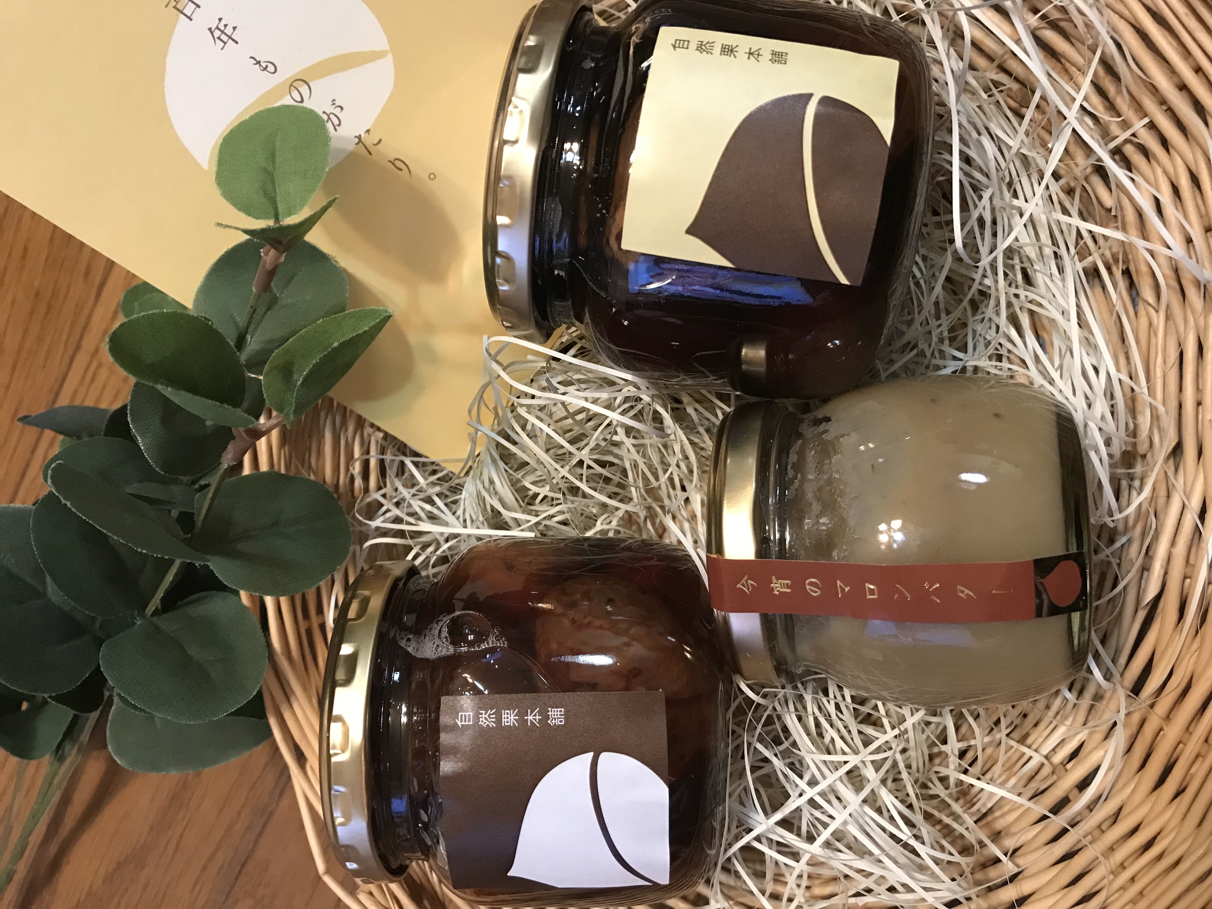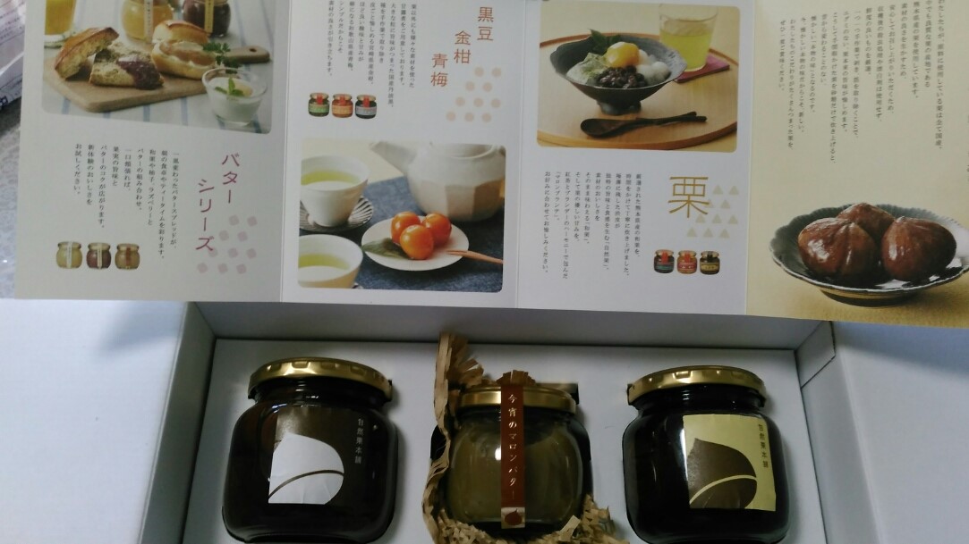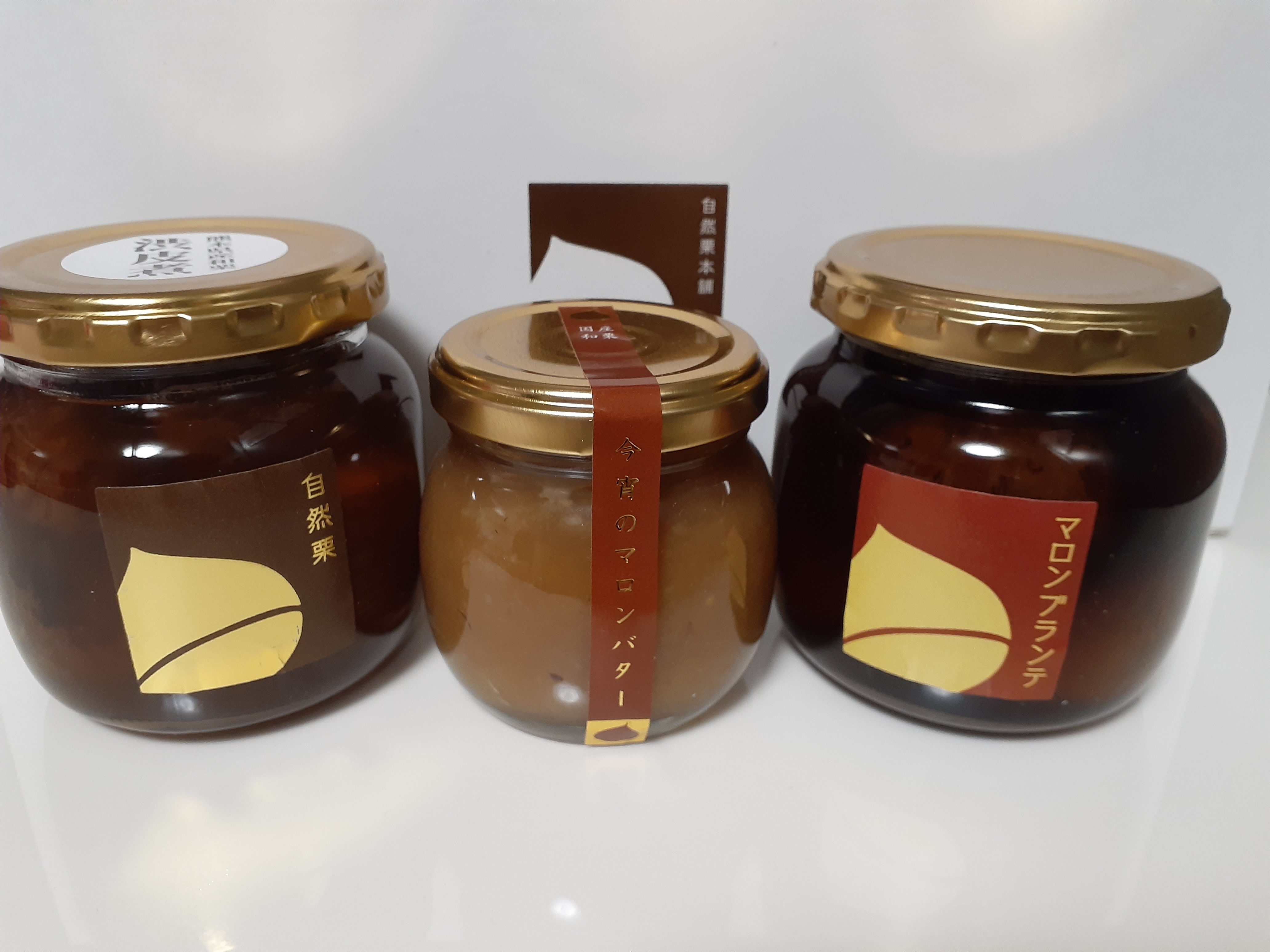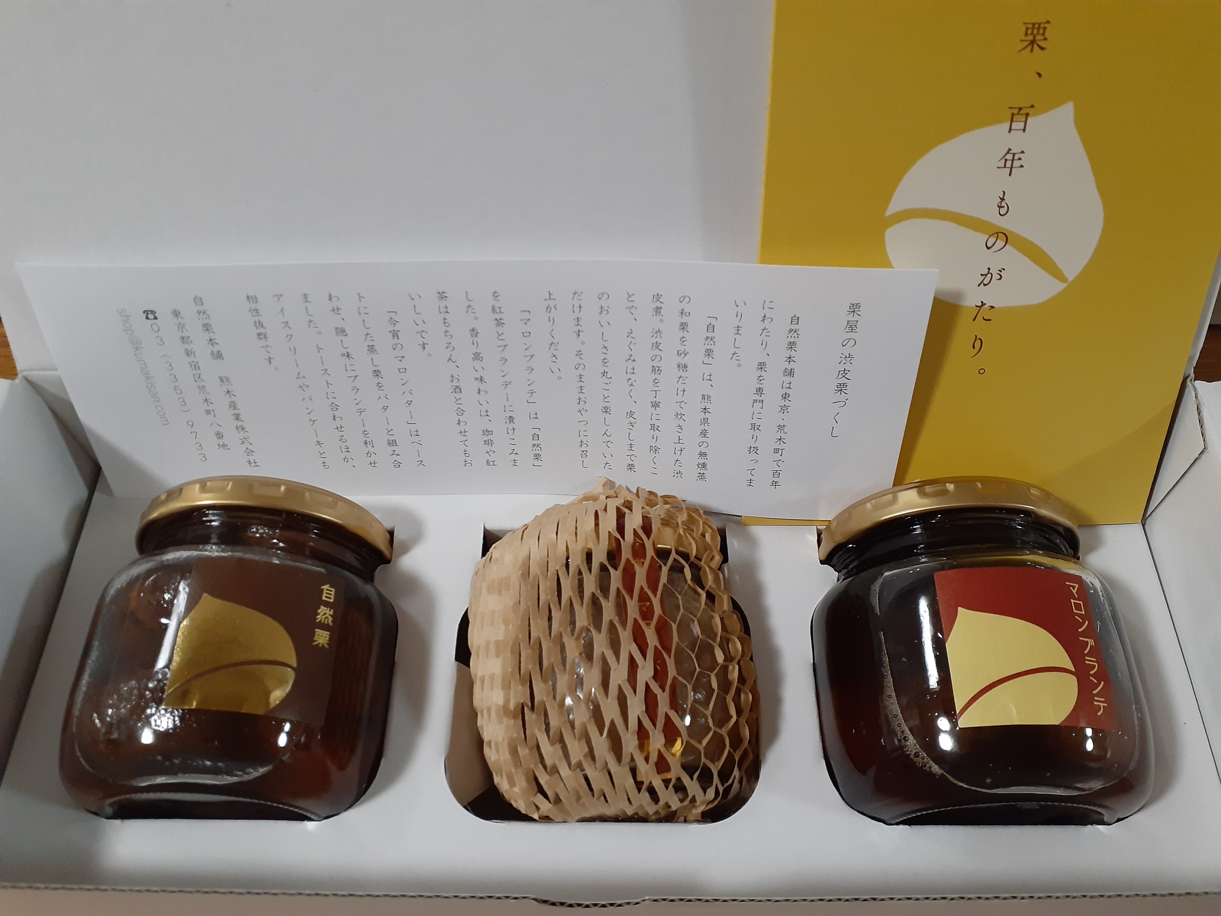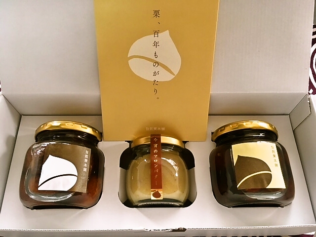自然栗本舗の看板商品、栗の渋皮煮「自然栗」、渋皮煮の紅茶とブランデー漬「マロンブランテ」、和栗を渋皮ごとペーストにした「マロンバター」の3種をセットにしました。