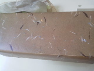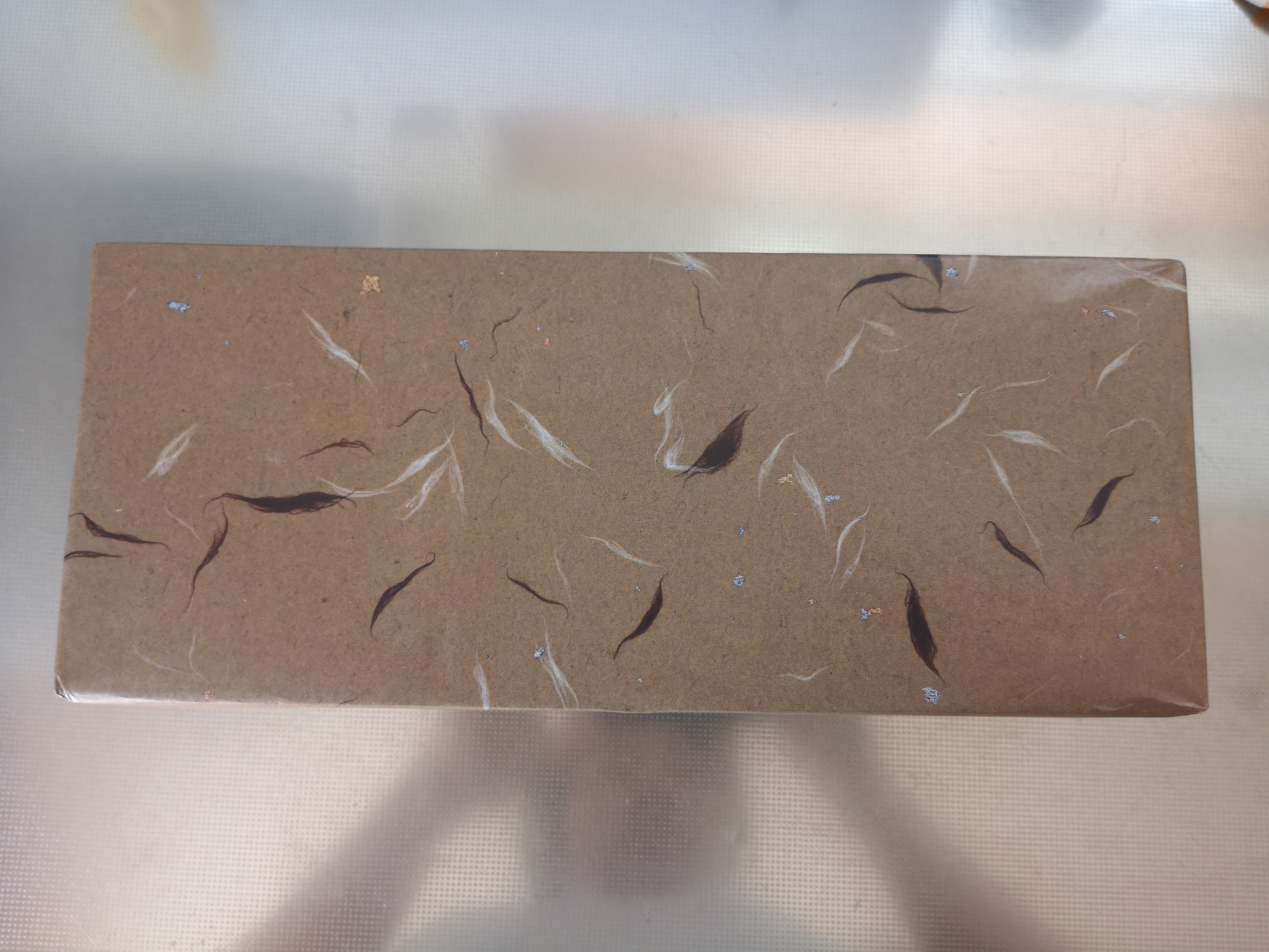 早速開封すると、緩衝材の下には、栗色のシックな包装紙でキャラメル包みされた化粧箱が!高級感ある包み紙を見てワクワクが止まりません。包装紙を開封すると、白い片開きの蓋つき化粧箱が現れました。