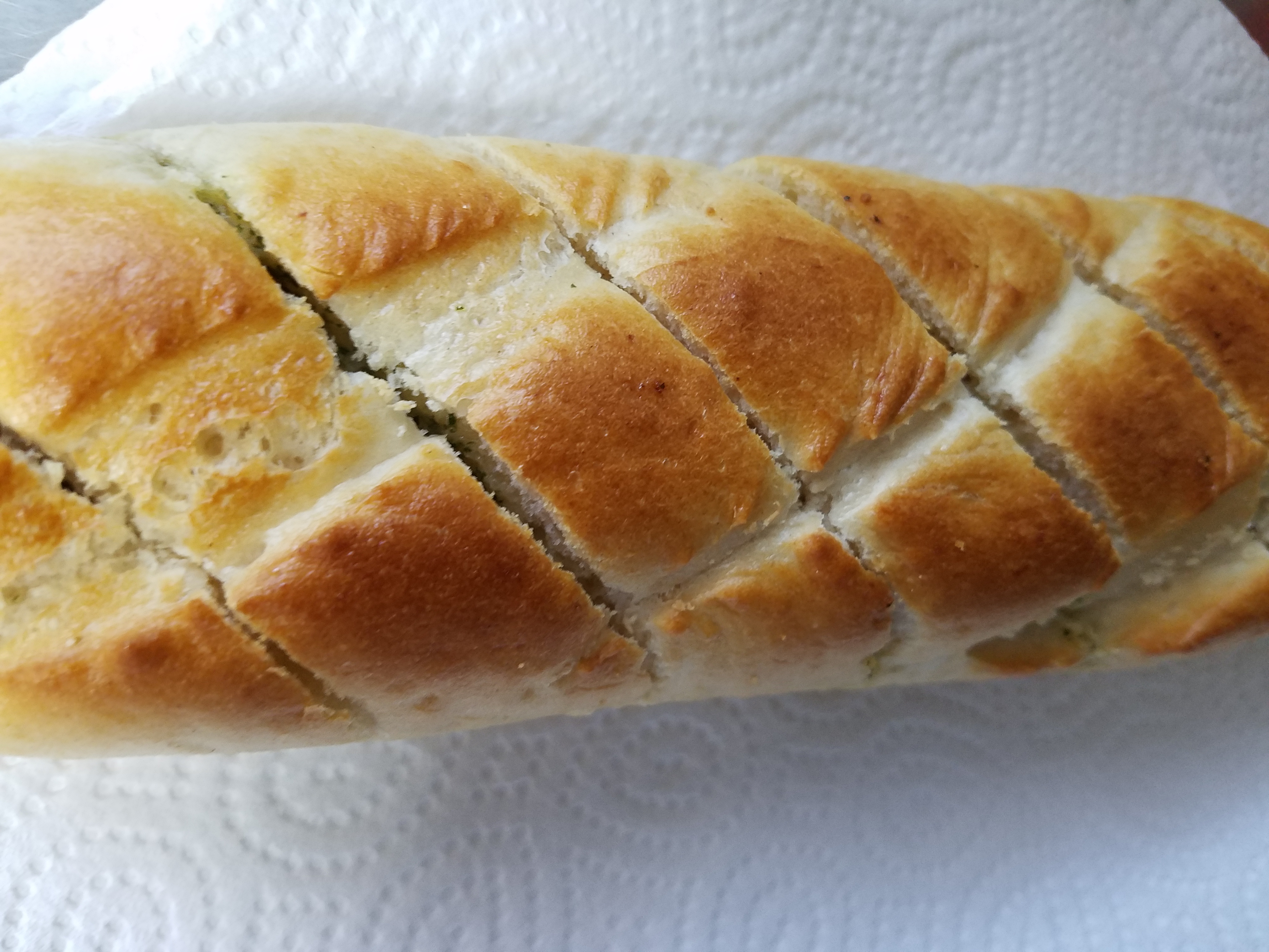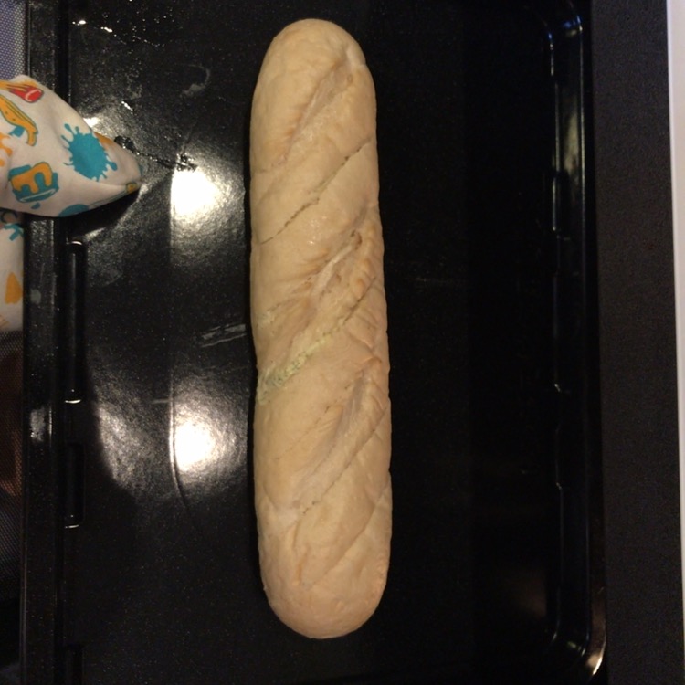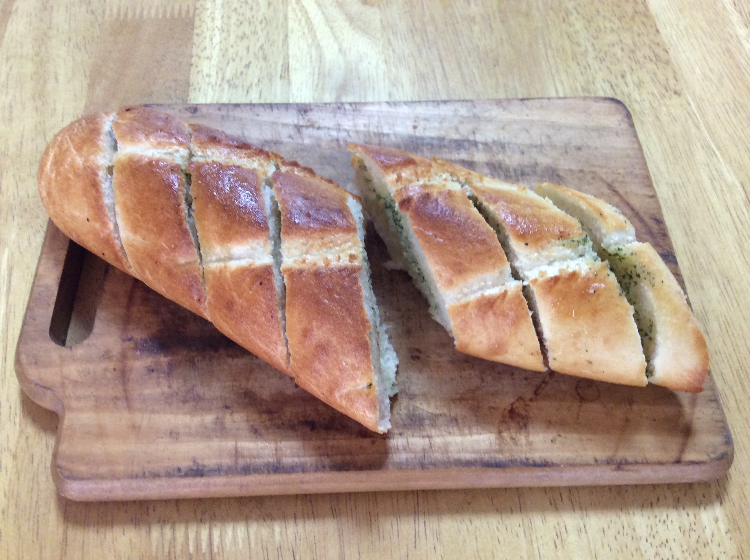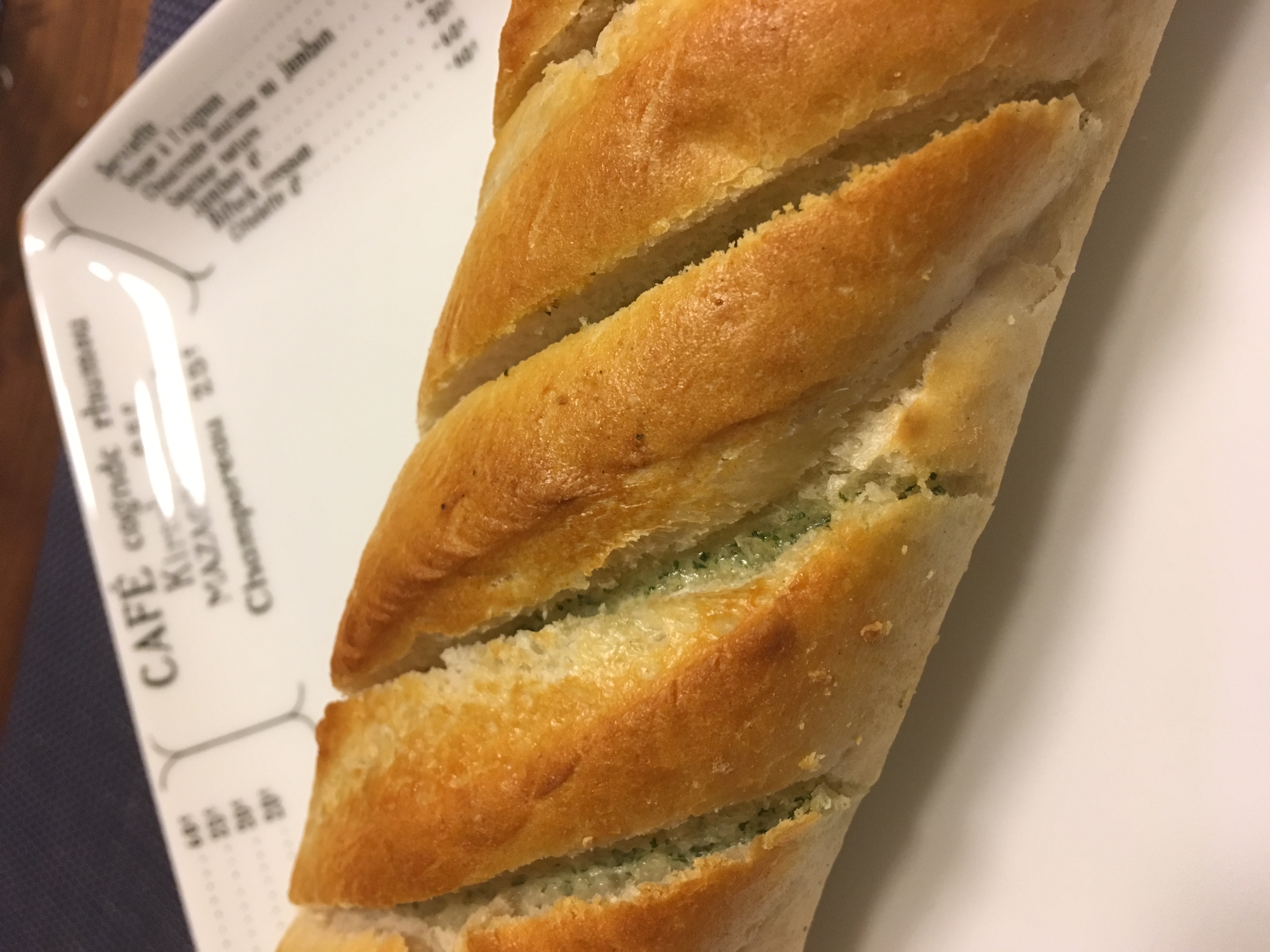 95%まで焼き上げた状態で急速冷凍しているため、オーブンで焼くだけでいつでも本格的な焼きたての味が手軽に味わえます。外はカリッ!中はフワッ!としたフランスパンに切れ目を入れ、ガーリックバターを塗りこみました。軽く焼くだけで本格的な北欧の味が楽しめます。