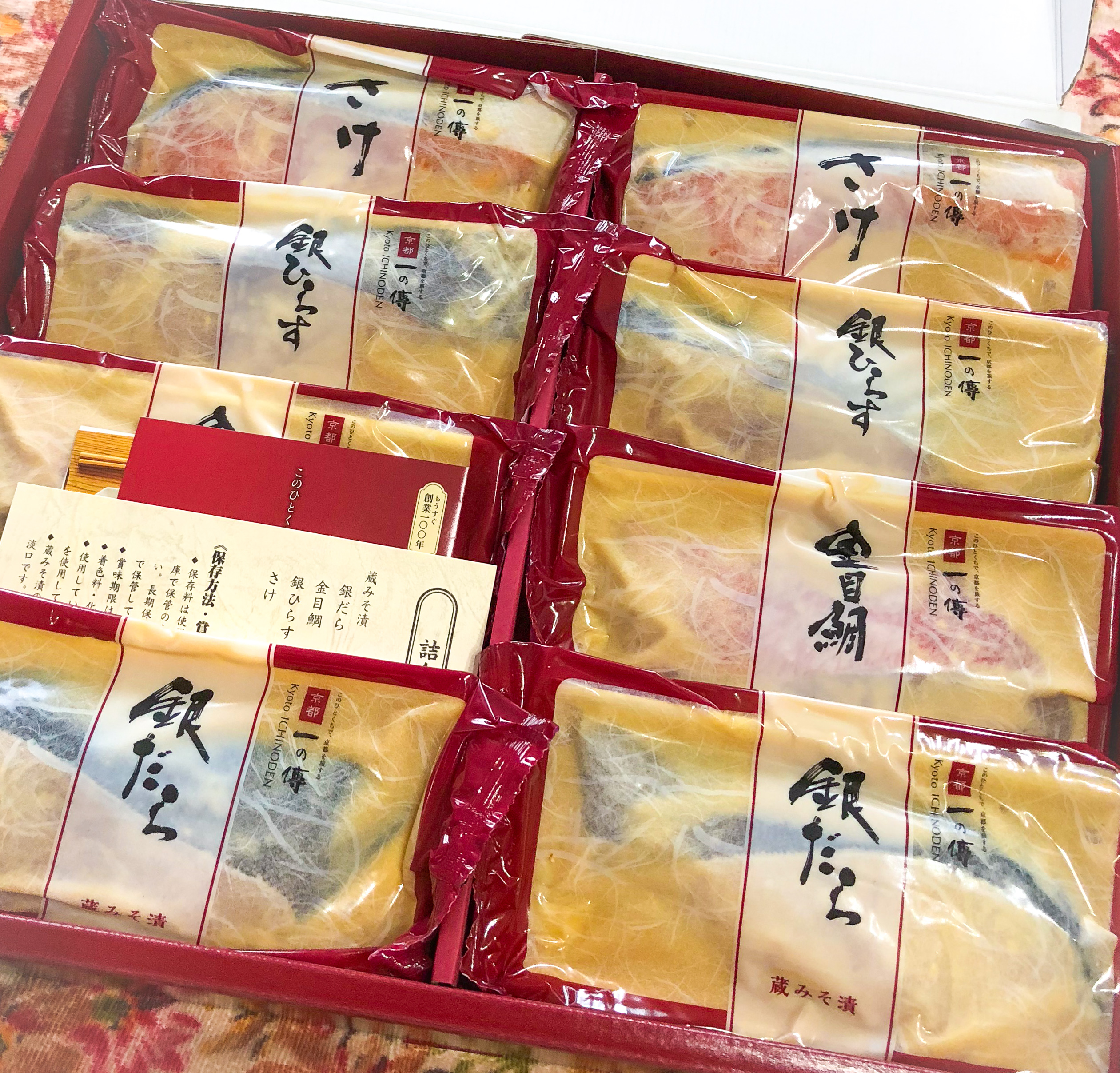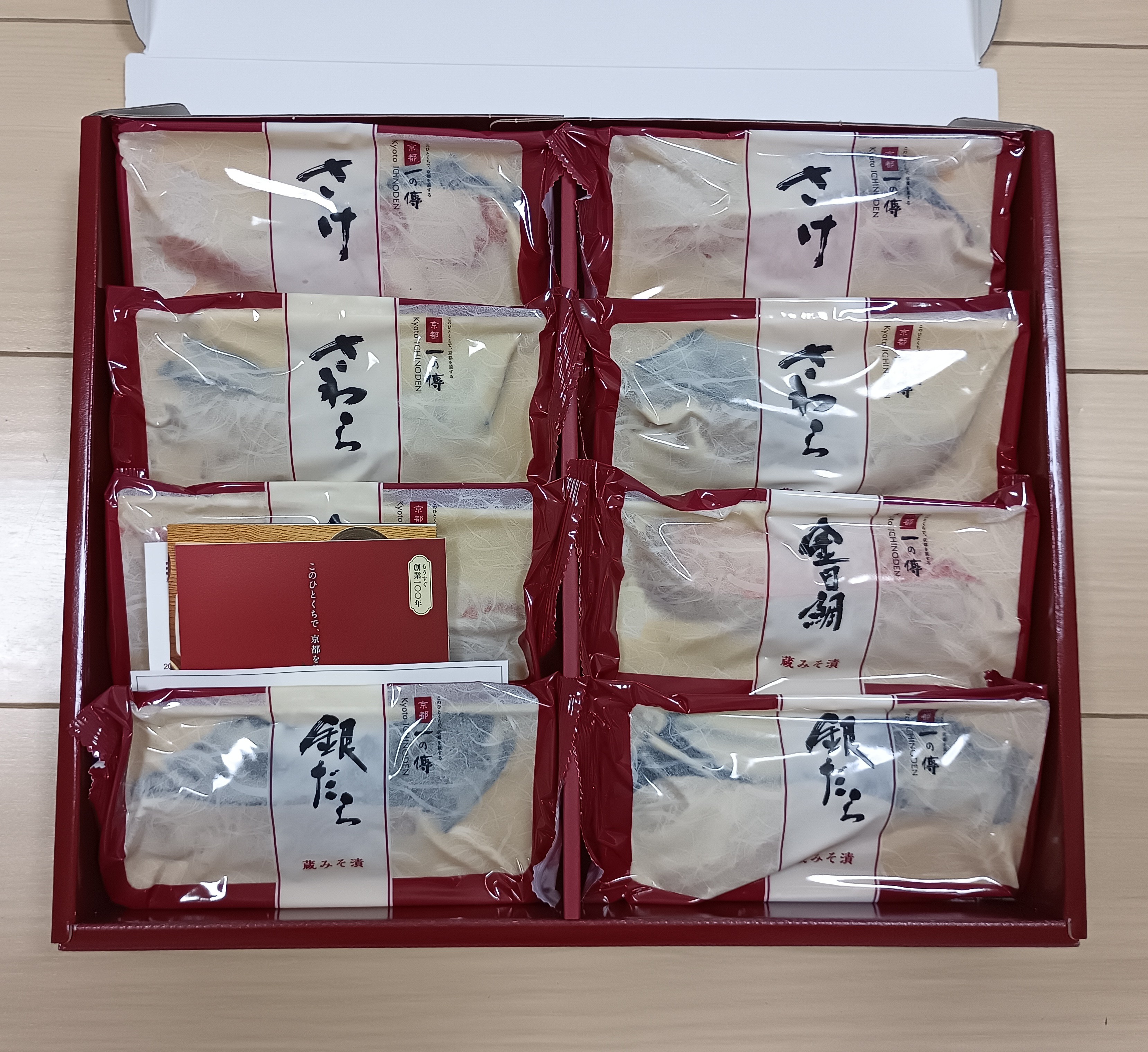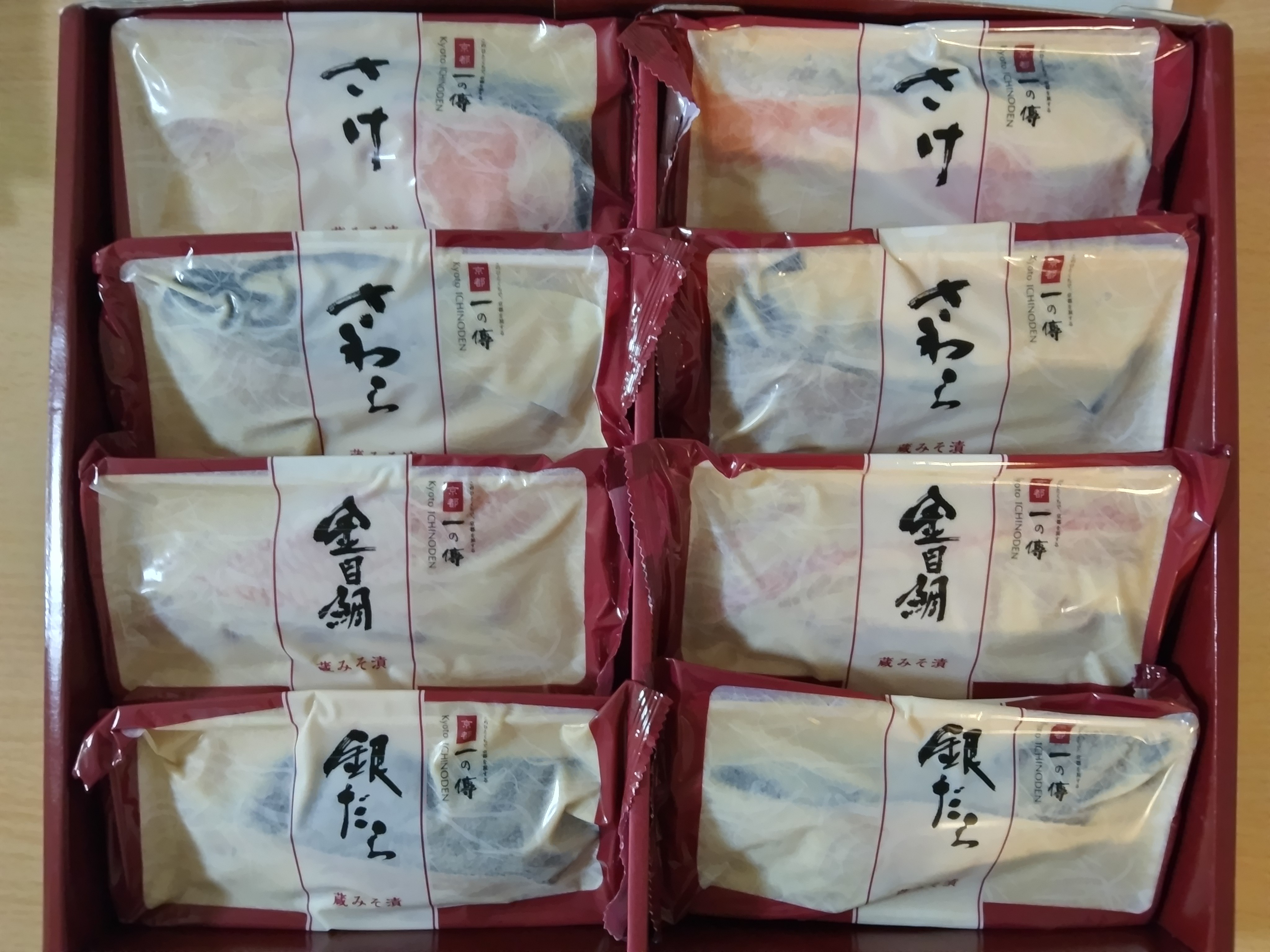 新鮮な海の幸をまろやかな西京味噌床に漬け込んだ、京都を代表する伝統料理「西京漬」です。西京漬の老舗として作り上げた、秘伝の「蔵みそ漬」にじっくり漬け込み、魚の旨味を最大限に引き出しました。「銀だら」、「金目鯛」など4種8切を個別包装で詰め合わています。着色料・保存料・化学調味料 不使用で、塩分も100g中4.3gと控えめです。焼きあげれば香ばしく、其々の魚の持つ豊かな旨みと西京漬け特有の甘味が口いっぱいに広がります。熱々のご飯のお供だけでなくお酒のおつまみとしてもおすすめ。とろけるような京伝統の味が堪能できます。化粧箱に入って届くので贈り物にもおすすめです。