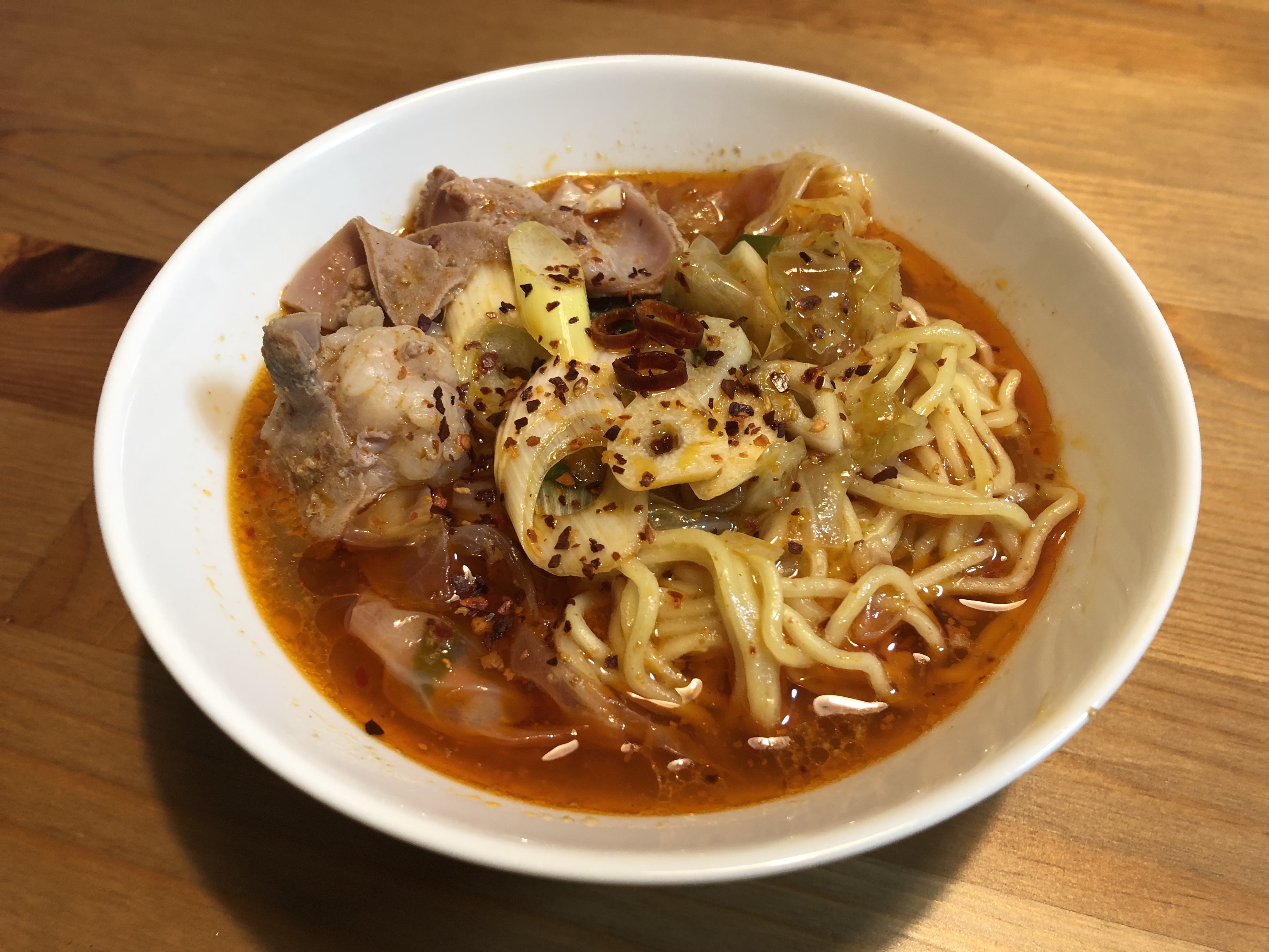 こちらの牛モツは是非すぐ食べてしまうのではなく、じっくりじんわり味わって頂きたい。噛めば噛むほどに現れてくる旨味と甘みを感じて欲しいからです。そして、ある程度食べ終わった後に〆で楽しみにしていたのがオリジナルの麺、小匠麺。この麺は本当に想像以上に、繊細な美味しさがありビックリしました。いつも〆で食べているような麺とは一味違い、一本一本がしっかりとした食感で、もちもち感もあり噛み応えもあるので、味わい深く食べることができました。通常はすすって食べたいところですが、今回のこちらの麺は、モツと同じように、口の中でじんわり噛みながら味わって食べて頂ければと思います。野菜とモツから溶け出した全ての旨味を、この麺に吸わせて頂くのがベストです!また、我が家では、調味料として、ニンニクのすりおろしとごま油、しょうがを準備していて、時々、付け足しながら食べたのですが、これまたよりやみつきになる感覚になる美味しさが生まれましたよ。さらに我が家では、麺だけでなく、間違いなくお米も合う!と感じたので、最終的に残ったスープにお米とチーズを入れたのですが、これも絶品でしたよ。スープにモツ、〆の麺まで、一切手抜きされていないモツ鍋です。韓国風チゲと聞くと、辛いのでは?と思われるかもしれませんが、私個人としては、旨味の方が充分に存在しているので、そんなに辛さは気にならず頂けると思います。また、次の日も食べたくなるそんな美味しさです。やはりモツに関しては、今まで頂いてきたモツの中でも、鮮度といい、食感といい、風味といい、トップレベルの美味しさでした。またお取り寄せしたいと思います。