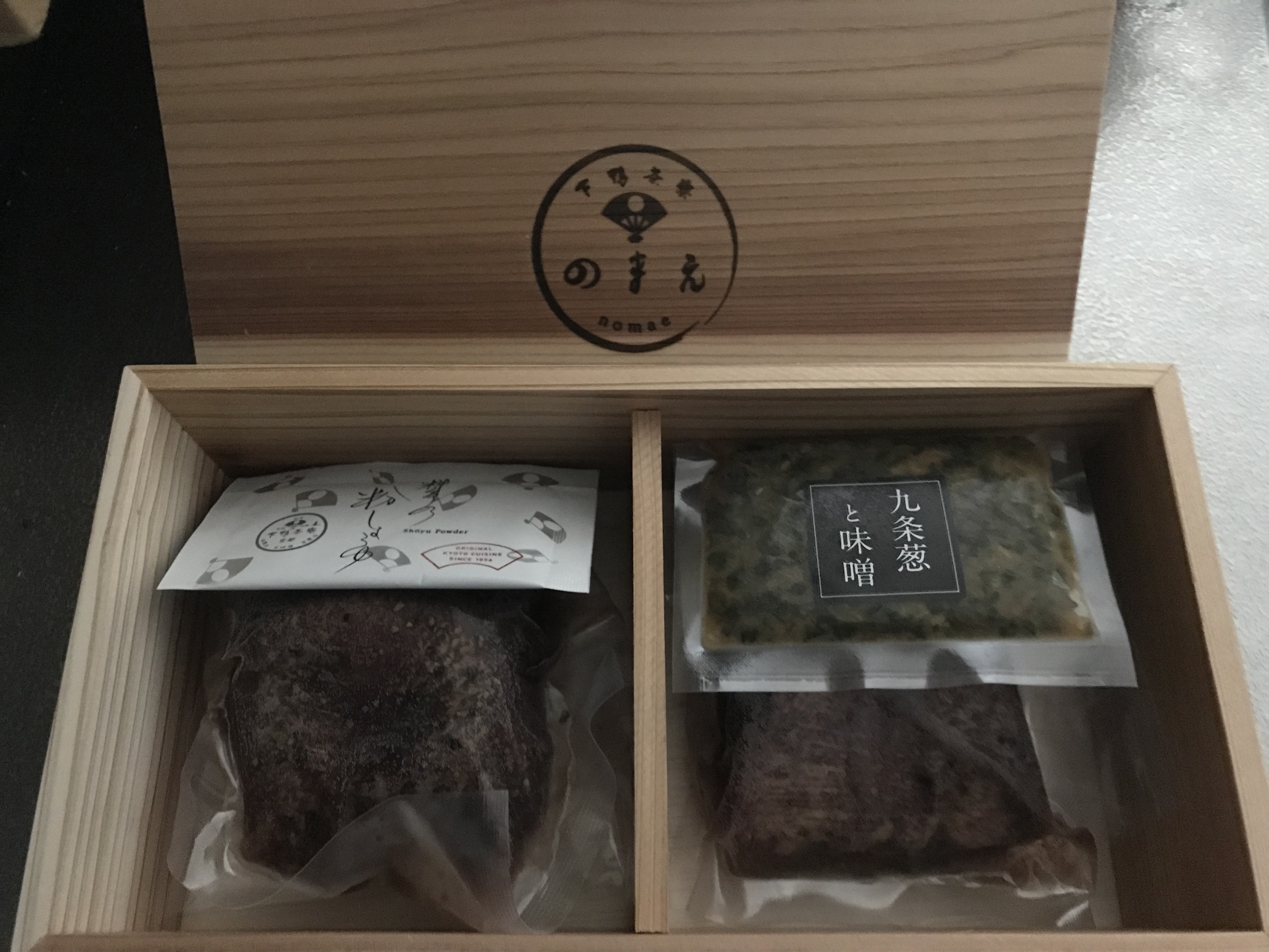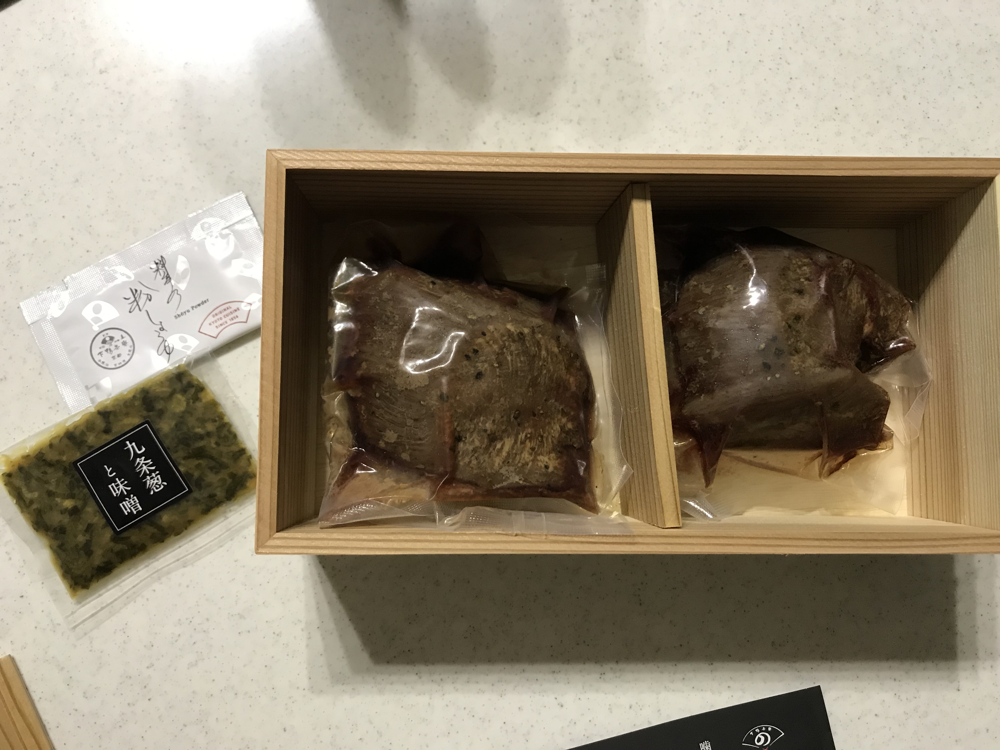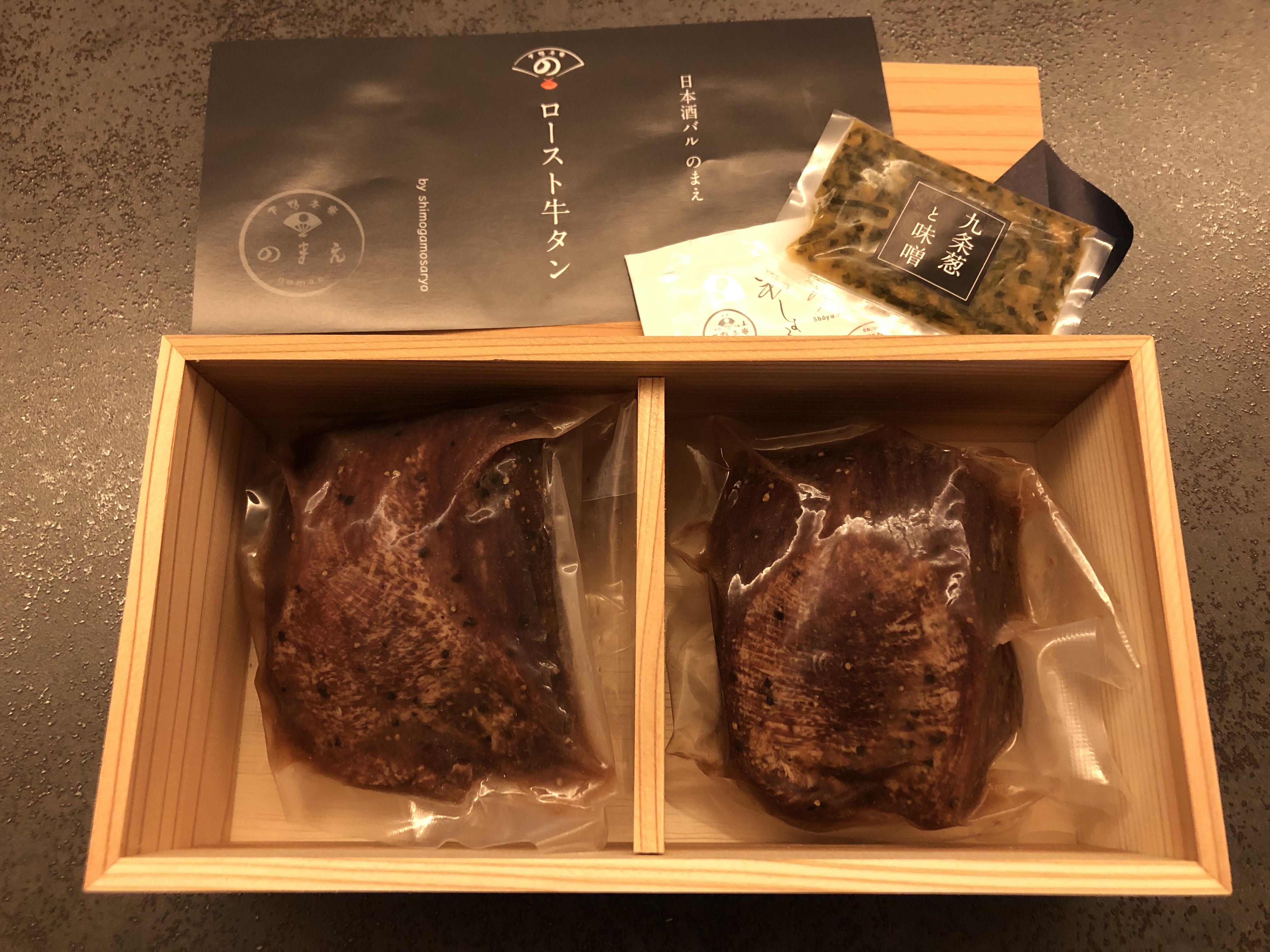 中には真空パックされた牛タンローストが2つ、薬味の九条ネギと味噌、粉醤油。