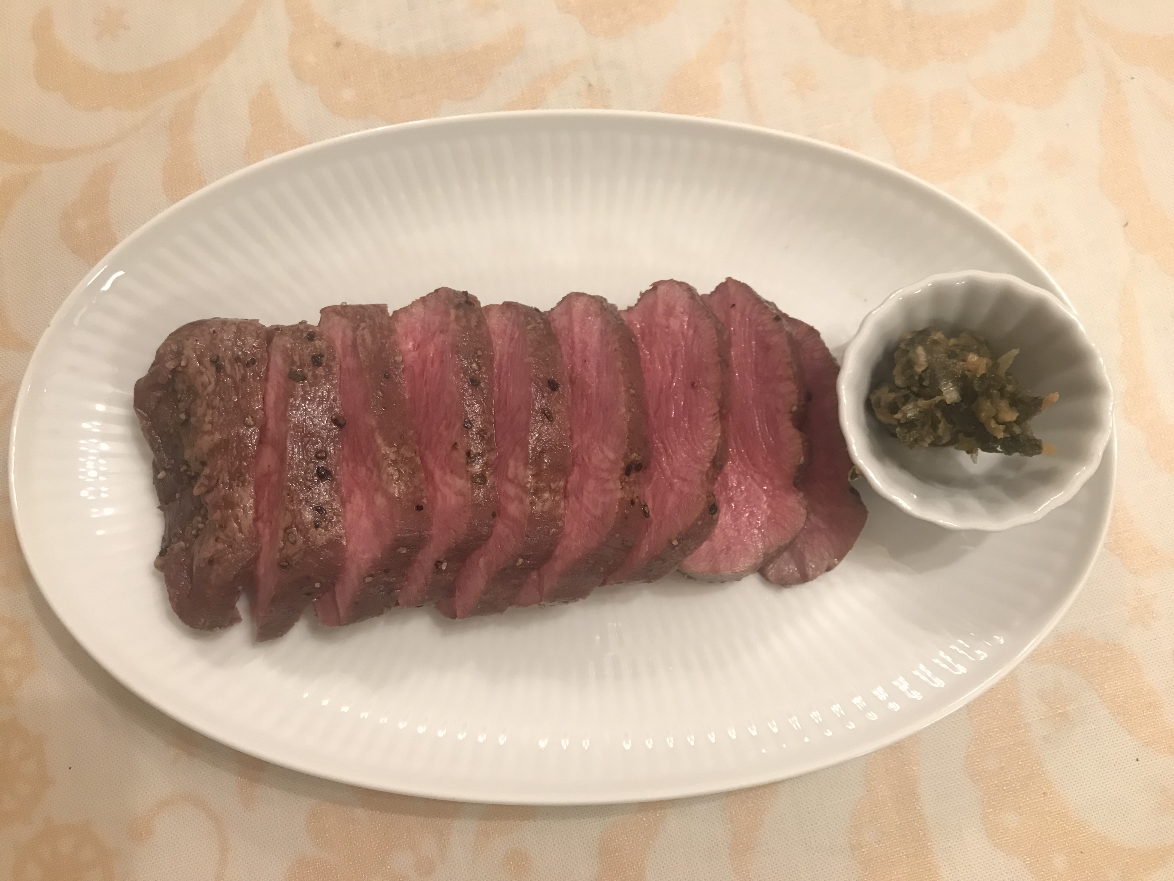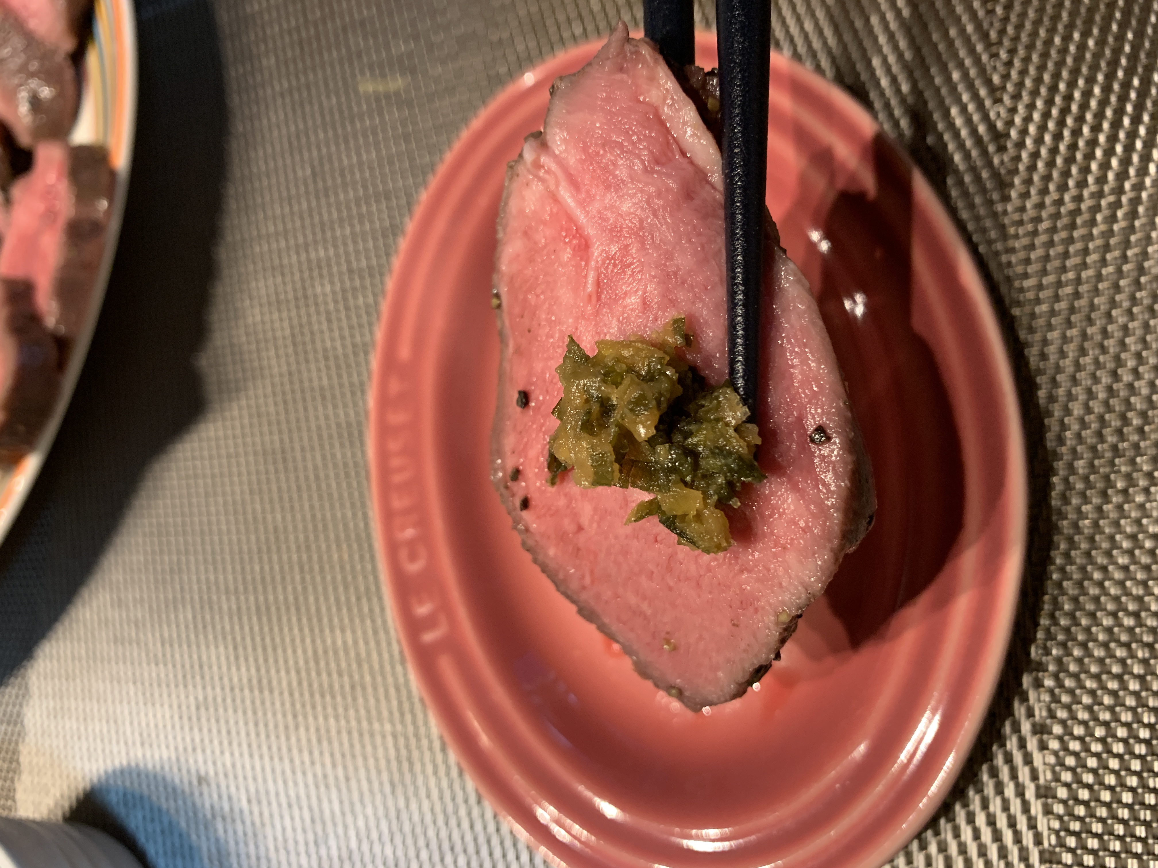 包丁で切っていきますが、思っていたよりもずっと柔らかい!!牛タンローストと言うくらいだから、結構硬いのを想像していたのですが、スっと包丁が入っていきます。