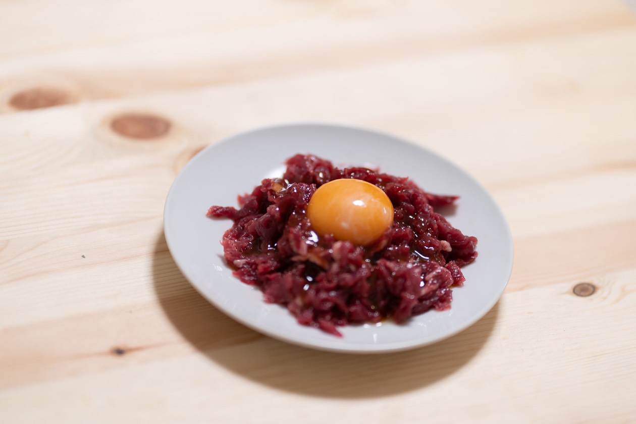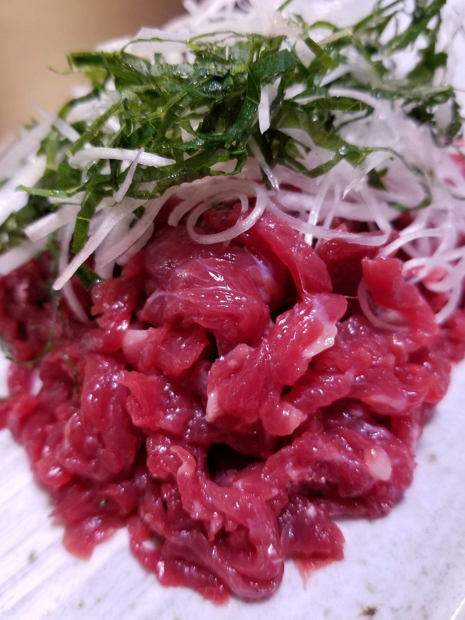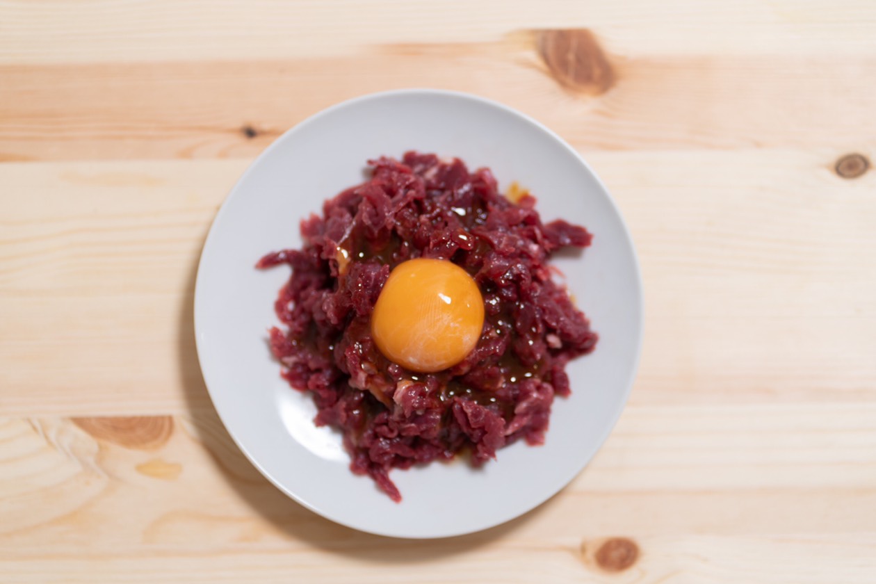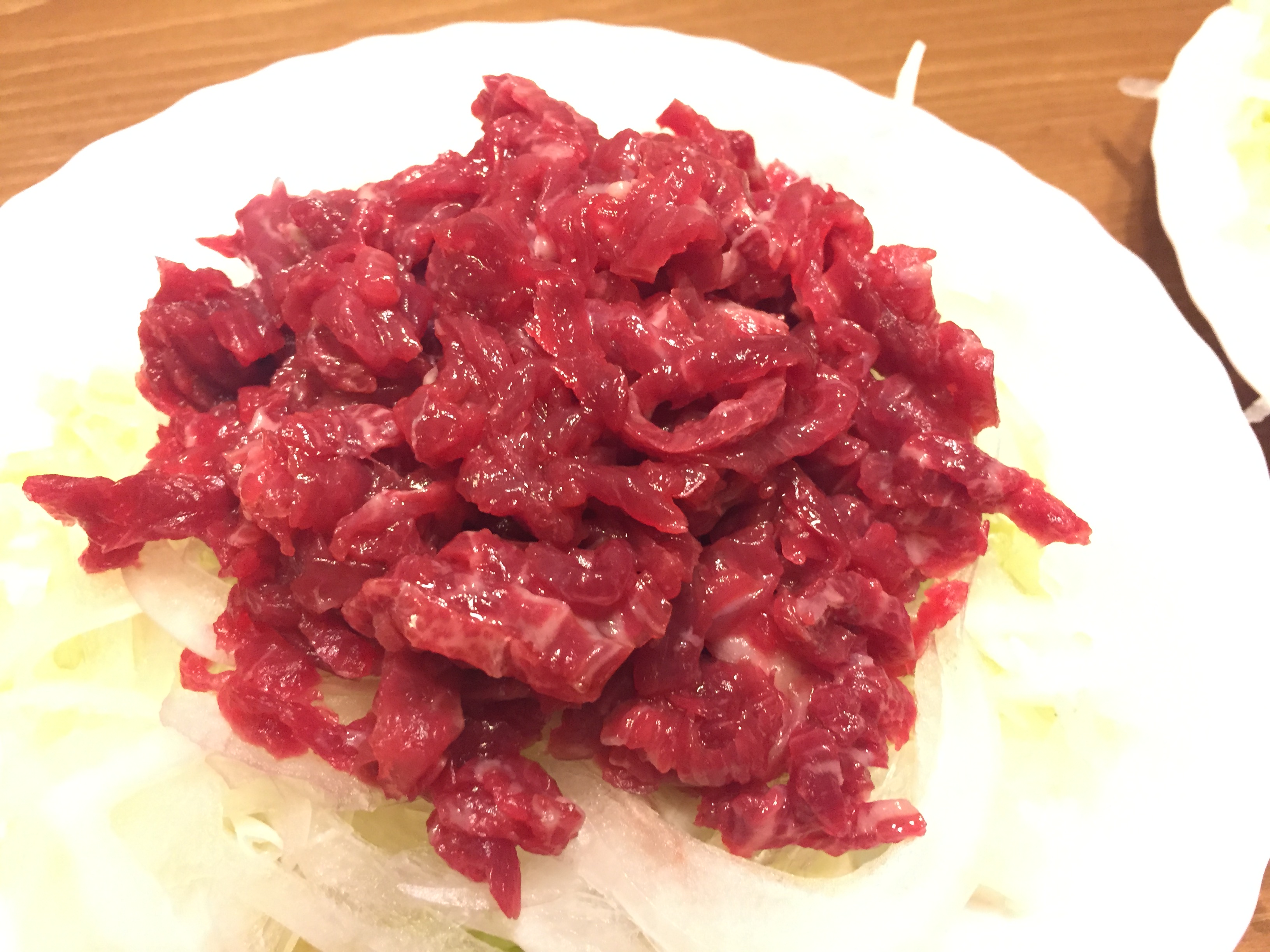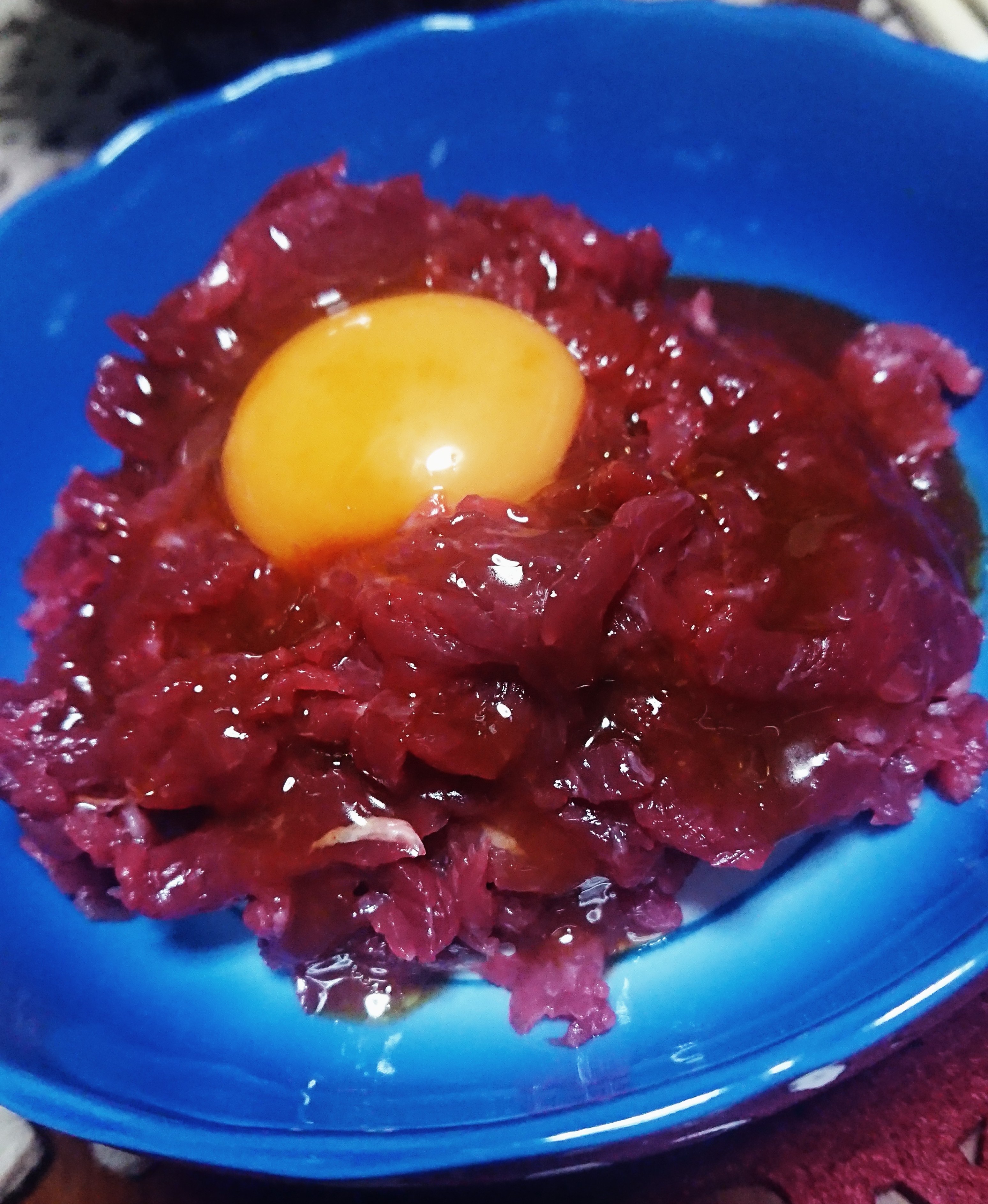 プラス卵の黄身を上に乗せると、タレのスパイスさと黄身の甘さが融合して、甘辛な丁度良い味になり、馬刺しユッケと相性抜群です。