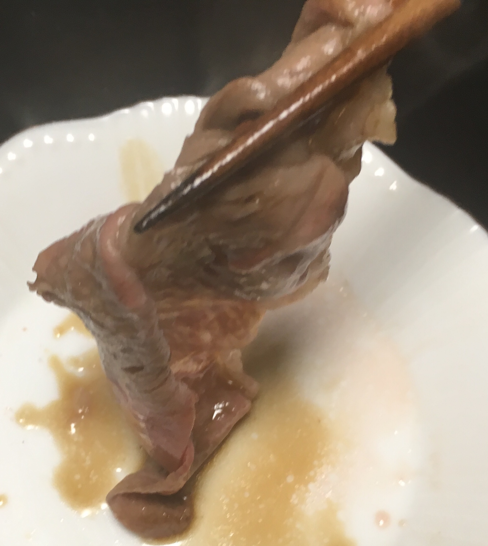 美しい霜降りで、とにかく柔らかく、口の中に入れるととろけてなくなります。とても甘くて旨味があって極上の松阪牛です。