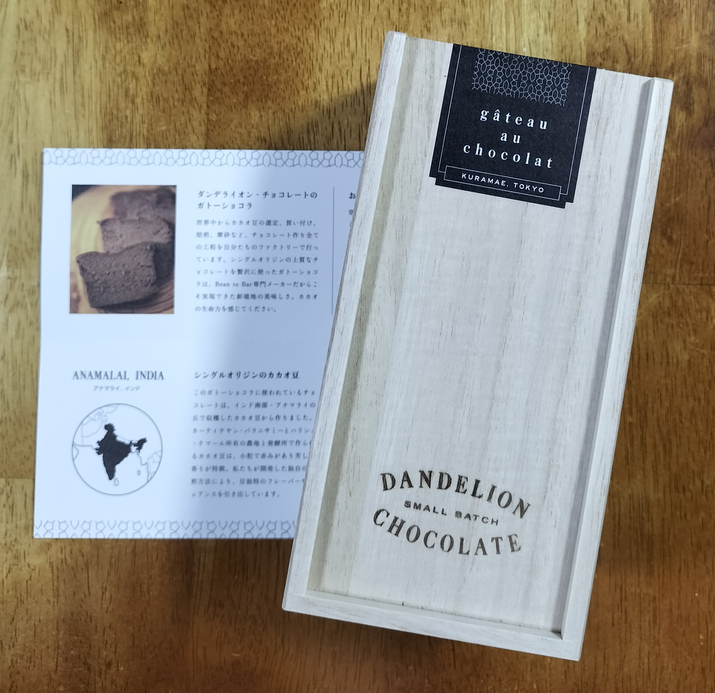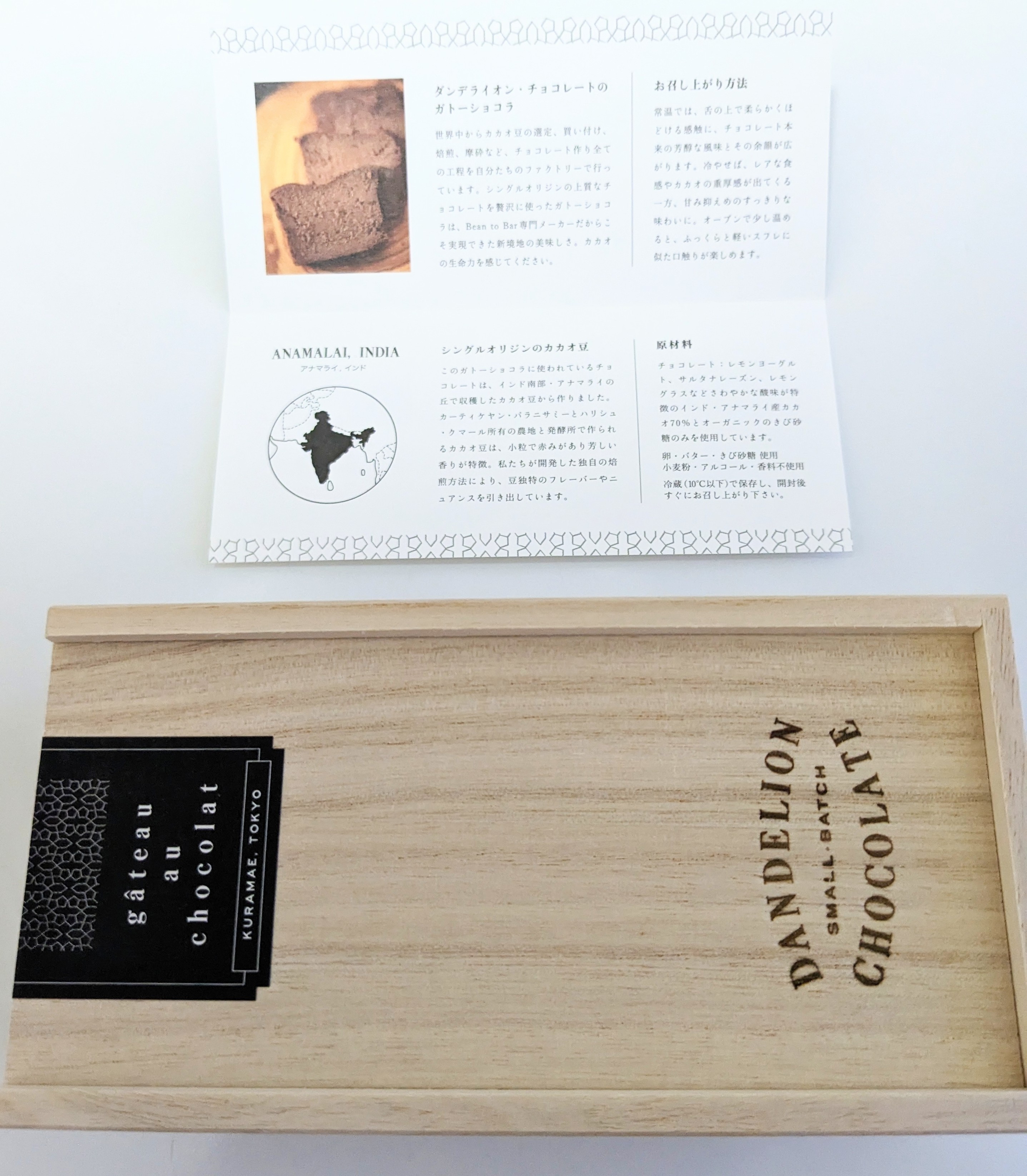 レモンヨーグルト、サルタナレーズンなどの味わいを持つインド産カカオ豆から製造したチョコレートを使用した「ガトーショコラ」です。チョコレート、きび砂糖、たまご、無塩バターのみを使ったグルテンフリー商品。常温で食べると、舌の上で柔らかくほどける食感で、豊かなチョコレート本来のフレーバーの余韻を長く堪能できます。冷やして食べると、レアな食感やカカオの重厚感が増し、甘みを抑えたすっきりした味わいを楽しめます。オーブンで温めると、ふっくらと軽いスフレのような口触りを感じられます。クラフトマンシップを感じられる上質な木箱に入って届くので、贈り物にもお勧めです。