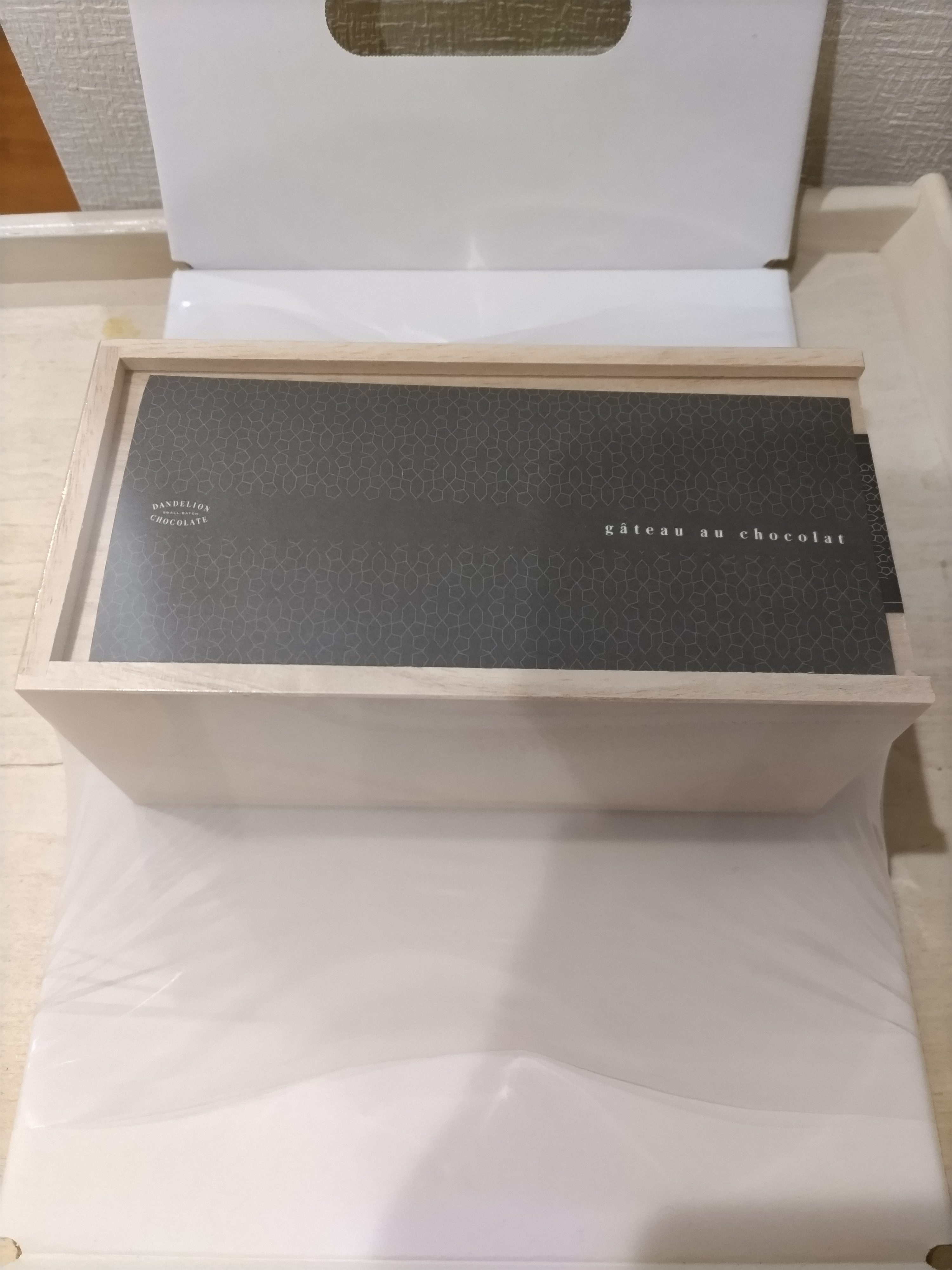 ガトーショコラはとっても上質な桐の箱に入っていて箱の上には上品にデザインされた黒いラベル箱の下には店名のロゴの焼き印が入っておりシンプルながらも高級感がいっぱい。