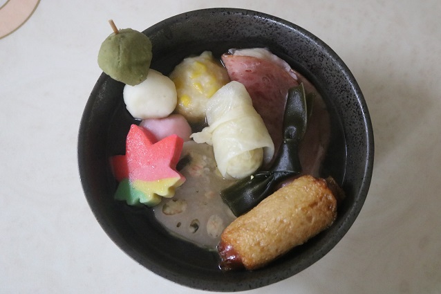 「竹棒麩」は、緑色も鮮やかな生麩で作られた具材。紅葉麩とともにおでん鍋に彩りをあたえてくれました。生麩好きな私にはうれしい具材でした。
