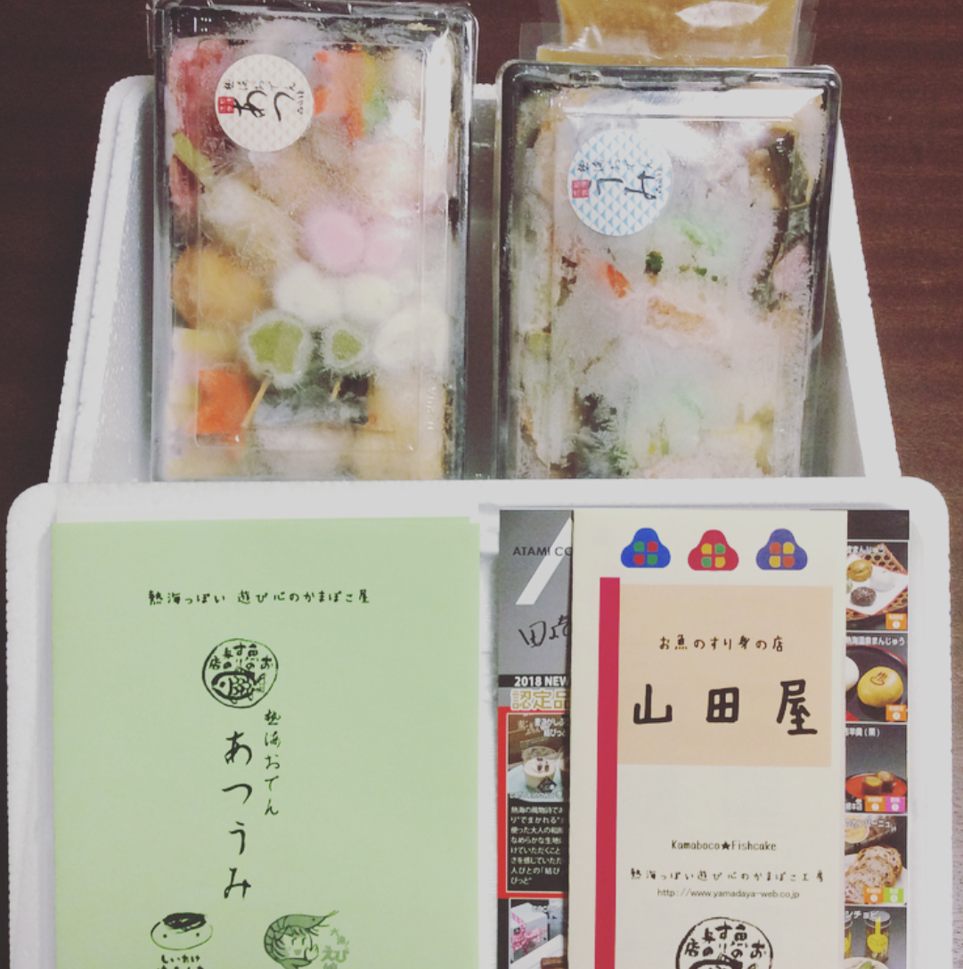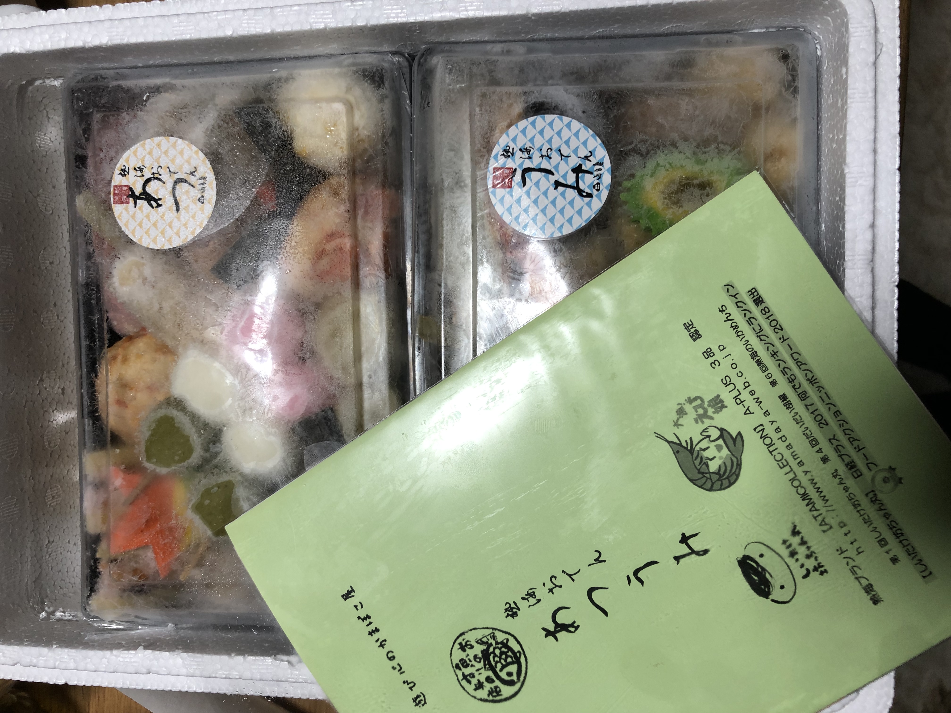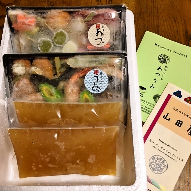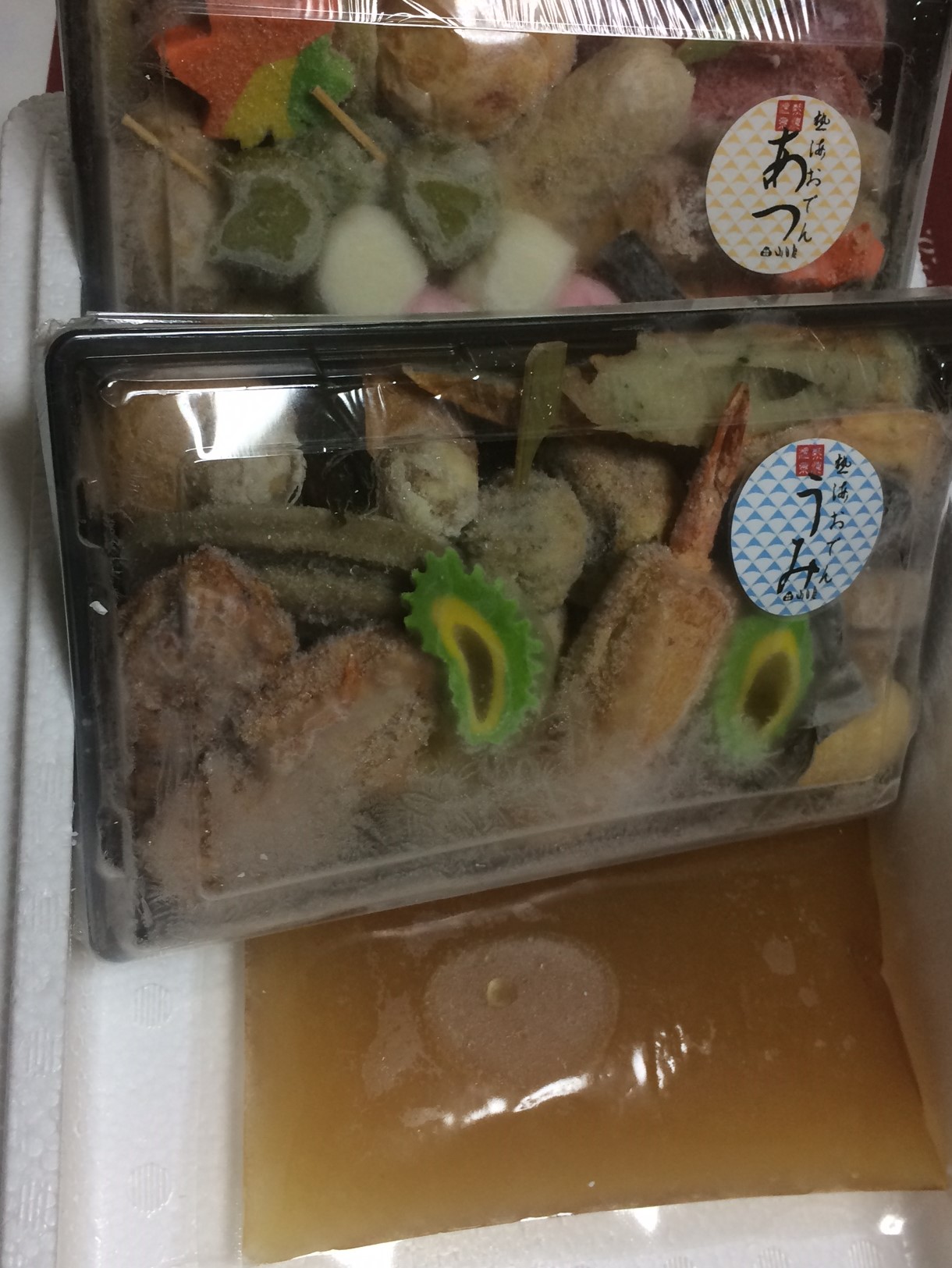 発泡スチロールには「あつ」と「うみ」の2パックのカラフルなおでん種が冷凍状態で入っていて、底部分にはおでん汁も2パック入っていました。