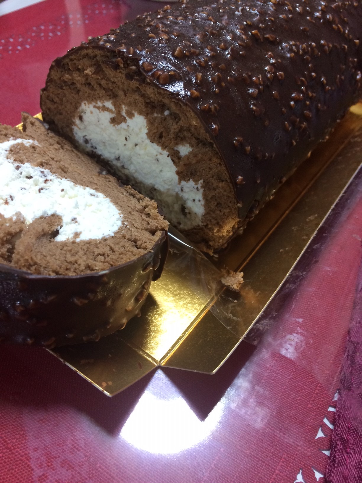 チョコレートを練り込んで焼き上げた生地でチョコチップを忍ばせたクリームをくるっとひと巻き。アーモンドを混ぜ合わせたチョコレートでコーティングしました。中はふわふわ、外はカリッとした食感の楽しいケーキです。カカオの風味を心ゆくまで味わえる、チョコレート好きにはたまらないひと品です。