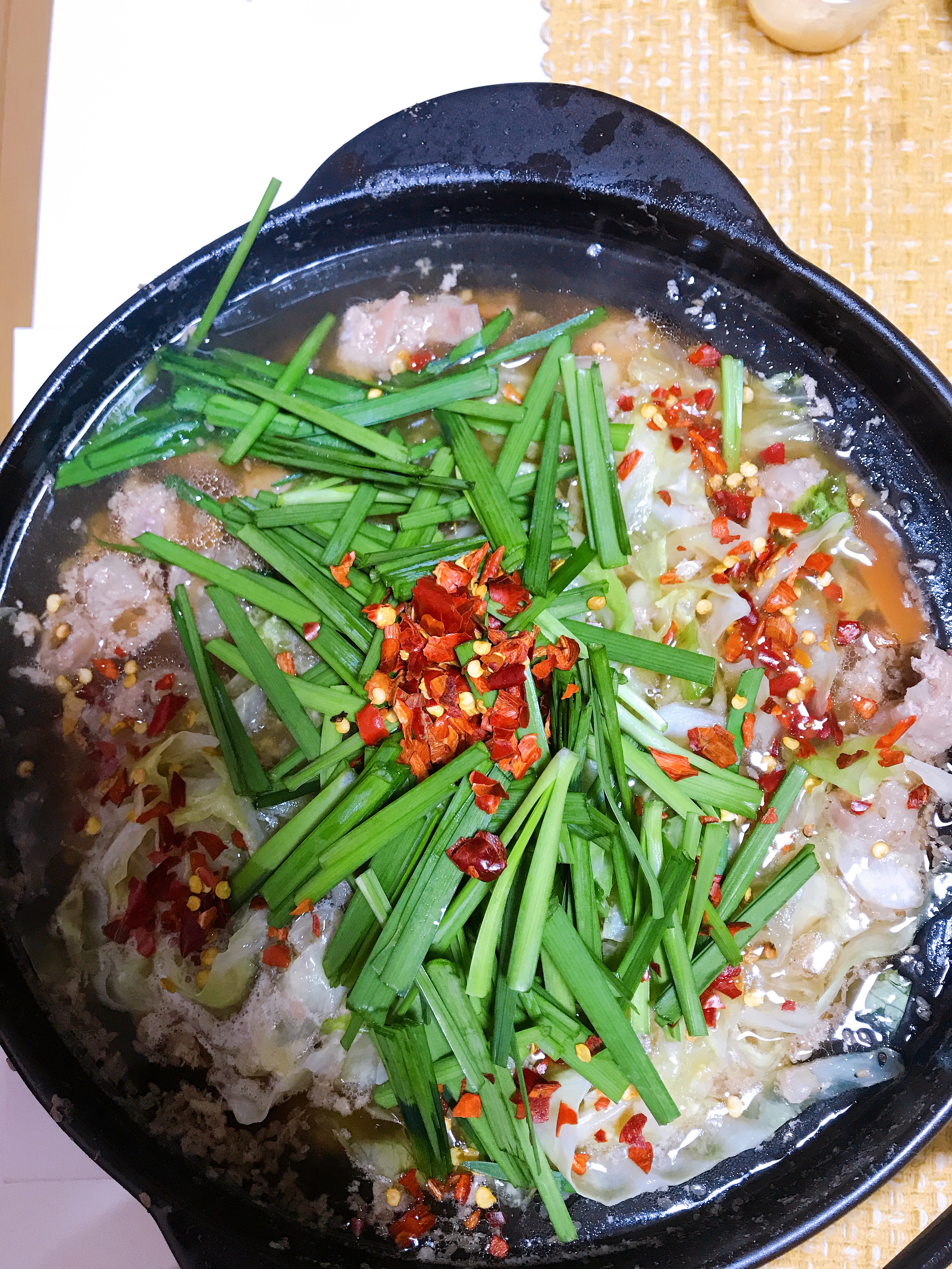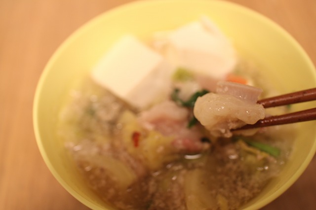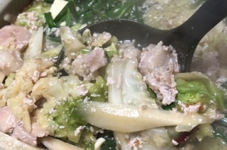 今回は到着して2日以上経って食べる事になり、スープやもつは事前に火を通した後に保存していたので、当日はキャベツが煮えたらすぐに食べ始める事が出来ました。