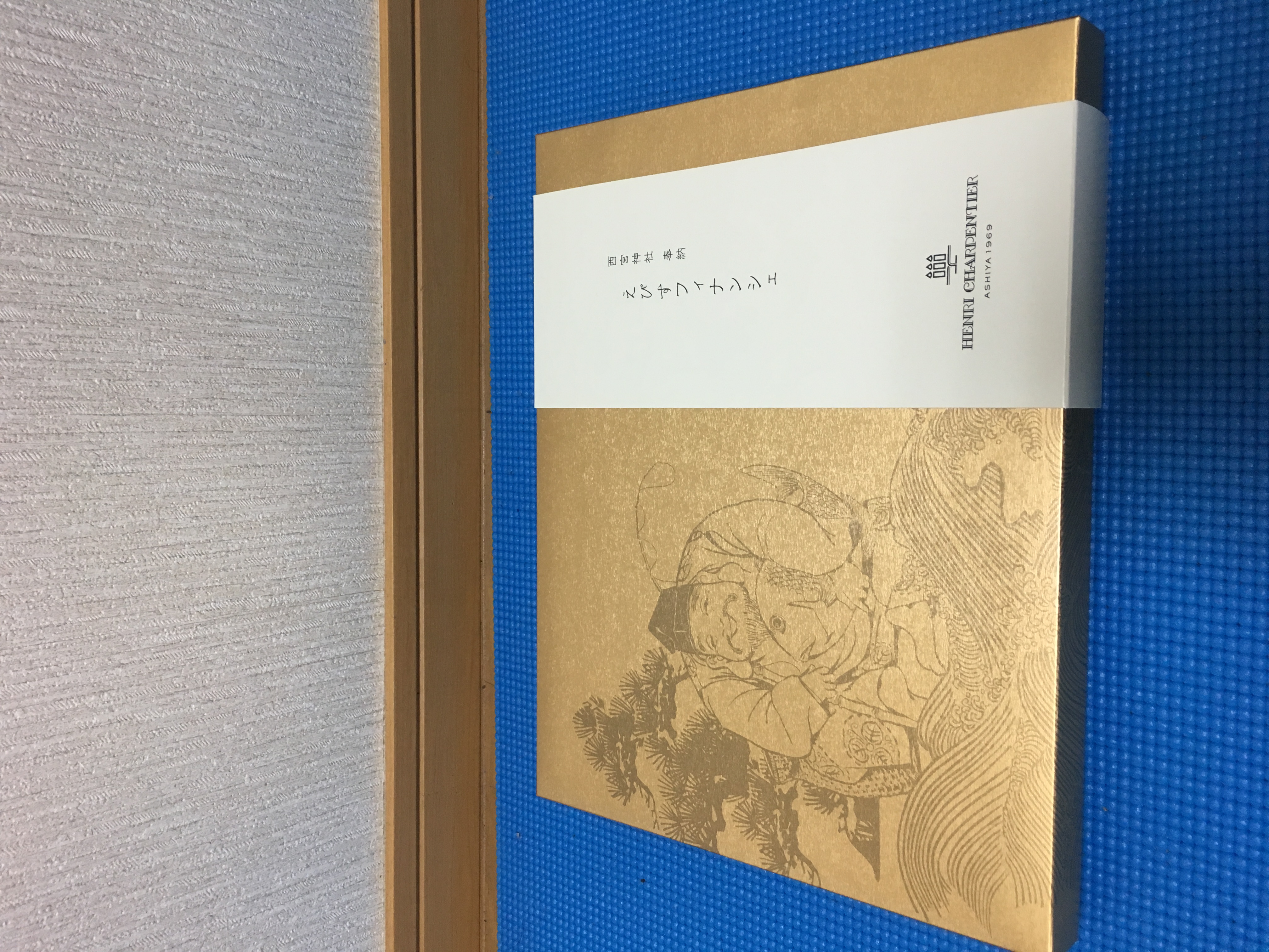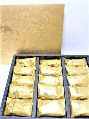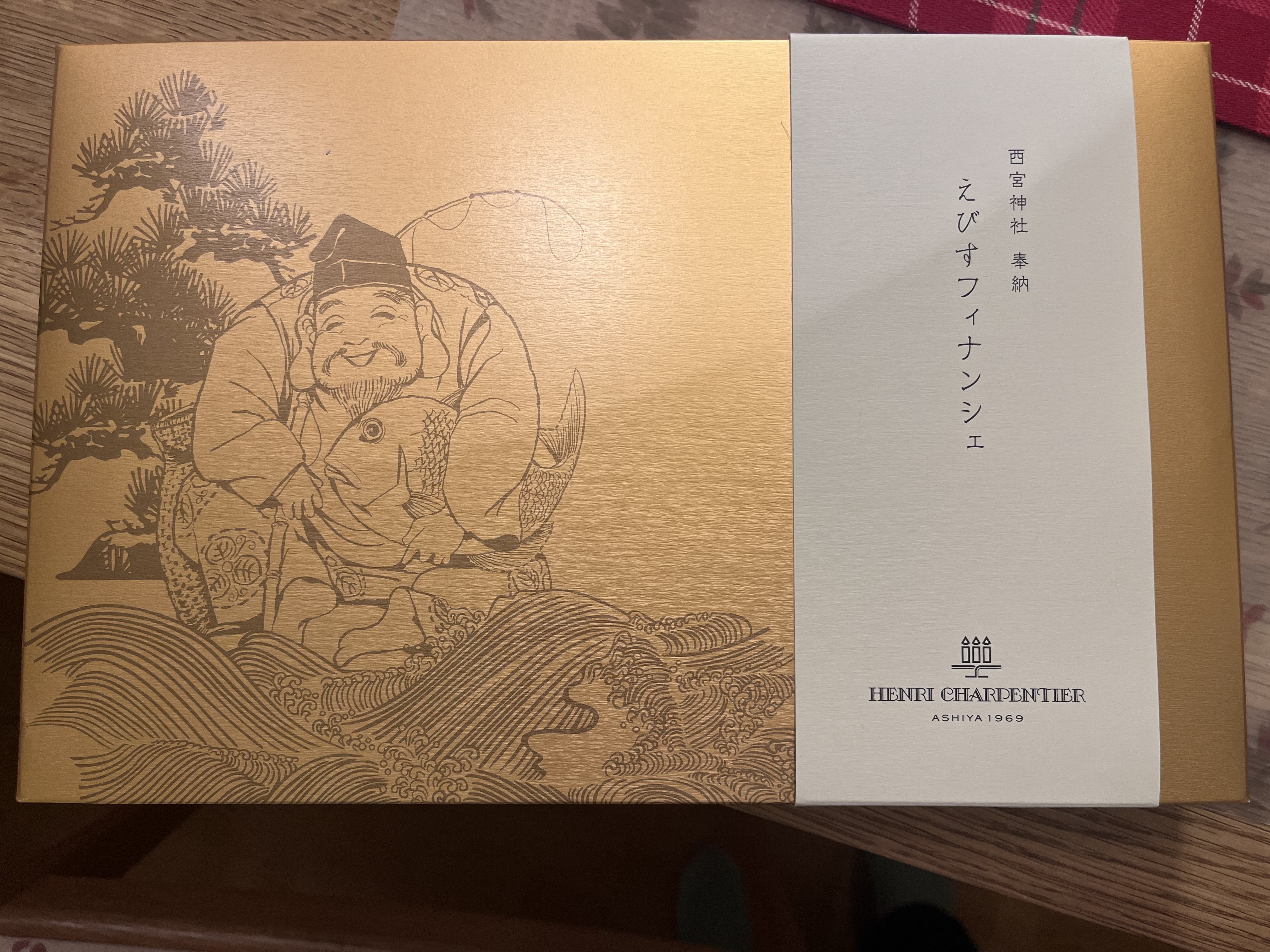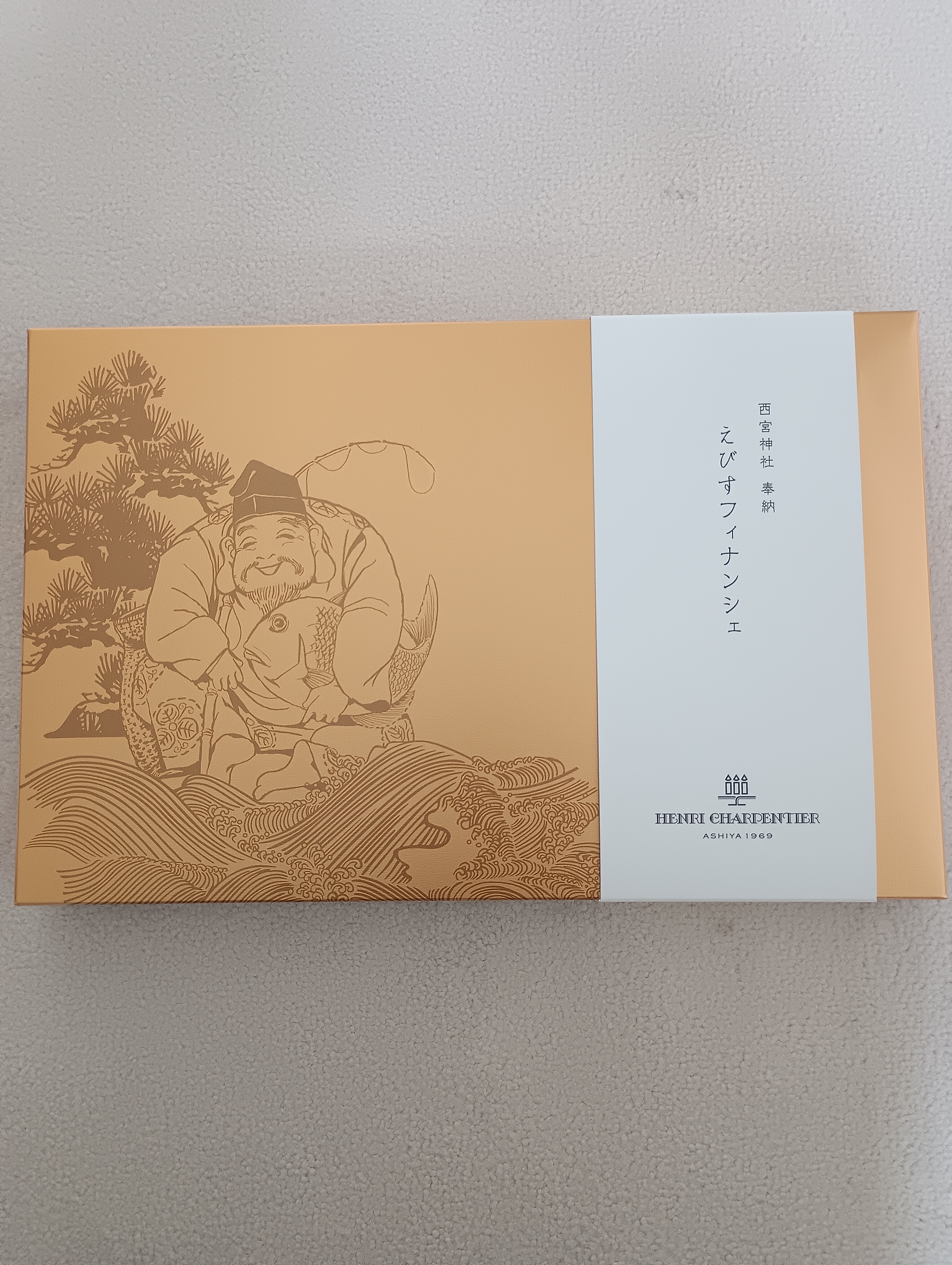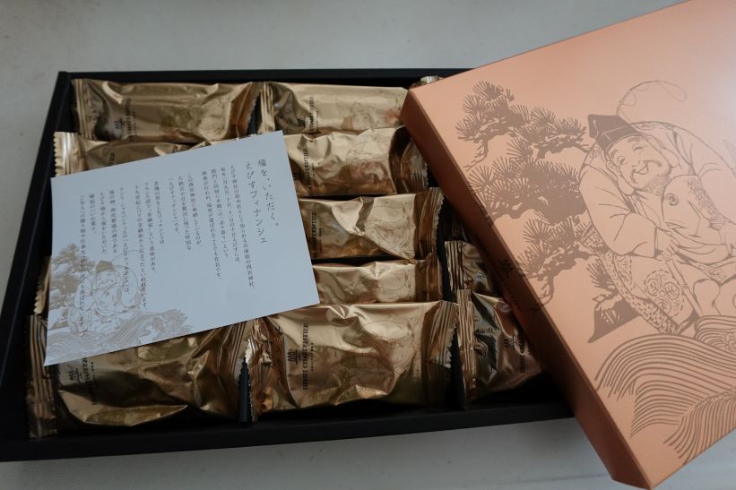 毎年福男を決めることで有名な西宮神社は、アンリ・シャルパンティエの工場のすぐ近くにあります。その縁もあり、毎月1日に食べる方の幸せと商売繁盛を祈願して奉納しています。パッケージも金色と、えびす様のイラストでおめでたい贈りものにはぴったりです。お祝いや、縁起菓子としてお使いください!