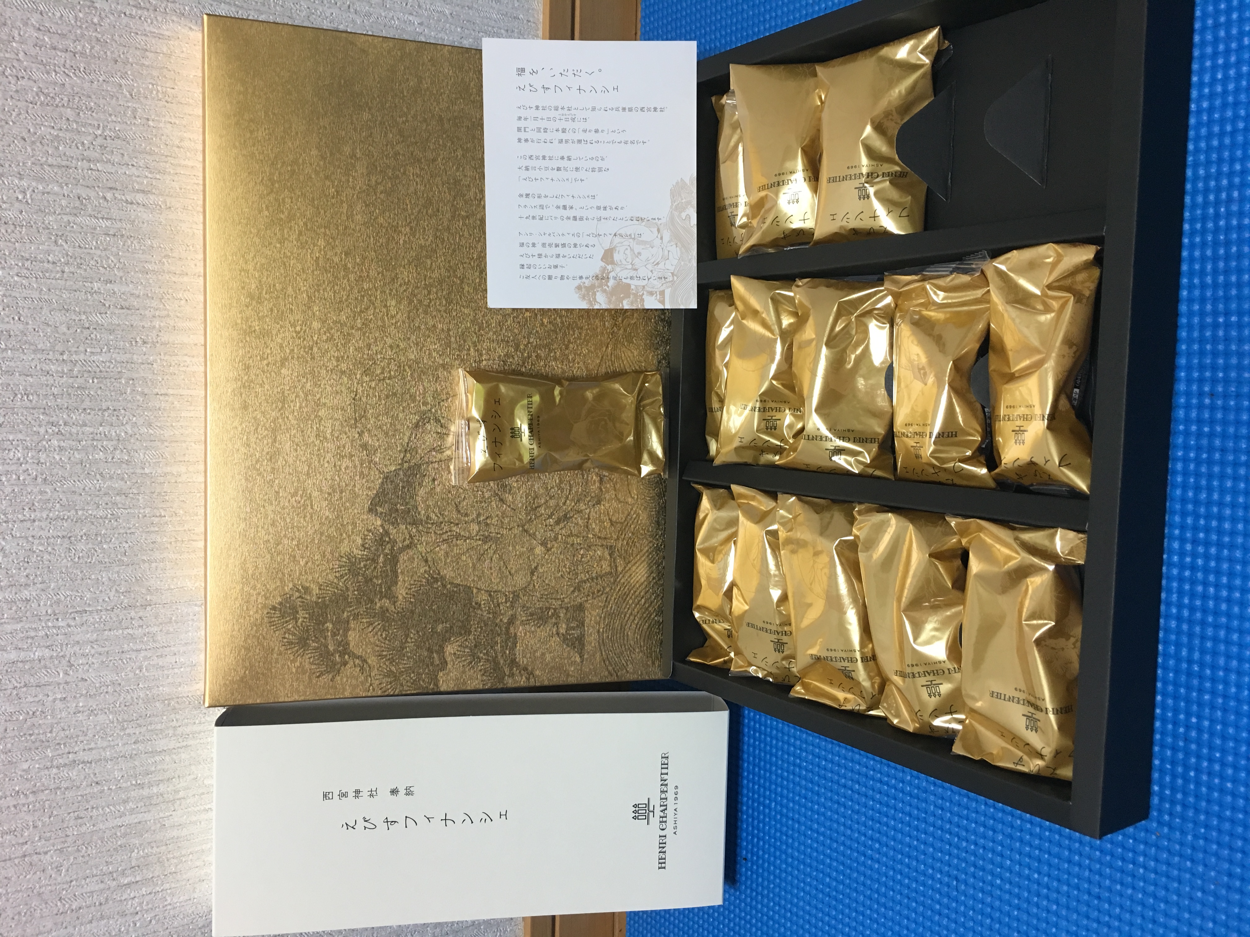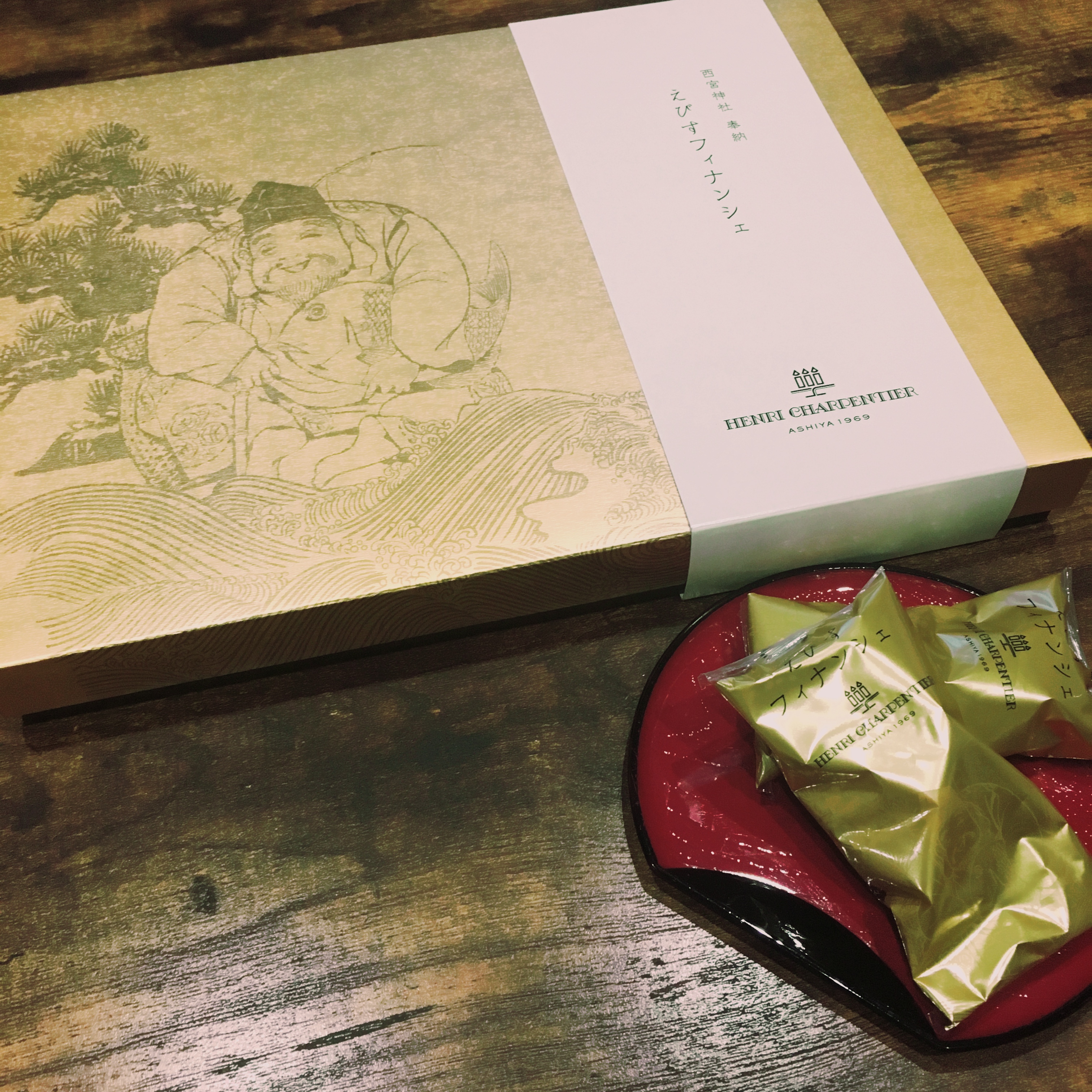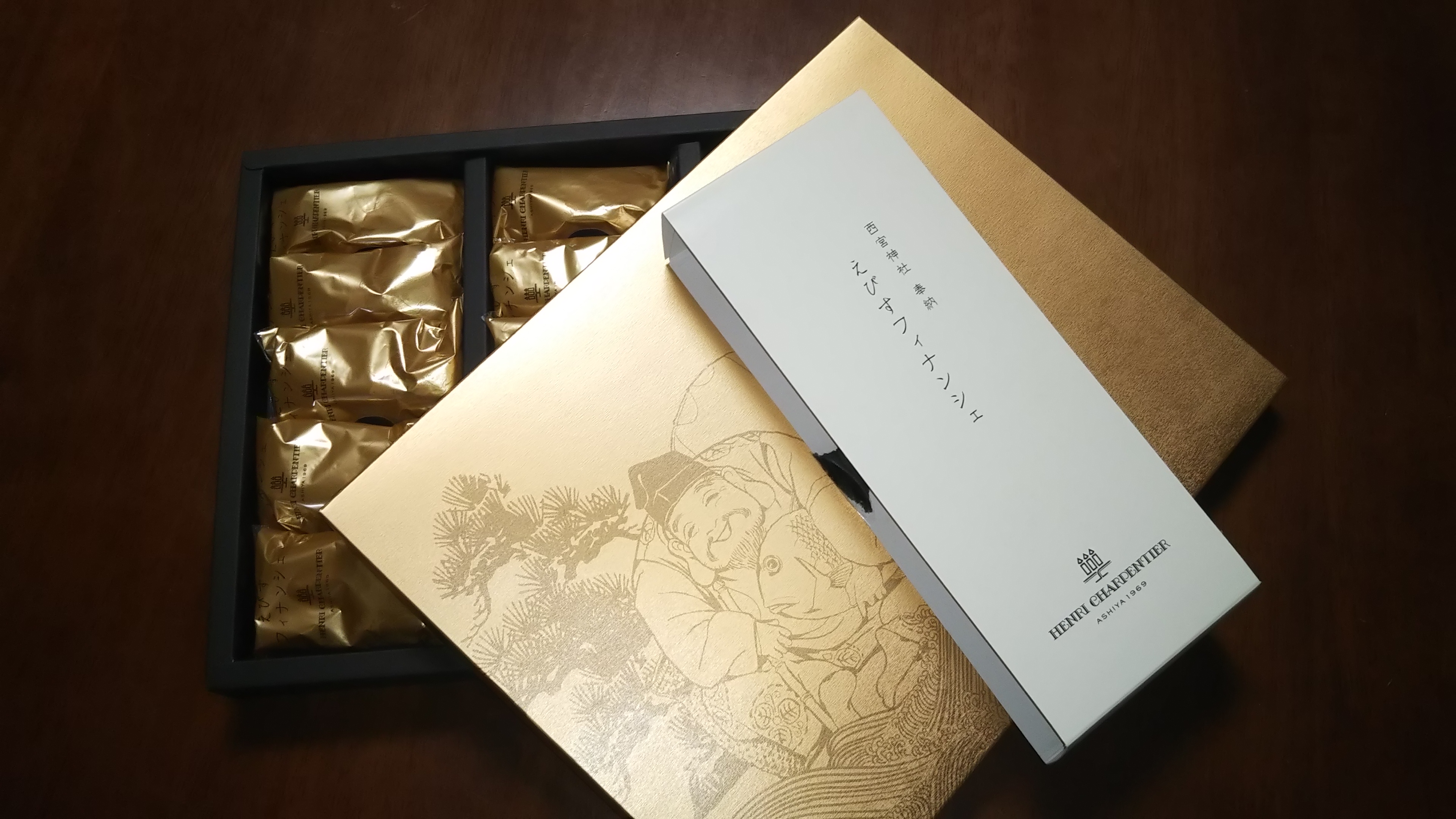 毎年福男を決めることで有名な西宮神社は、アンリ・シャルパンティエの工場のすぐ近くにあります。その縁もあり、毎月1日に食べる方の幸せと商売繁盛を祈願して奉納しています。パッケージも金色と、えびす様のイラストでおめでたい贈りものにはぴったりです。お祝いや、縁起菓子としてお使いください!