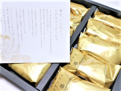 幸せと商売繁盛を祈願した「フィナンシェ」です。古くから縁起の良い食べ物とされる大納言小豆を生地に練り込み、香ばしく焼き上げています。毎月一日に福の神・えびすさまをお祀りする西宮神社に奉納されている商品で、福々しい恵比須さまのイラストが入った金色のボックスに入って届くため、贈ってもうれしく、贈られてもうれしい奉納菓子です。