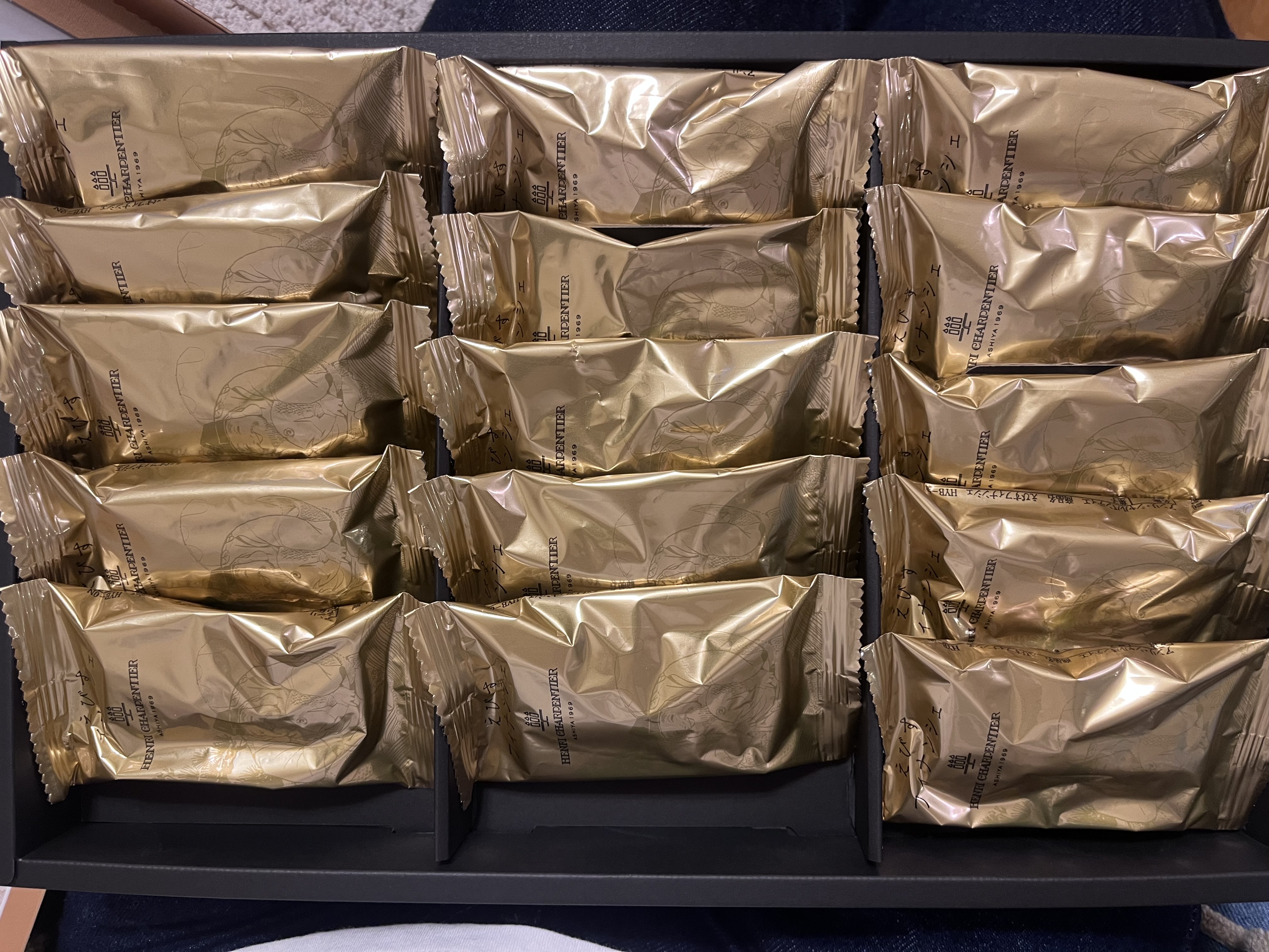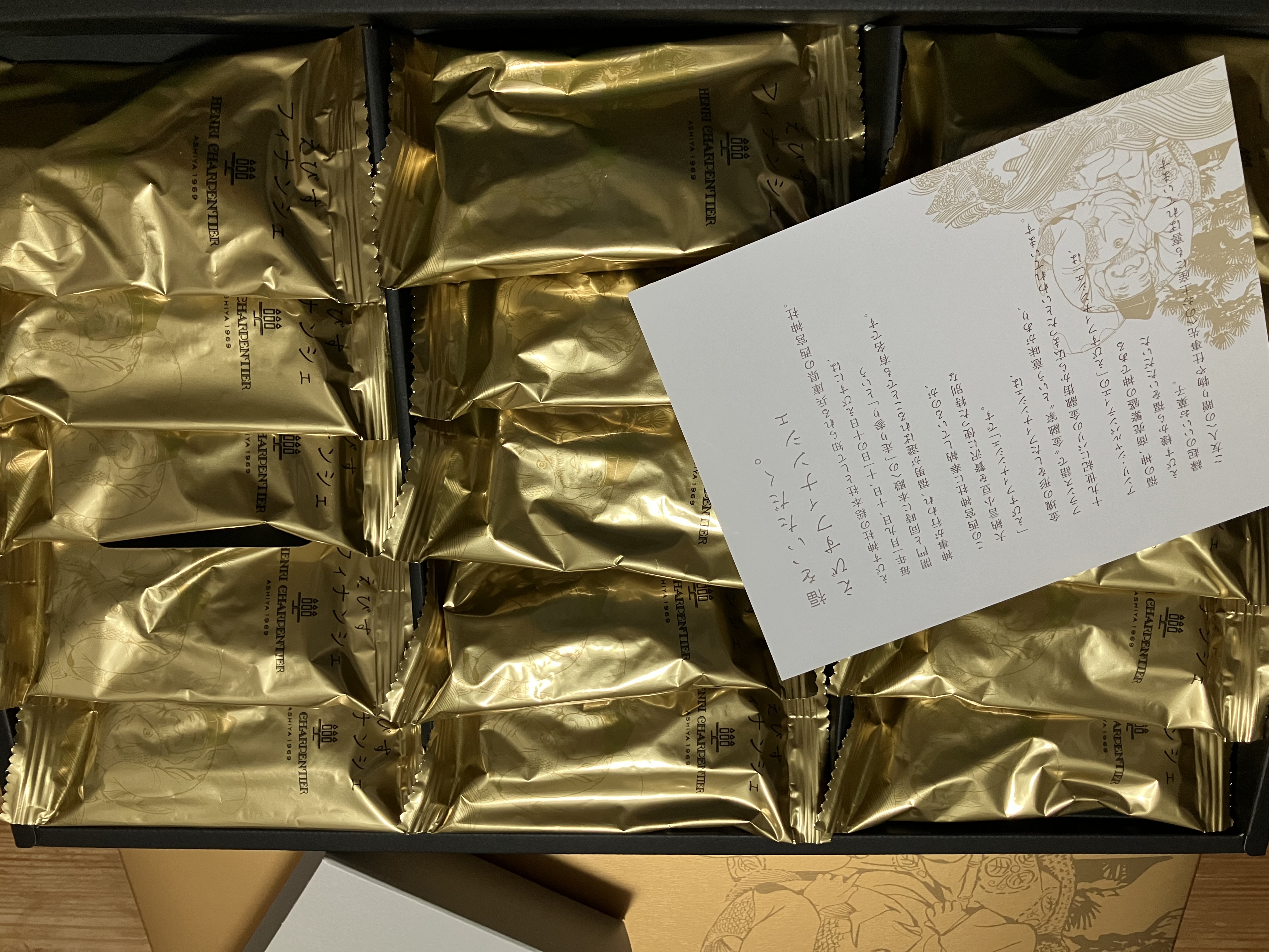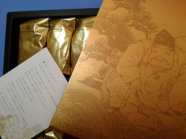 思わず笑ってしまうほど金の箱 笑 開けてビックリ!中の個包装にも外箱と同じ えびす様のデザイン。そして、金 金 金!!