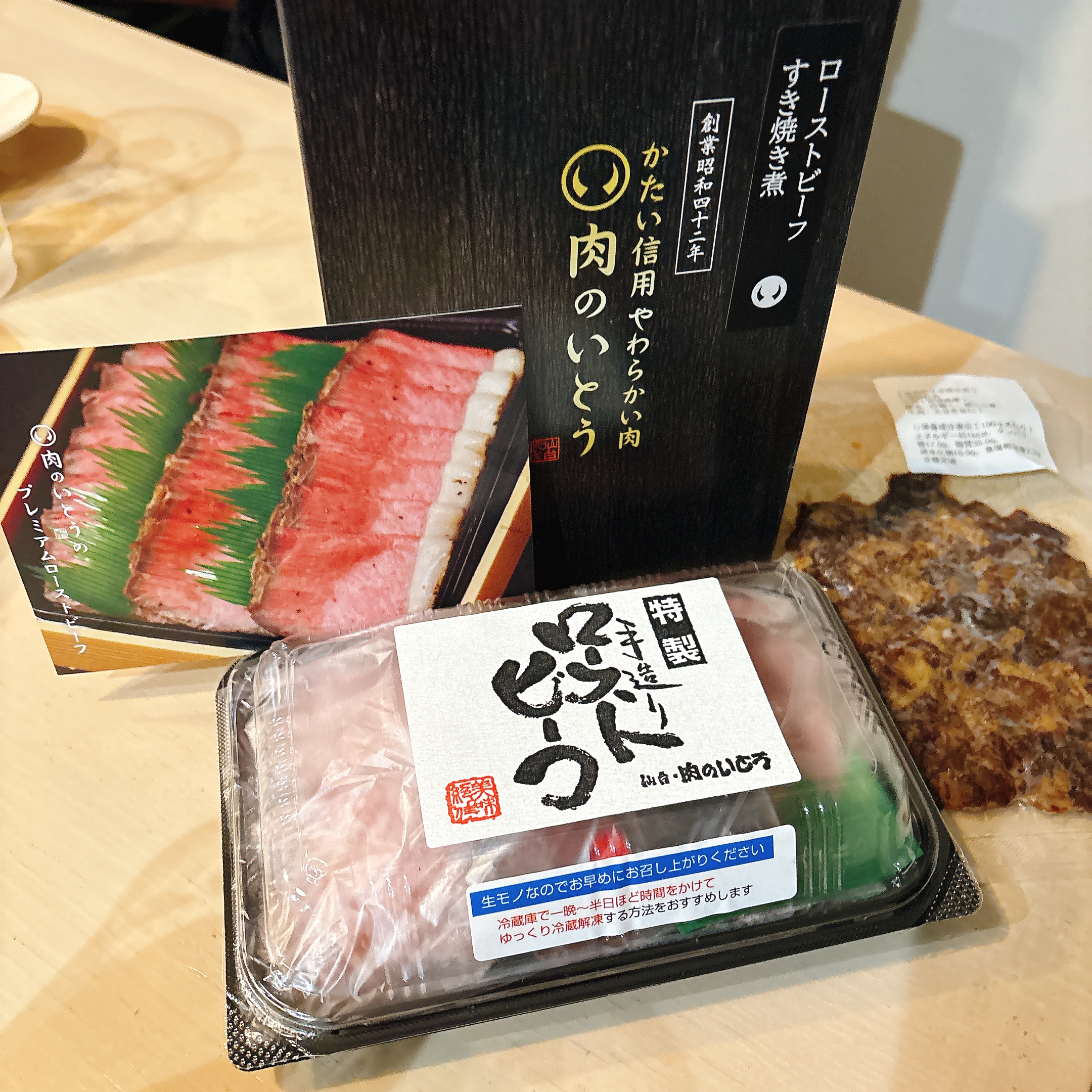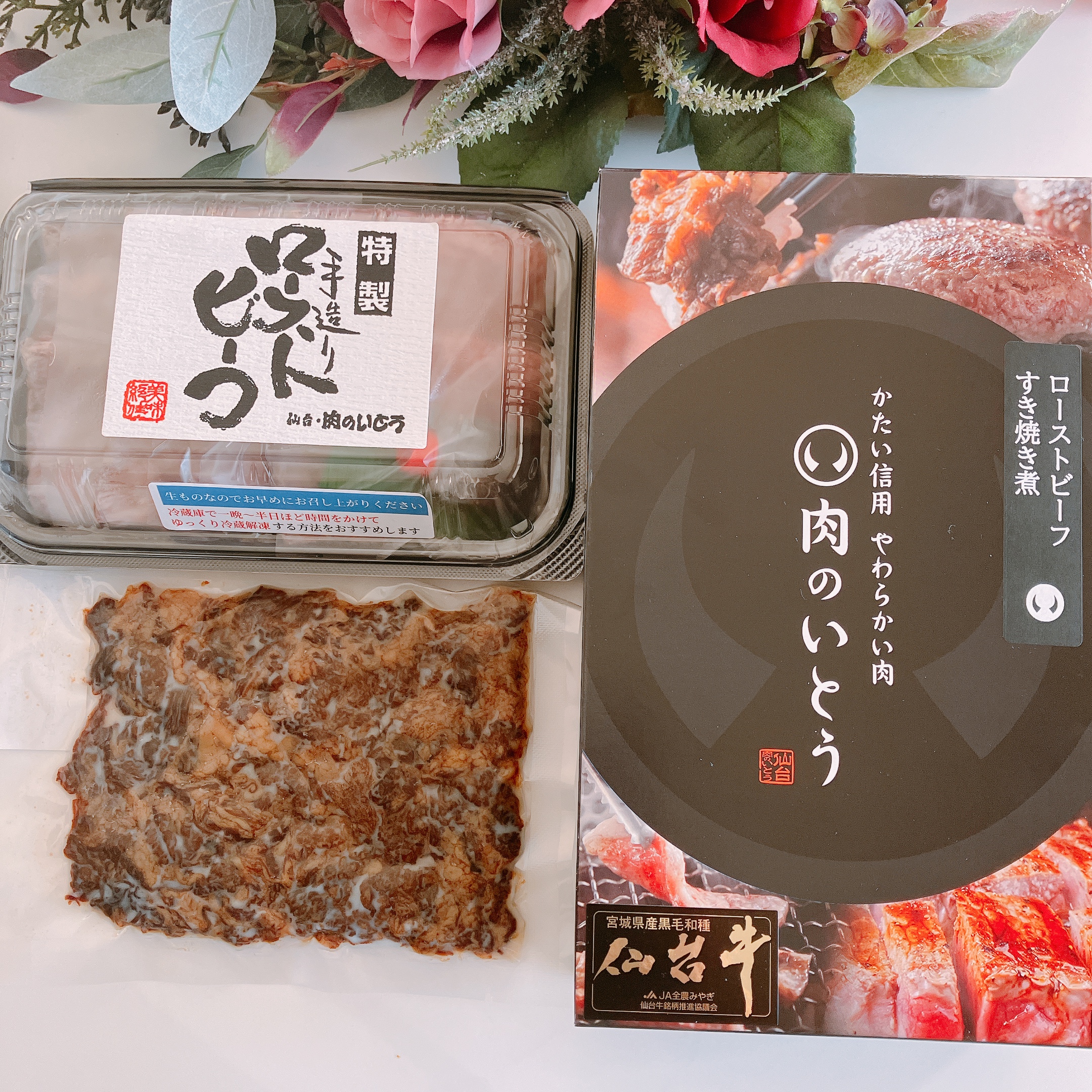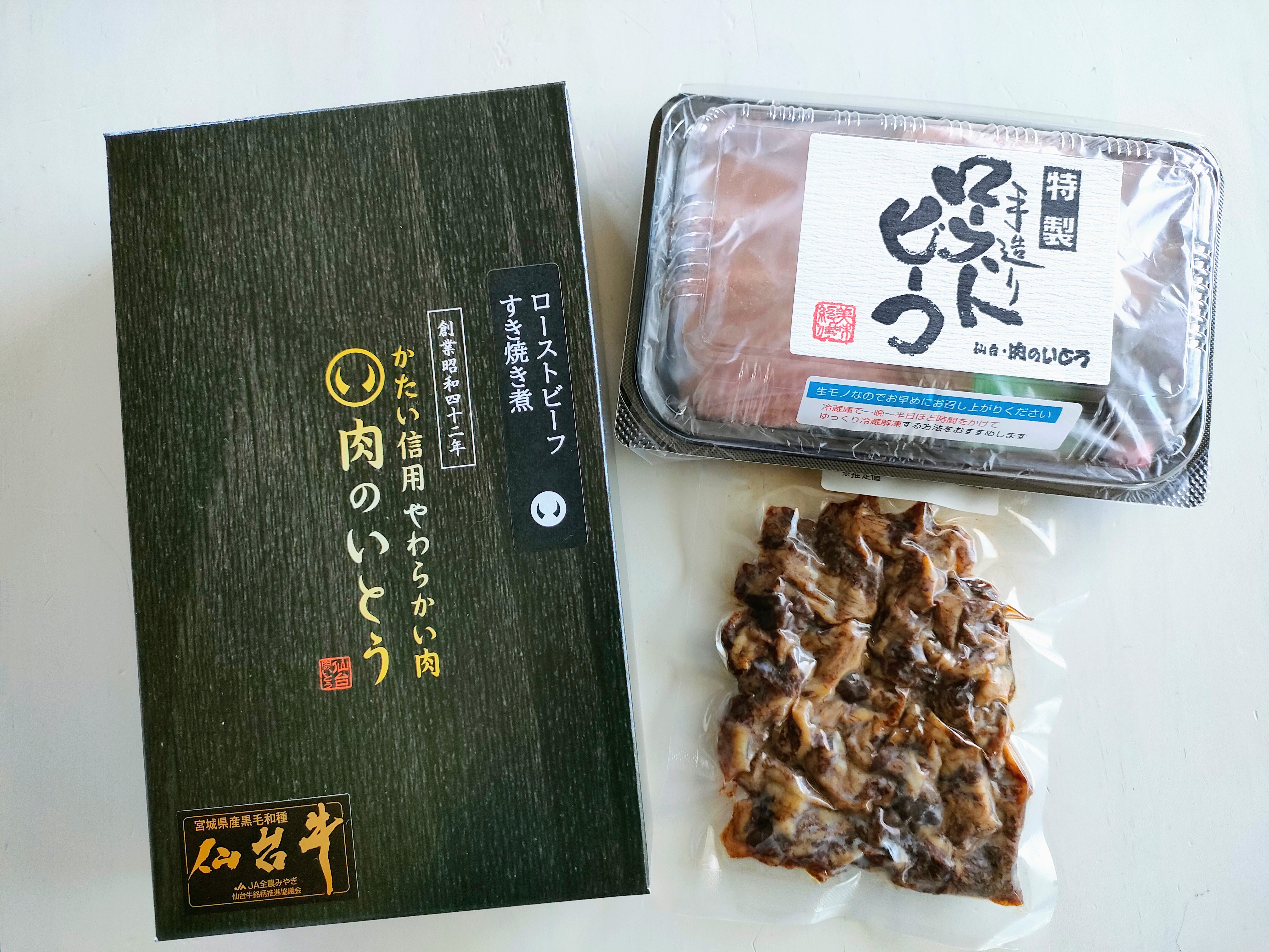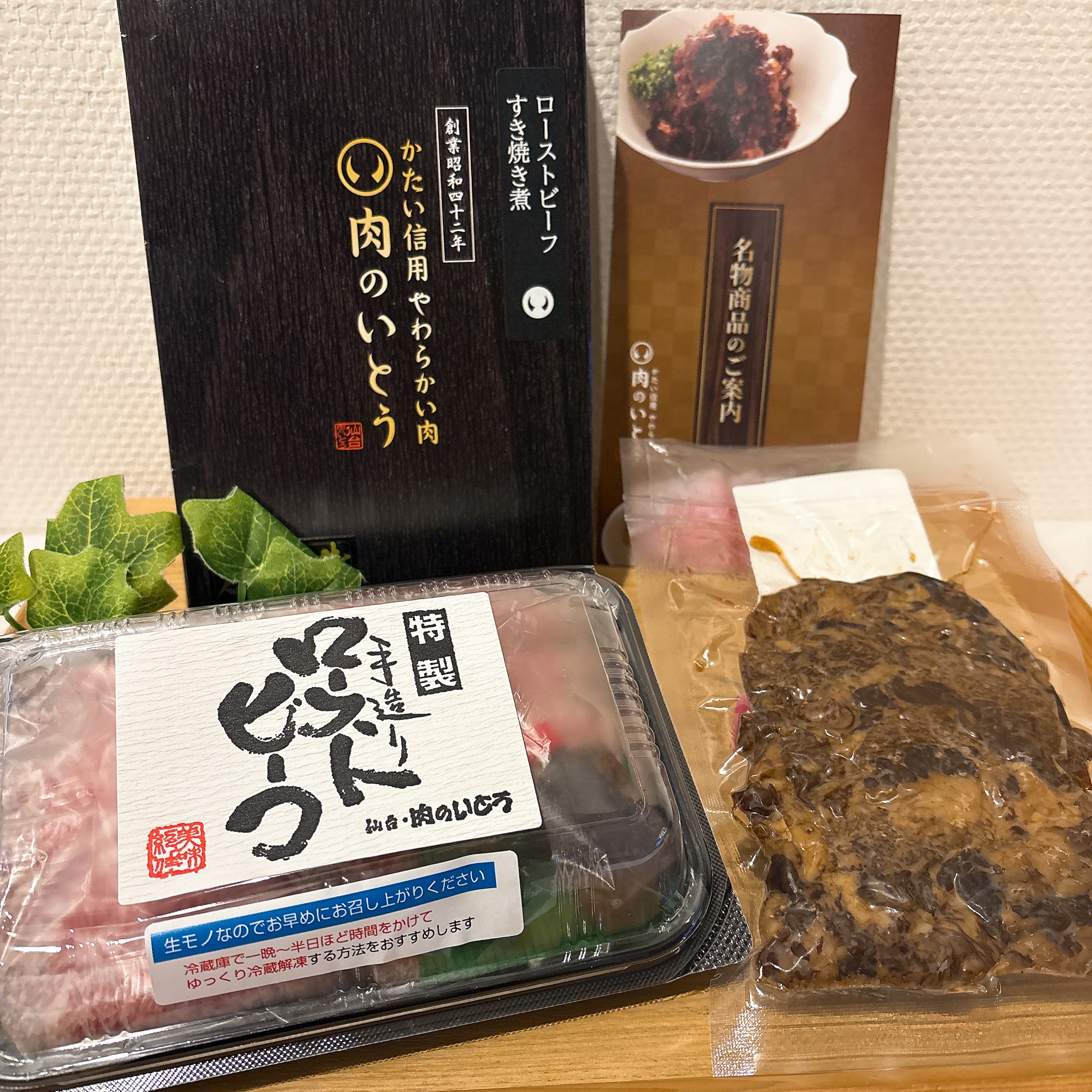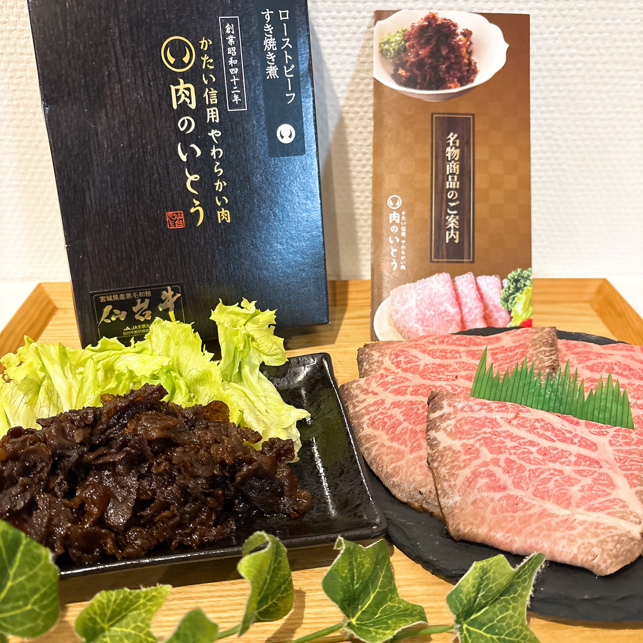 創業50有余年、肉のいとう手作りの人気の2つの商品をあわせて食べられるセット商品となっています。ローストビーフは解凍してお召し上がりいただけます。すき焼き煮は湯煎かレンジで、熱々の御飯の上に乗せて、おにぎりの具、卵に巻いて、など様々なアレンジでお召し上がりいただけます。