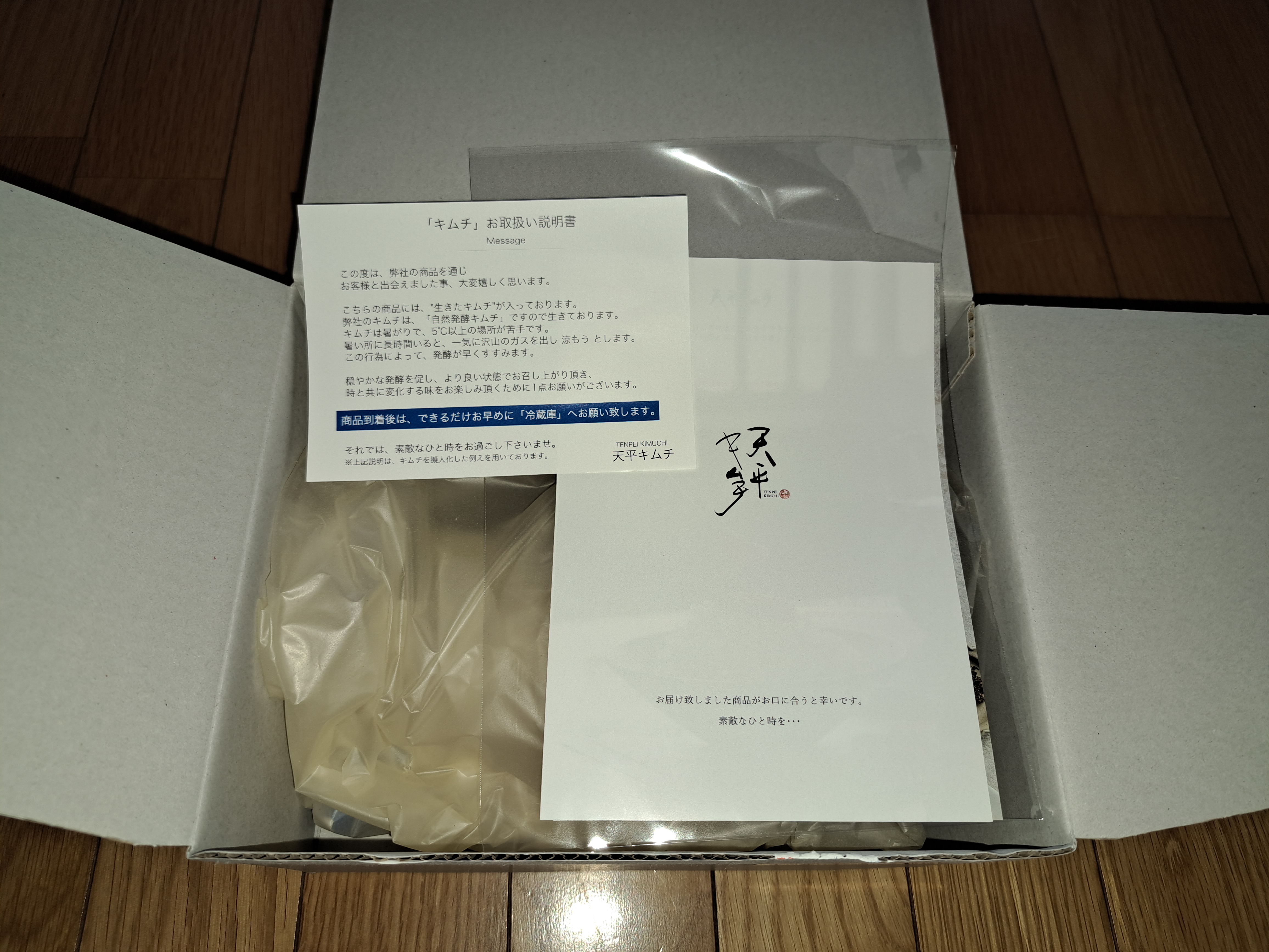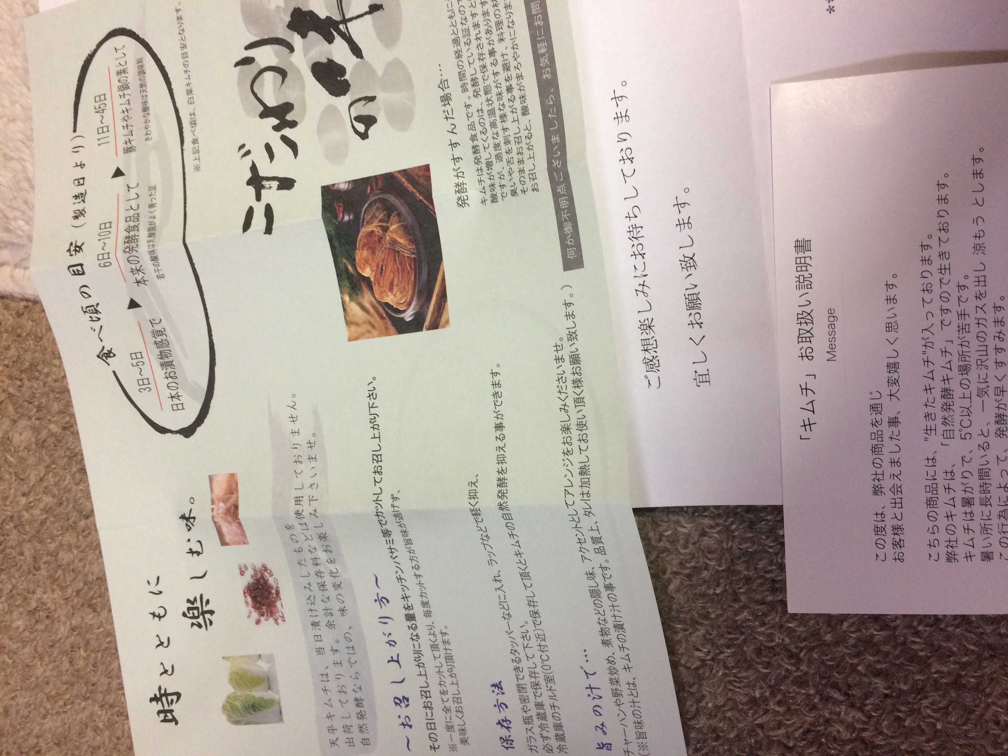 キムチの取扱説明書も入っており自然発酵キムチで生きているため5度以上の場所が苦手で一気に沢山のガスを出し涼もうとすることで発酵が早くすすむ とのこと。