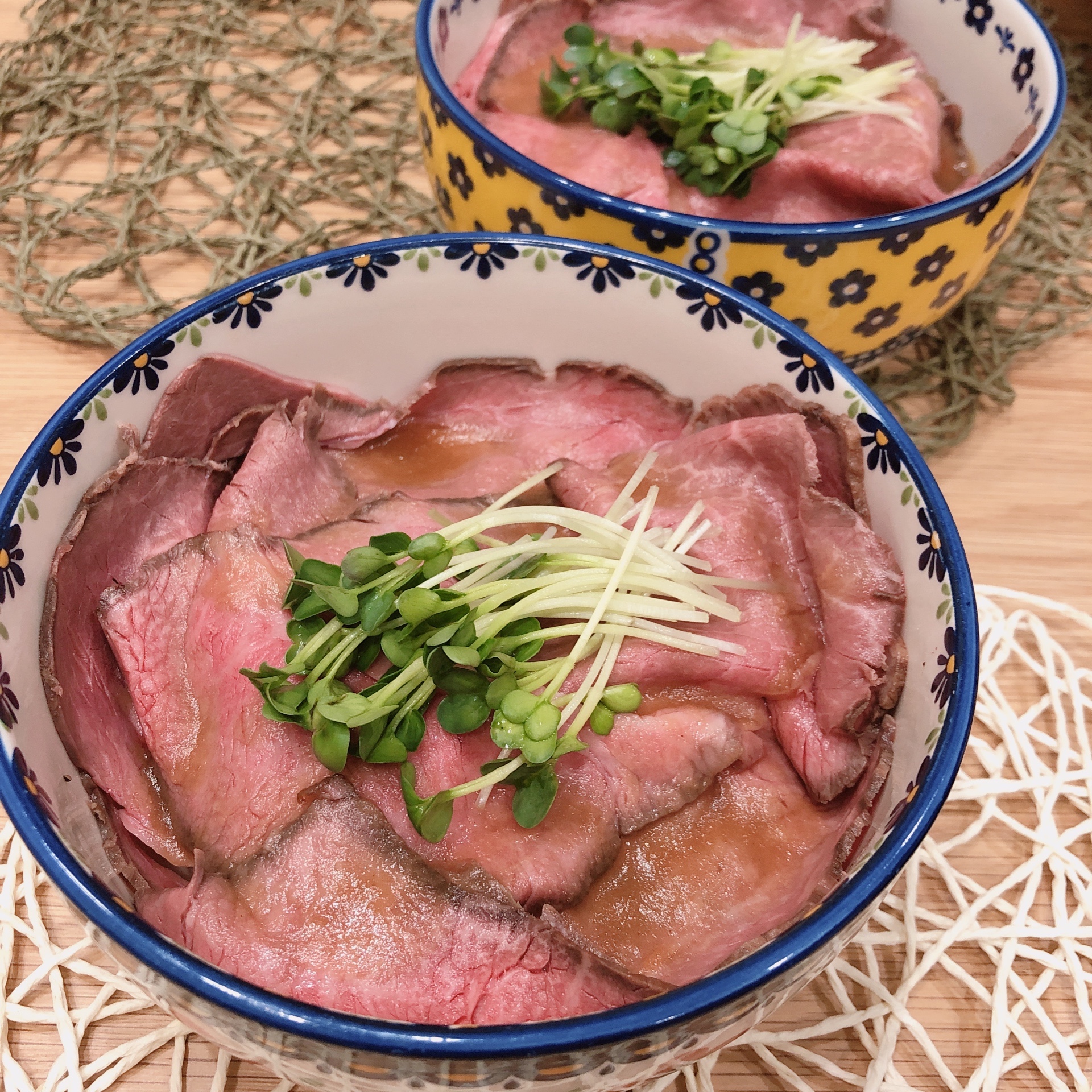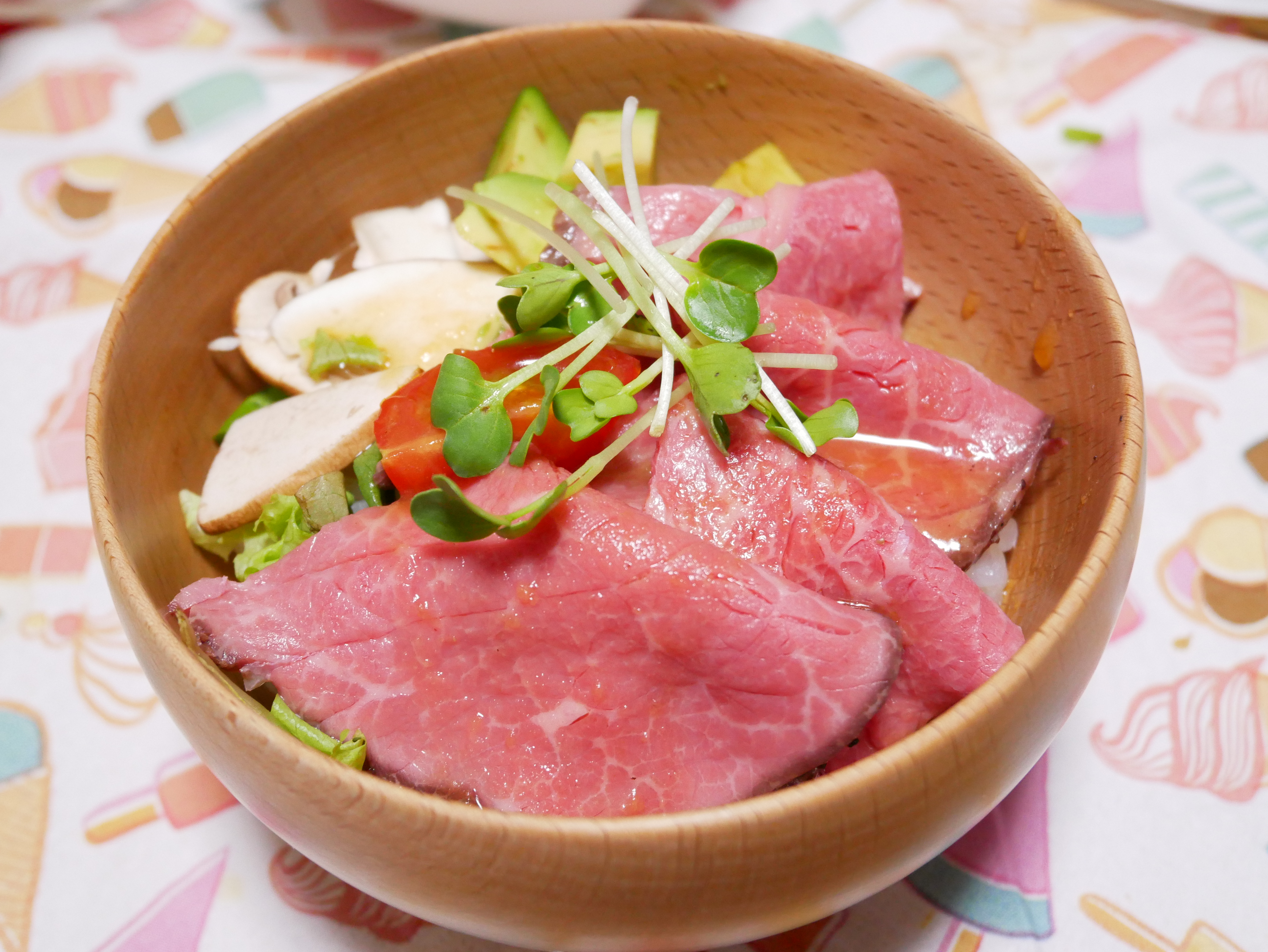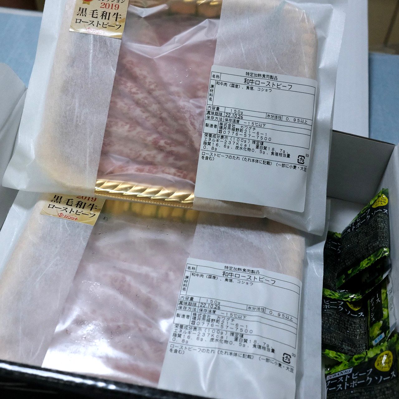 お取り寄せグルメ、和牛ローストビーフ。2パック入りだったので、ローストビーフ丼やバケットとしても楽しめる他、お寿司にしても美味しそうです。