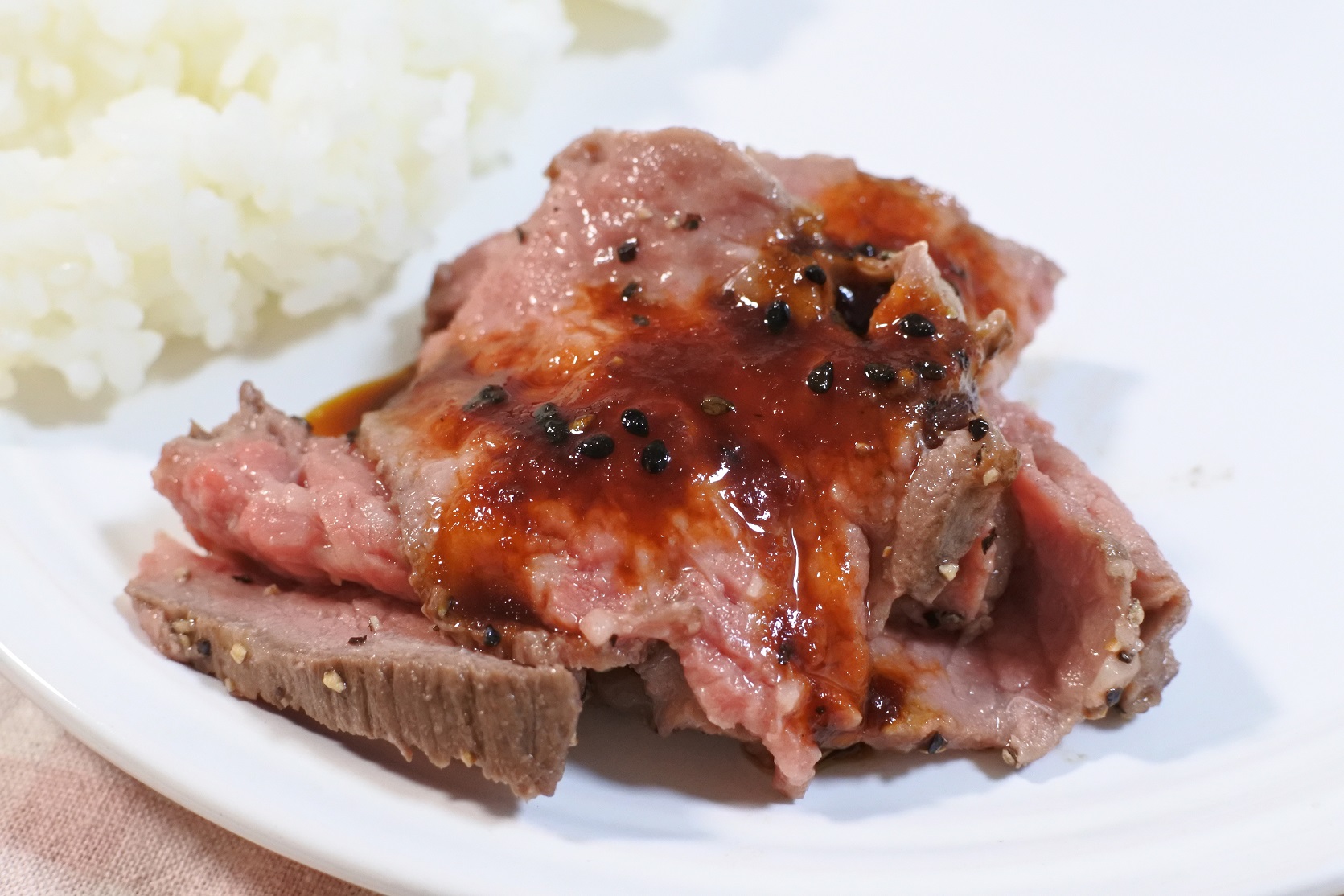 A5ランクの黒毛和牛肉、内もも肉のロ-ストビ―フです。サーロインに比べ、高タンパク低脂肪でヘルシーな赤身肉が特徴で、脂身が苦手な人にもおすすめです。ボジョレーのような、少し甘みを感じる赤ワインとの相性抜群。 ロ-ストビ―フのスライスを、炊き立ての熱々のご飯の上に一枚置き、好みのソ-スを少し少し垂らしてご飯を巻くように食べると絶品です。ご飯の温かさでロ-ストビ―フがほんのりと温まり、出来立ての味と香りが甦り、極上の美味しさを楽しめます。切り方や食べ方の書いてある冊子が同梱してあるので、初めてでも安心です。