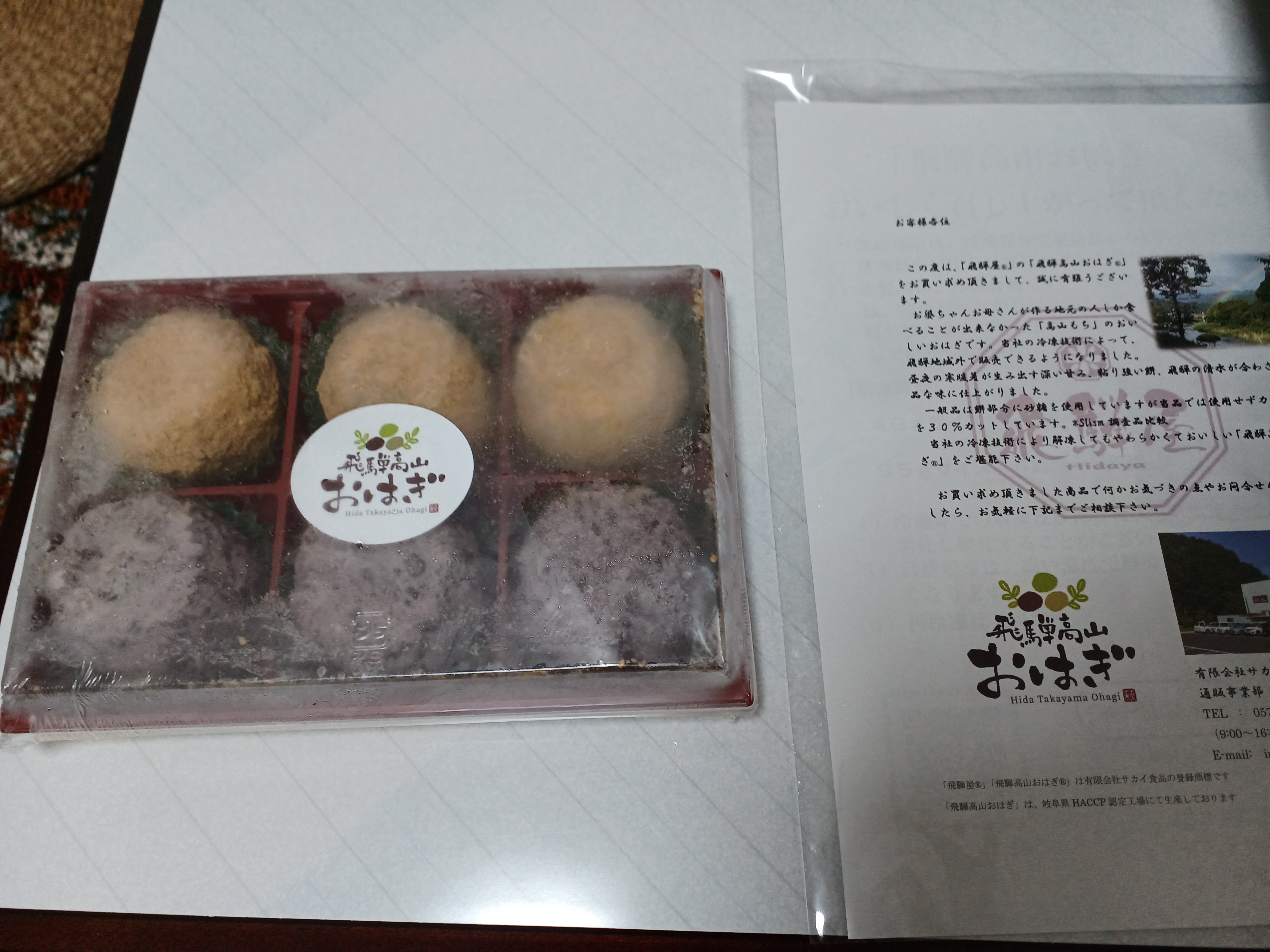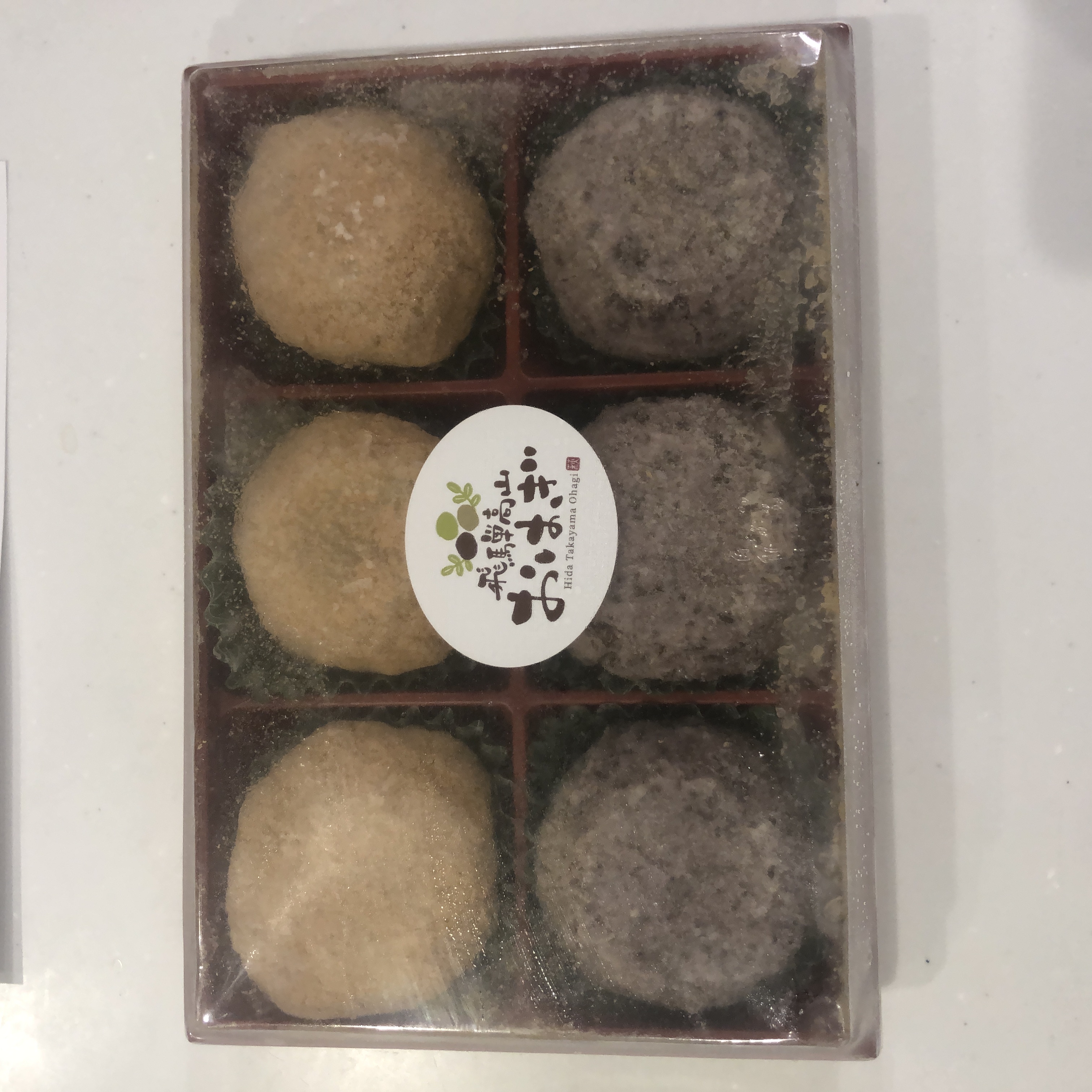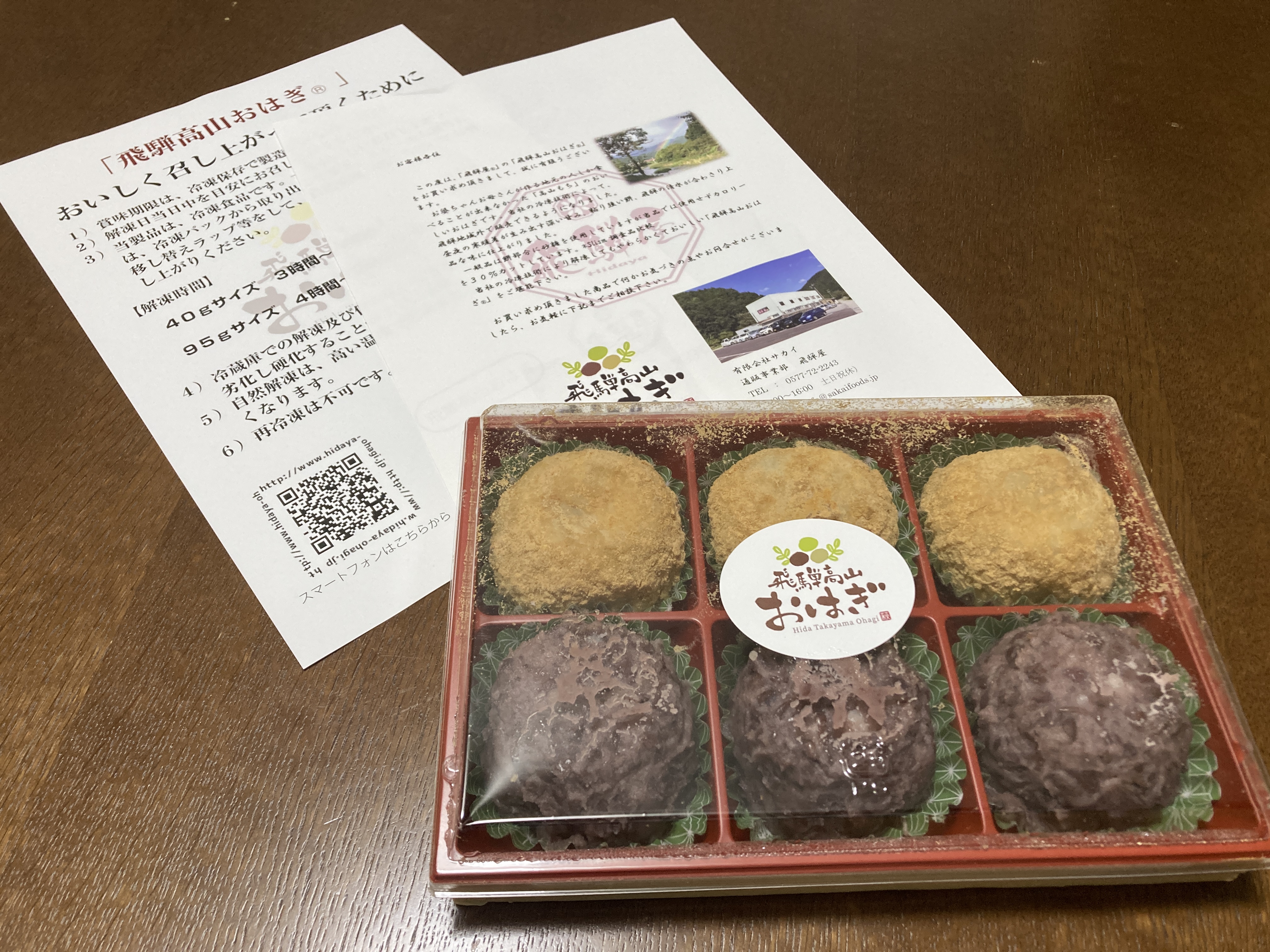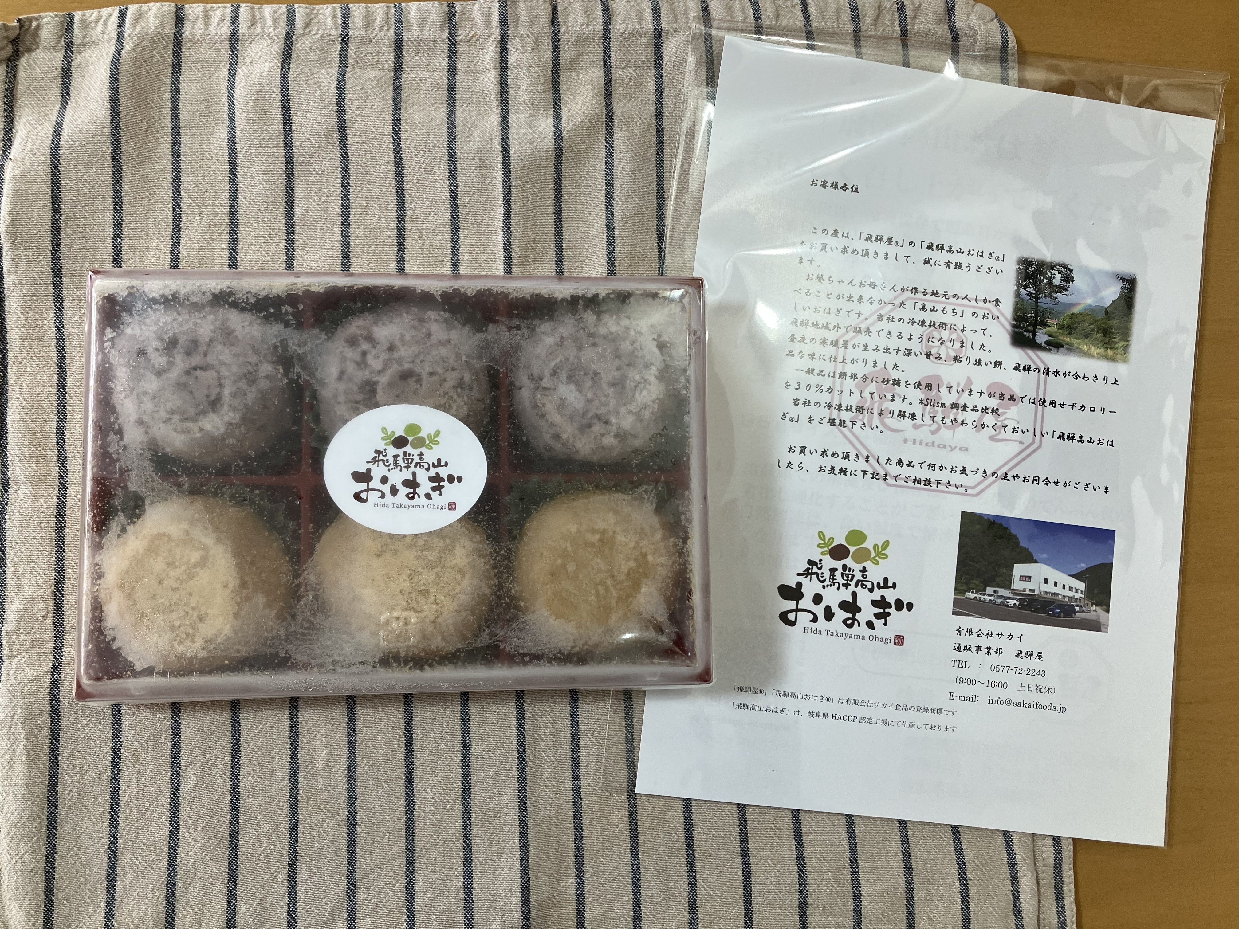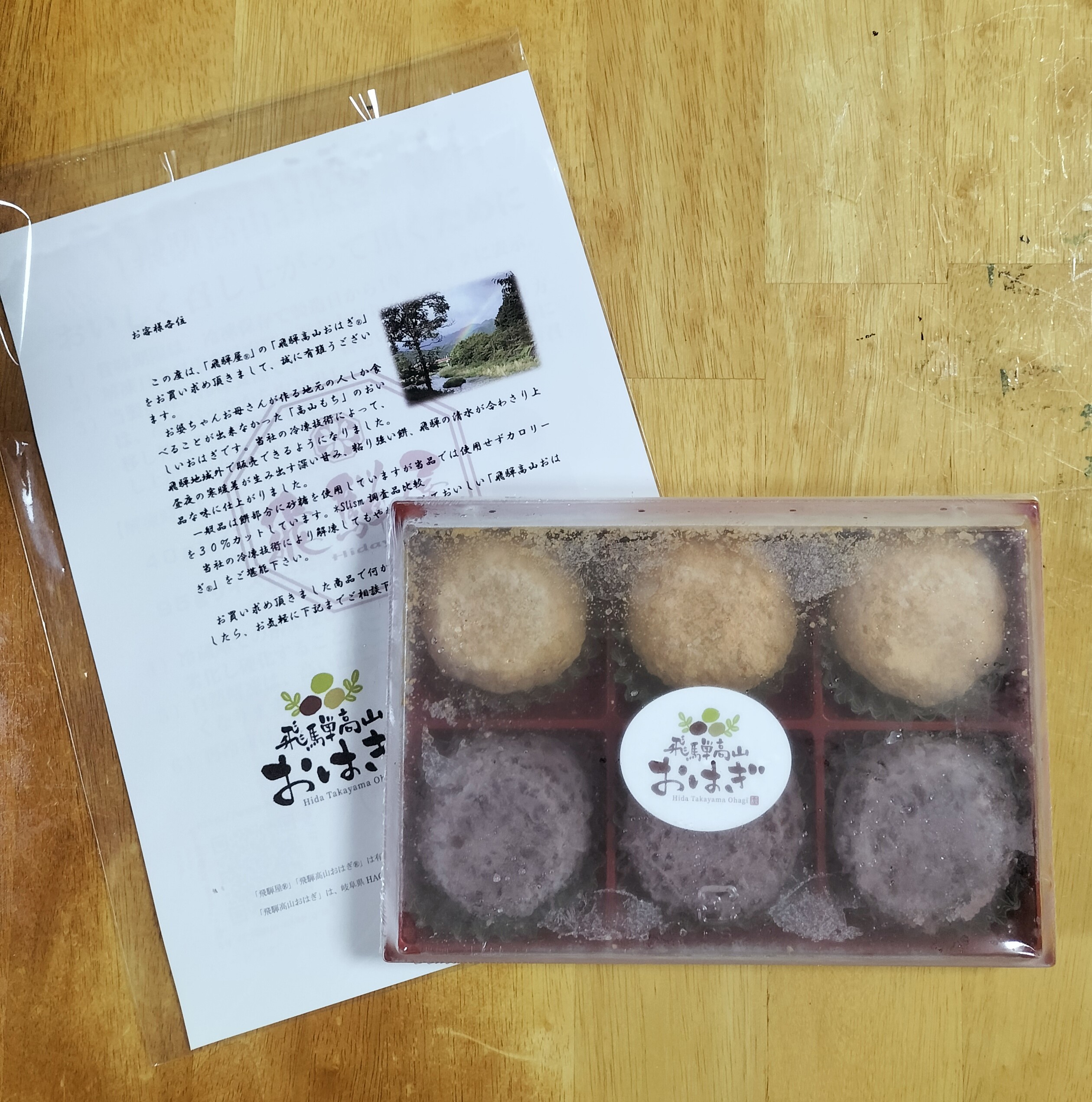 つぶあんと、きなこが3つずつ入った「おはぎ」です。厳選された北海道産小豆を使い、風味豊かな低糖あんこと、上質なきな粉をたっぷりまぶしたおはぎが一度で味わえます。ごはん生地のもち米は、昼夜の寒暖差が大きな飛騨の気候によって育まれたもち米を使用しています。一粒一粒の実がしっかりと締まり、深い甘みと粘り強さが自慢です。米に砂糖を一切使用せず、瀬戸内の海水で作った塩を隠し味として使っています。高山もちが持つ本来の、深い甘みによって、飽きの来ない自然な甘みを楽しめます。専用ボックスに入って届くので、贈り物にもおすすめです。