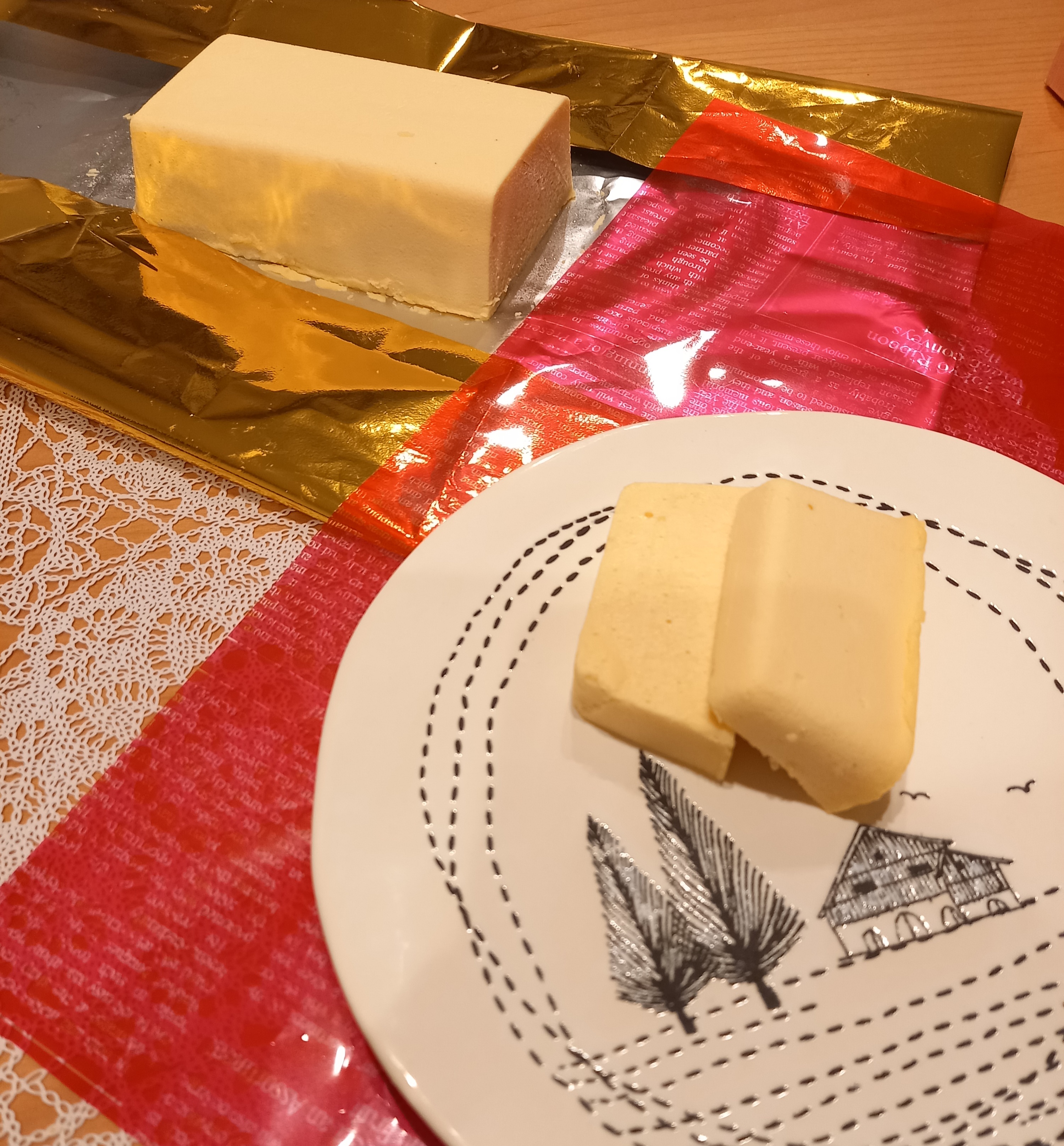 きれいにカットする方法の注意がきが入っており、その通りにカットしたら綺麗に切れます。包丁をお湯で温めてカット、包丁を綺麗にしてまた温めてカットです。手間がかかるように思われる方もいるかもしれませんが、これをすることで特別なお菓子感があり私はわくわくしました。やってみたら手間ではありませんでした。