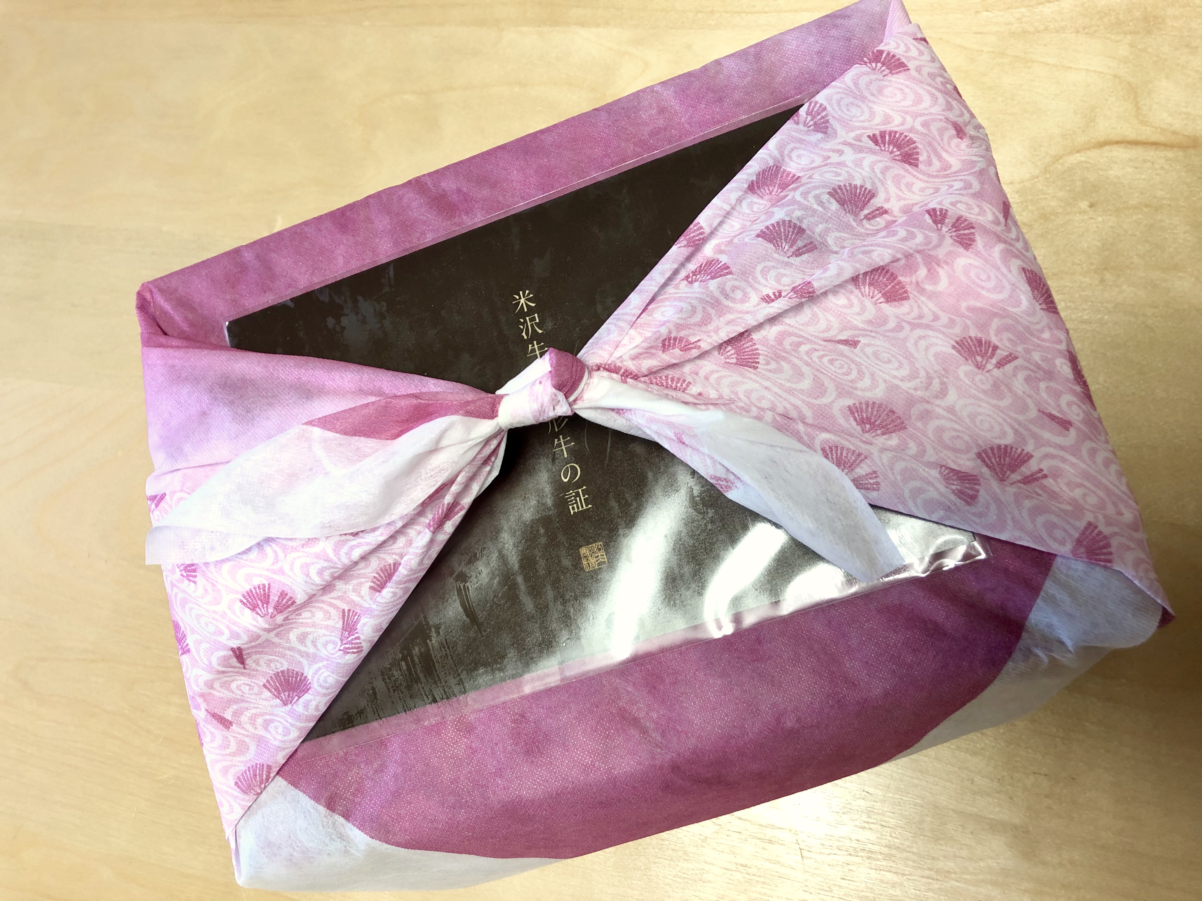 お肉は、高級感あふれる黒化粧箱に、風呂敷で丁寧に包んでお届けいたします。