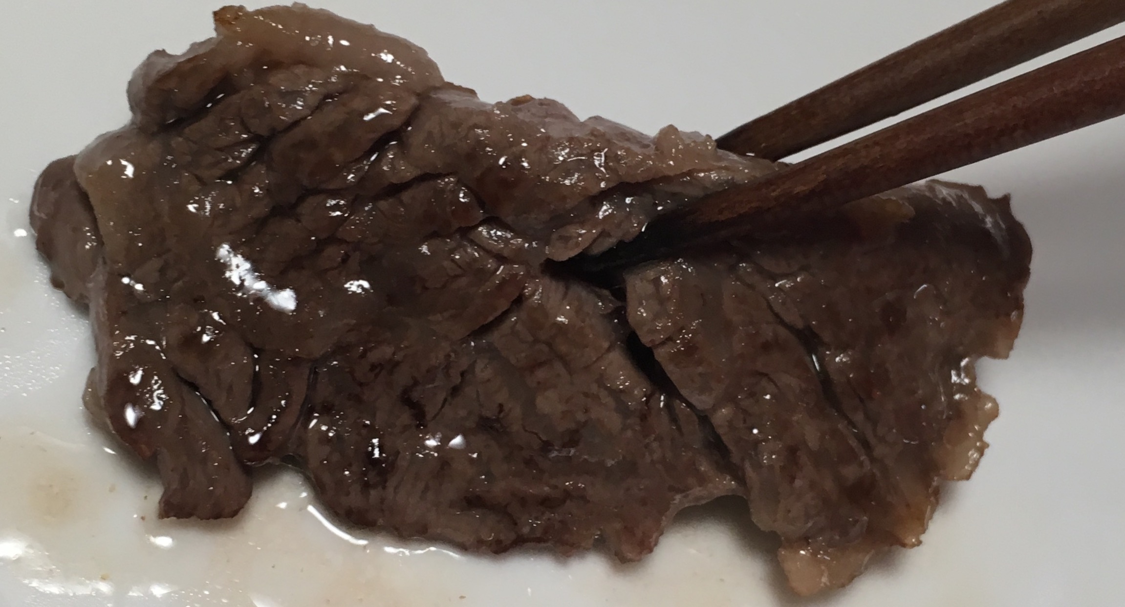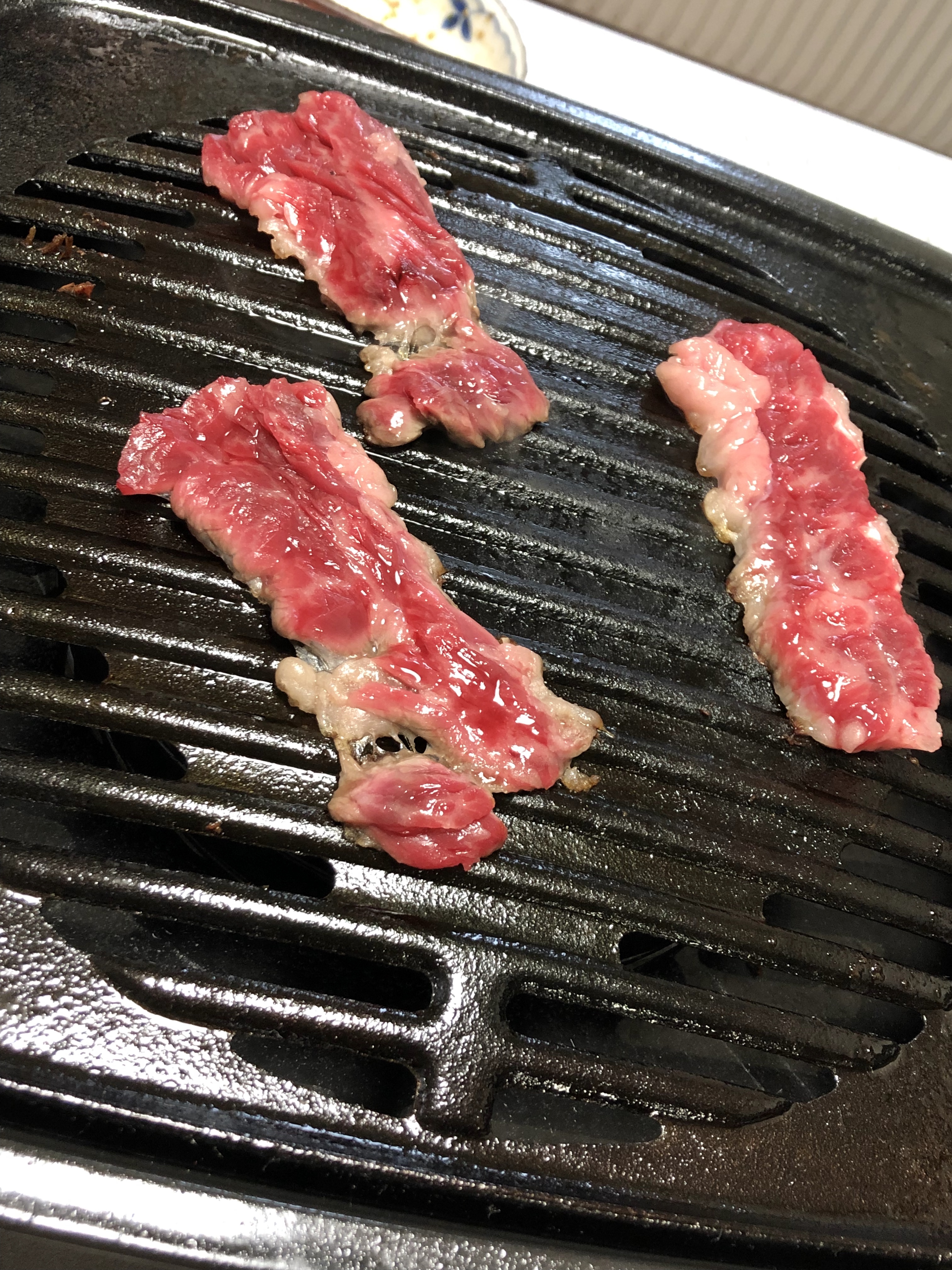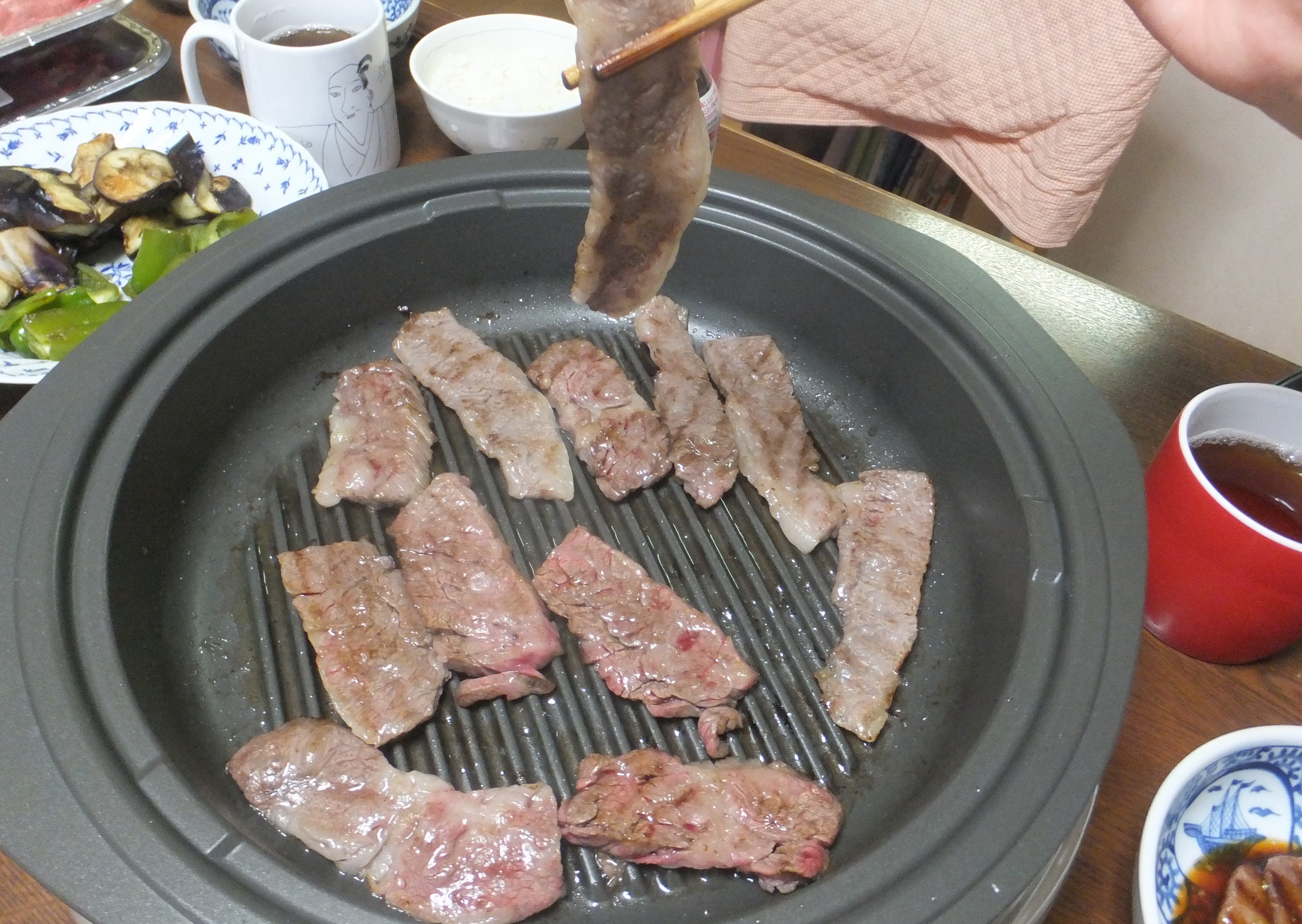 きめ細やかなサシの入った霜降りを両面焼いて、箸で持つとジュワジュワーっと脂がしみ出して・・・・口に入れれば、まずは脂のうまみ・甘みが広がり、そして肉の弾力、うまみ、と四重奏を奏でながら口中に広がっていきました。