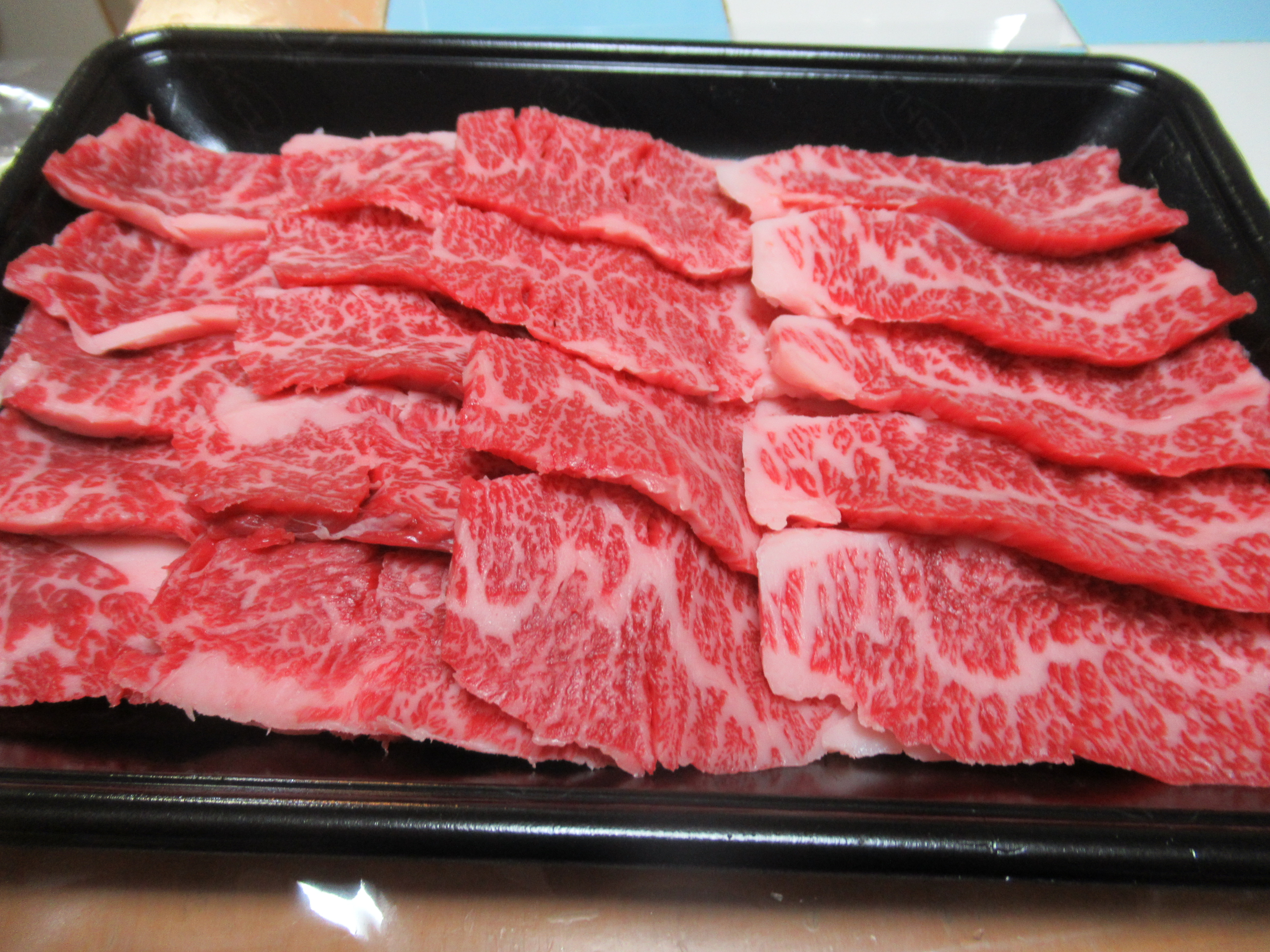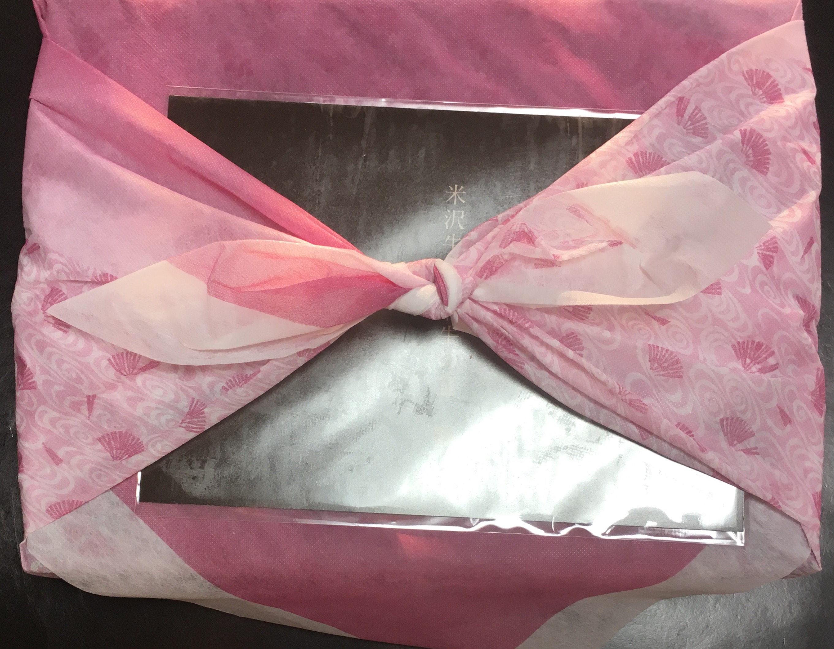 薄紫の風呂敷に包まれた黒い箱から顔を出したお肉は・・・きれいな霜降りでピンク色で、見るからに極上!