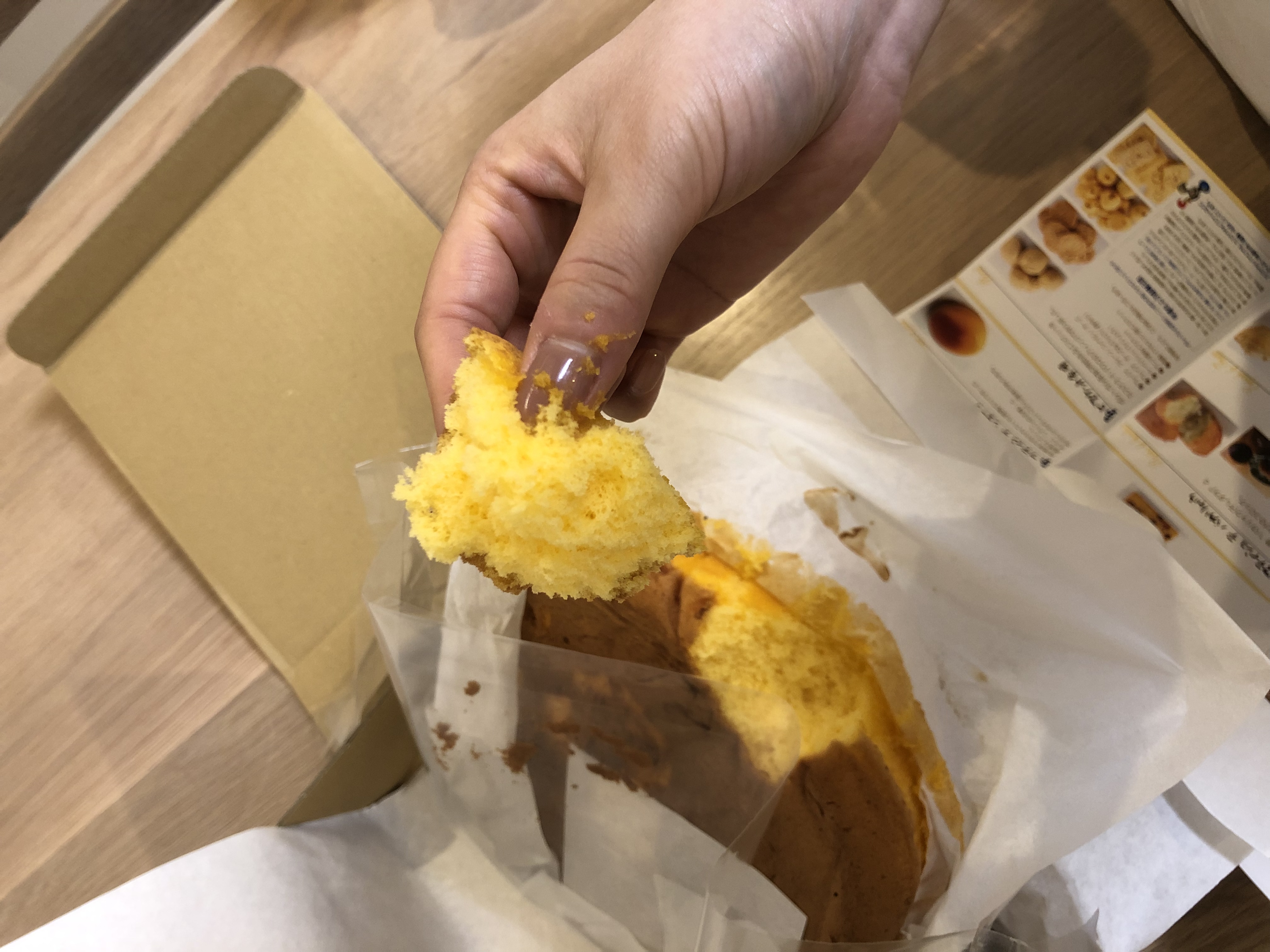 そして写真のように手で食べてみたところ、ボロボロこぼれない!ベタベタしない。日本のカステラって手で食べたらボロボロベタベタこぼれるイメージ?でしたがこれは良い!出先でのホームパーティとかでも良さそう!